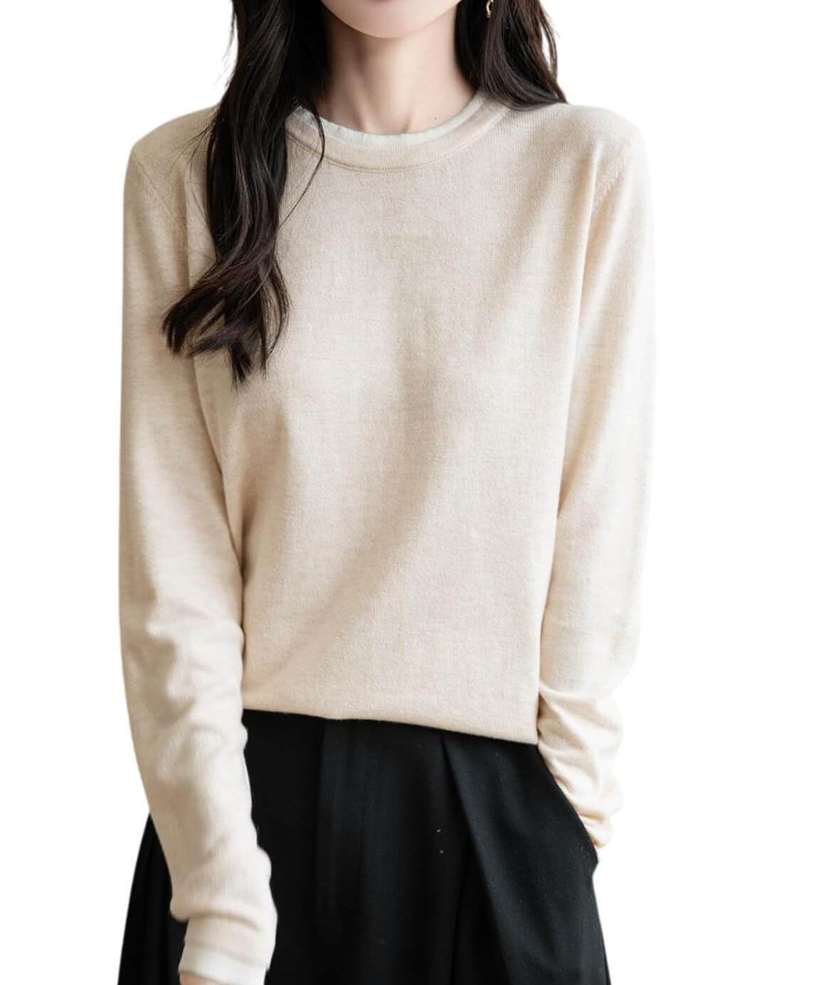 Merino Wool Blend Color Block Fake Two-Piece Crewneck Knit Top