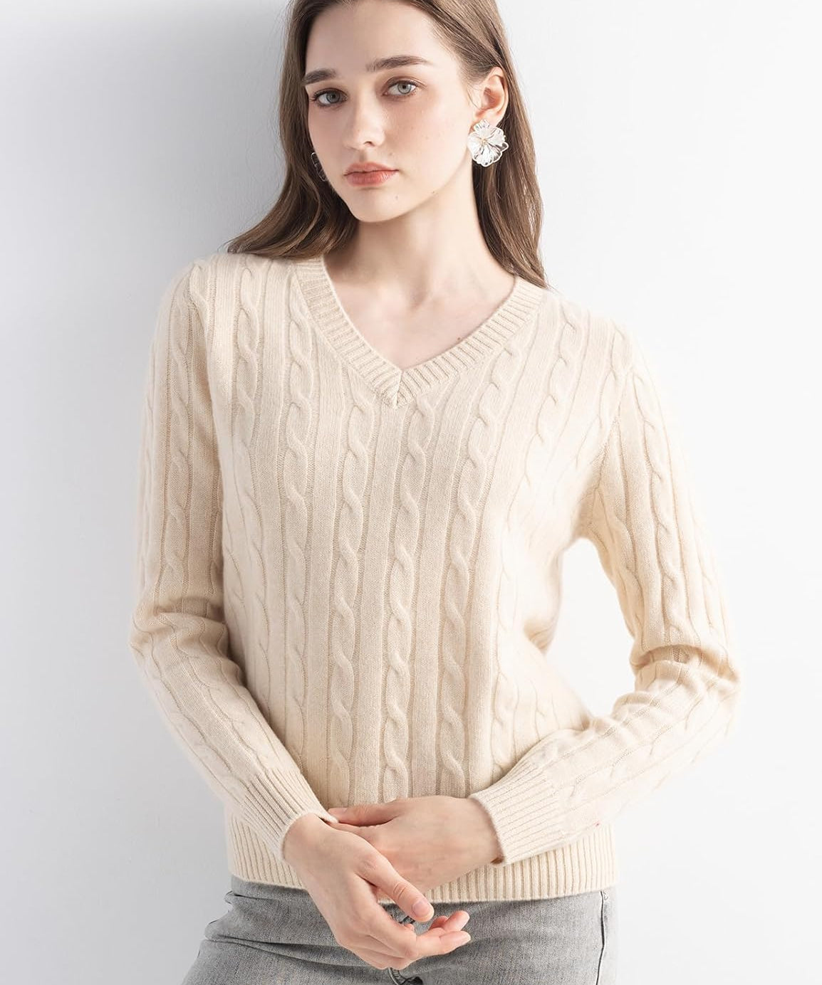 100% Cashmere V-Neck Cable Knit Sweater