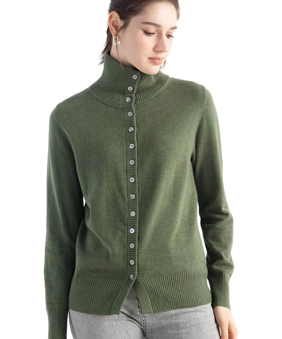 Merino Wool Blend Mock Neck Buttoned Knit Cardigan