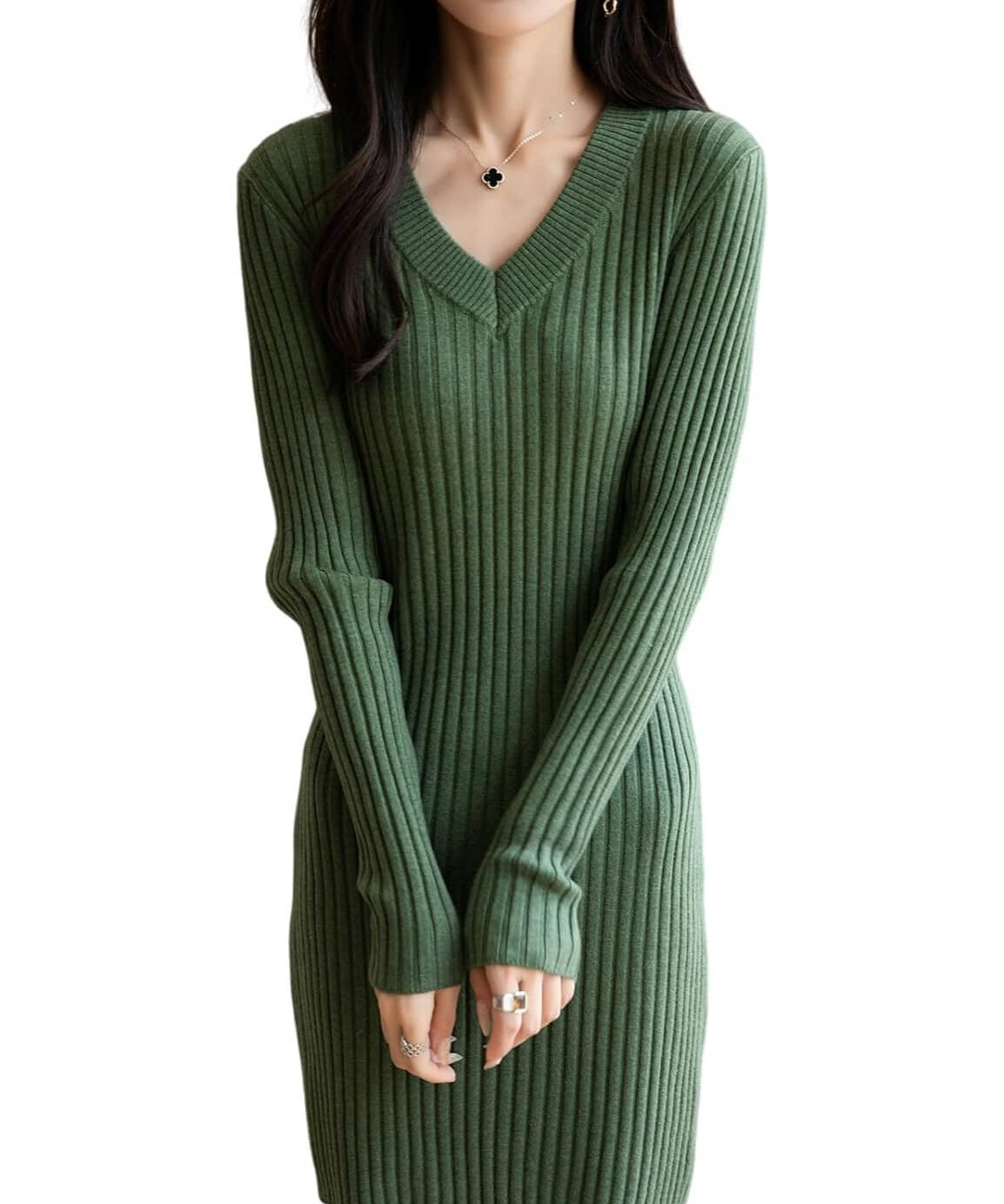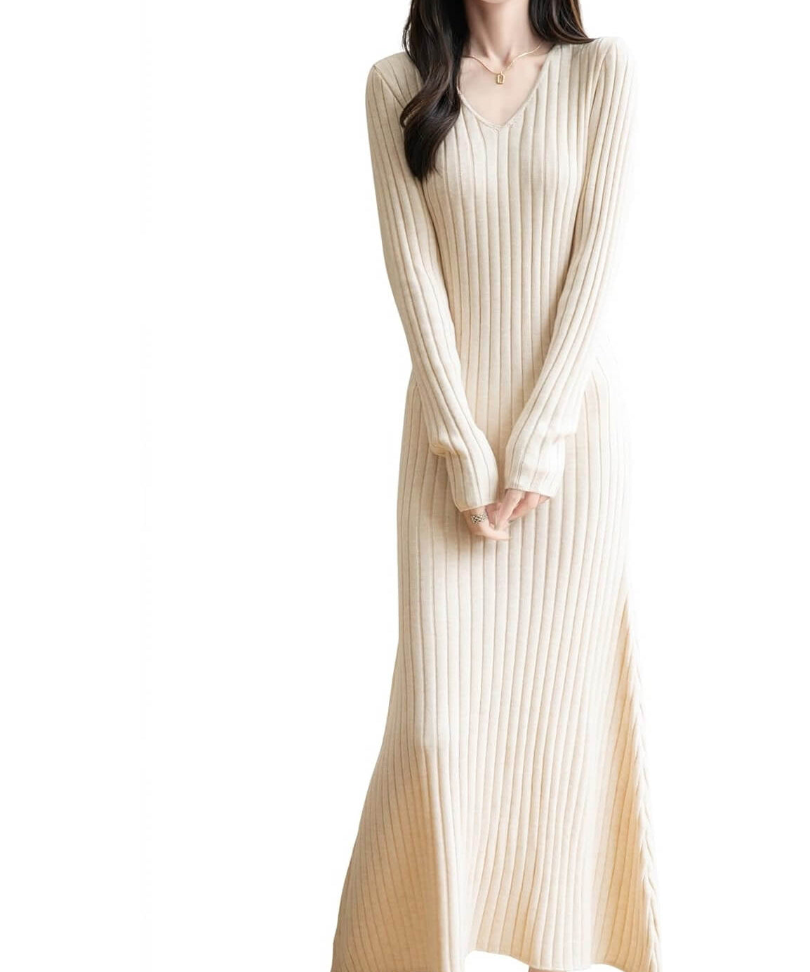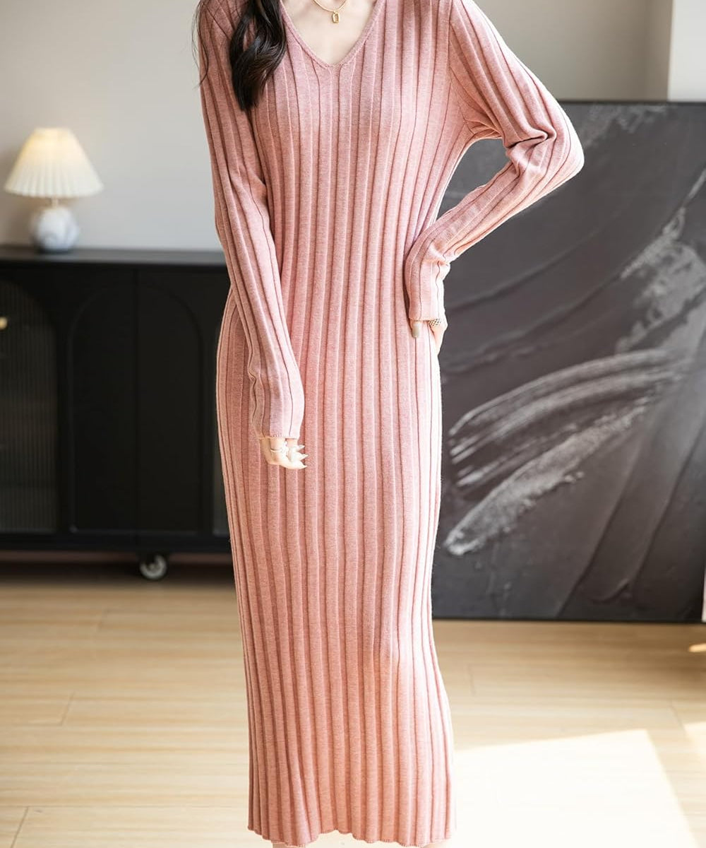 Merino Wool Blend V-Neck Ribbed Knit Long Sweater Dress
