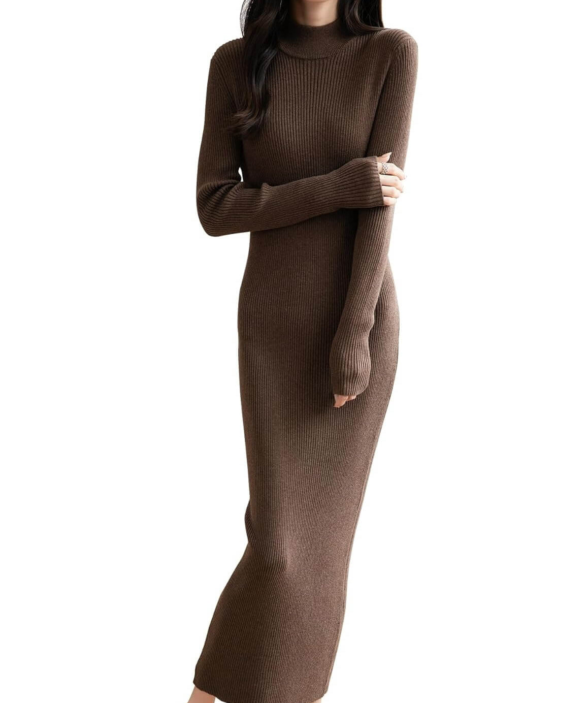 Merino Wool Blend Mock Neck Ribbed Knit Sweater Dress