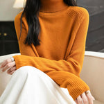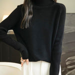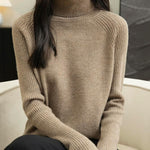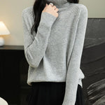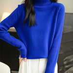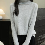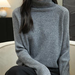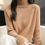 Classic raglan fit with natural stretch for freedom of movement. Lightweight yet warm, this turtleneck sweater drapes smoothly for a flattering silhouette. Perfect for layering under coats or wearing solo for a casual, polished look.
