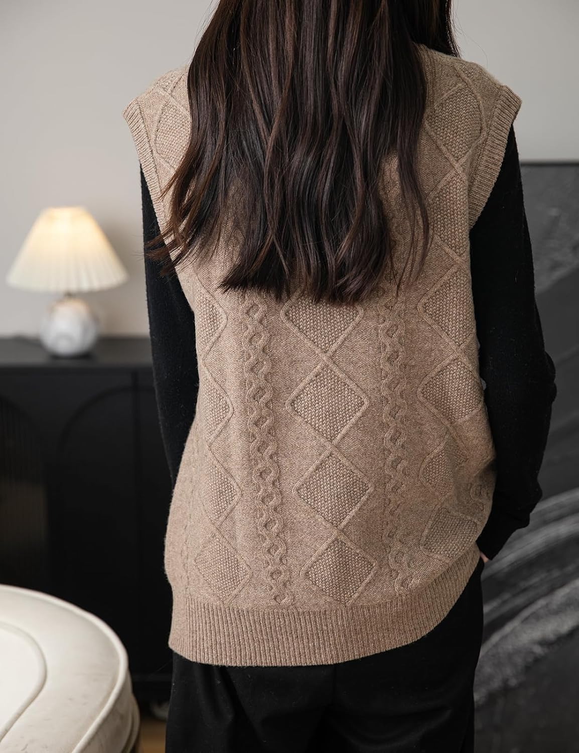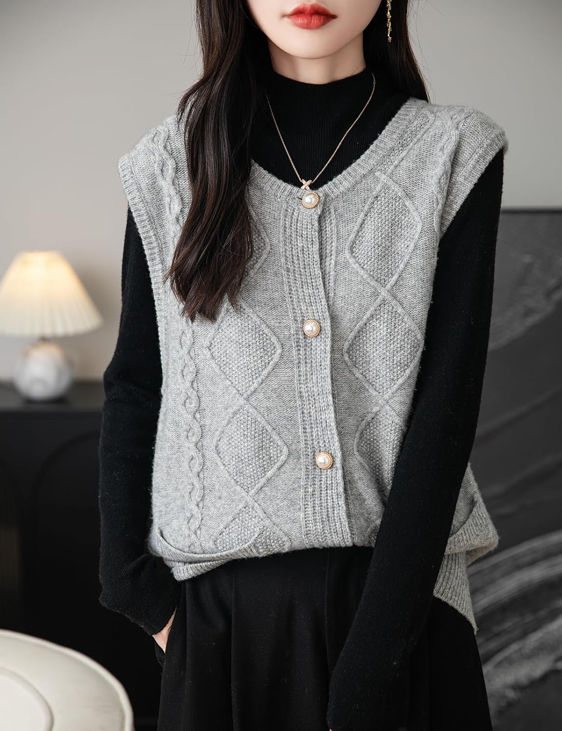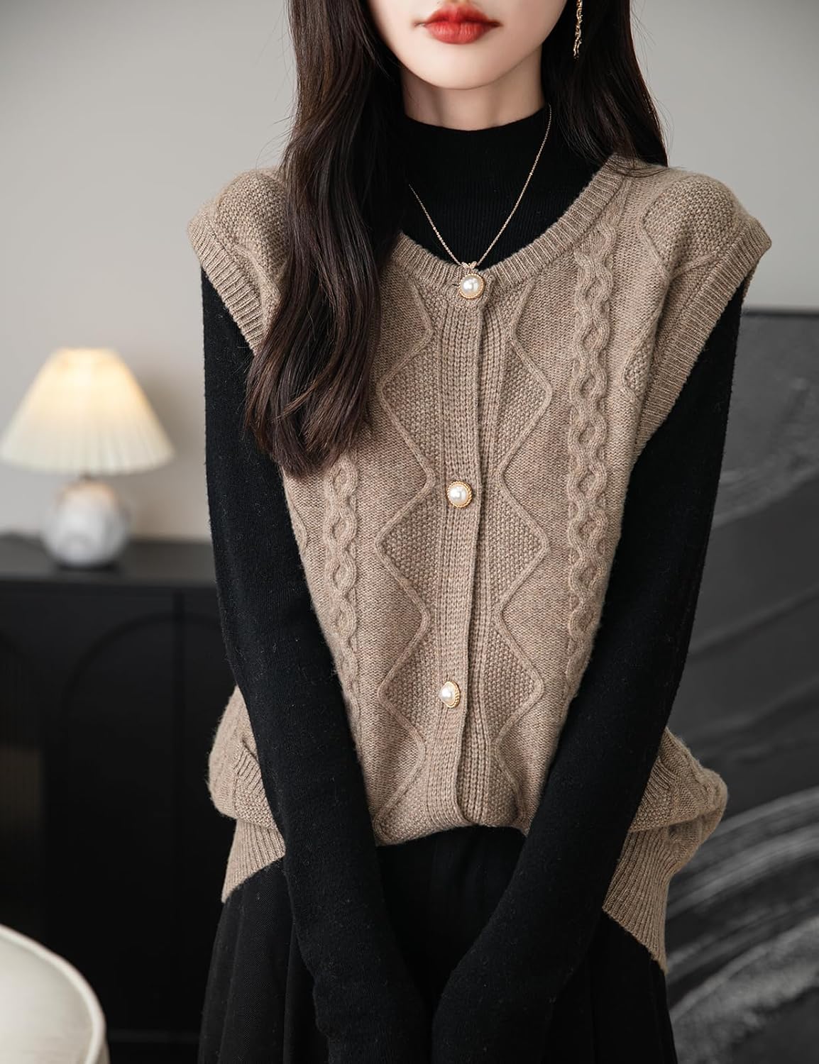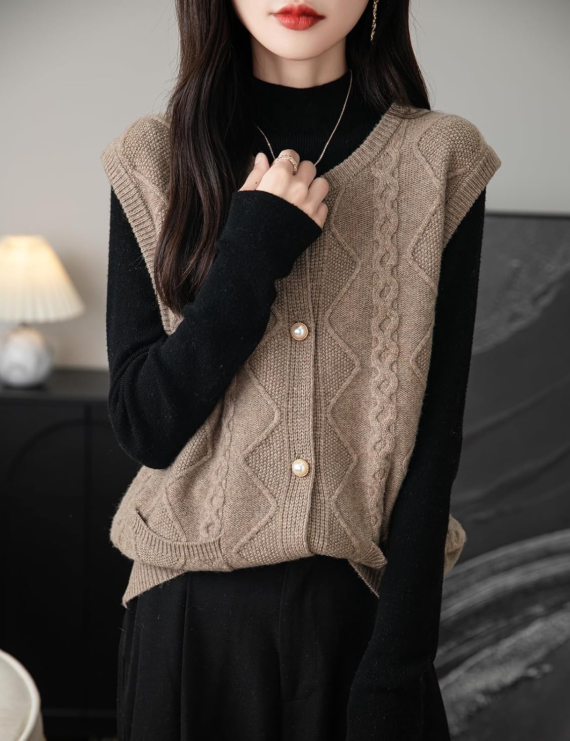 This cable-knit vest is super luxurious. The merino wool is incredibly soft, warm, and hypoallergenic if you're sensitive to the dyes and chemicals used in synthetic fibers. The knitted pattern is beautiful, the color is elegant, and there are many little touches like the buttons.