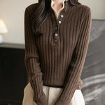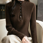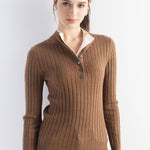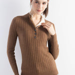 The material is very soft to the touch and I like the style of the mock collar. The color is a true brown, which has been hard to find.It could be worn either casual or dressy. The quality of the manufacure is good.One star off for the sizing. Ordered my usual size, and should have gone one up. This size is very form fitting.