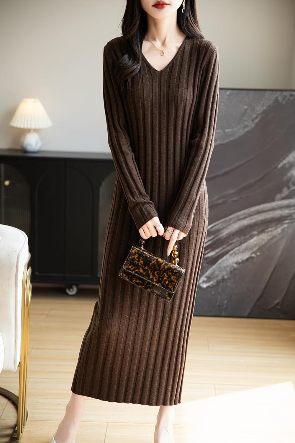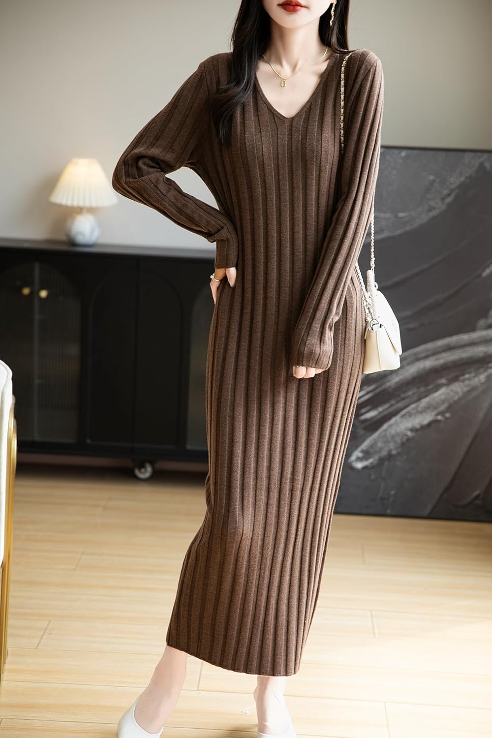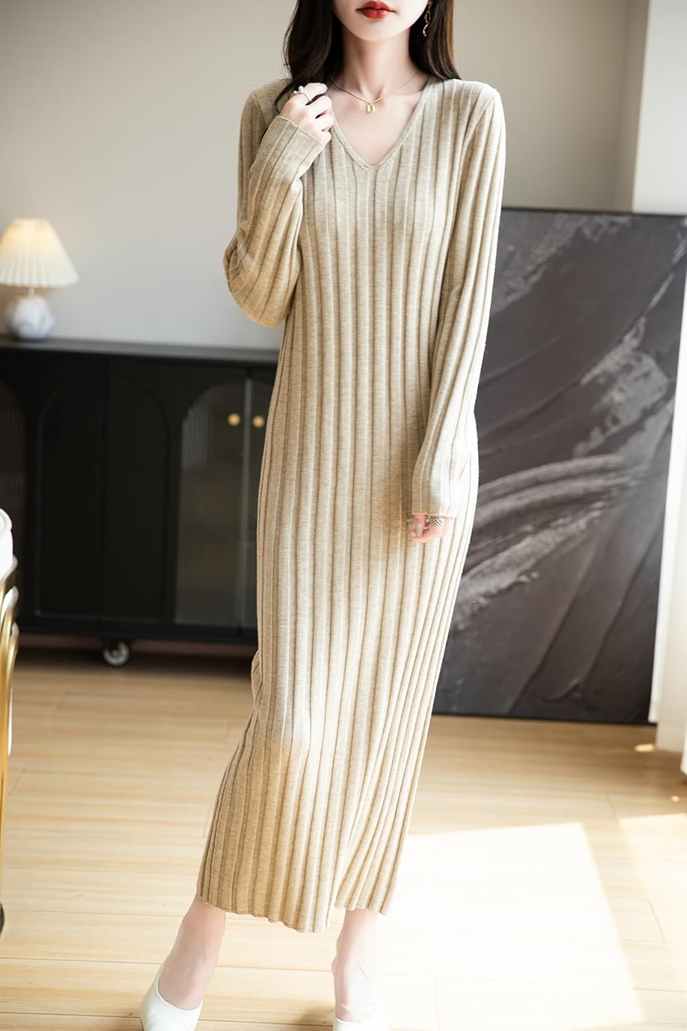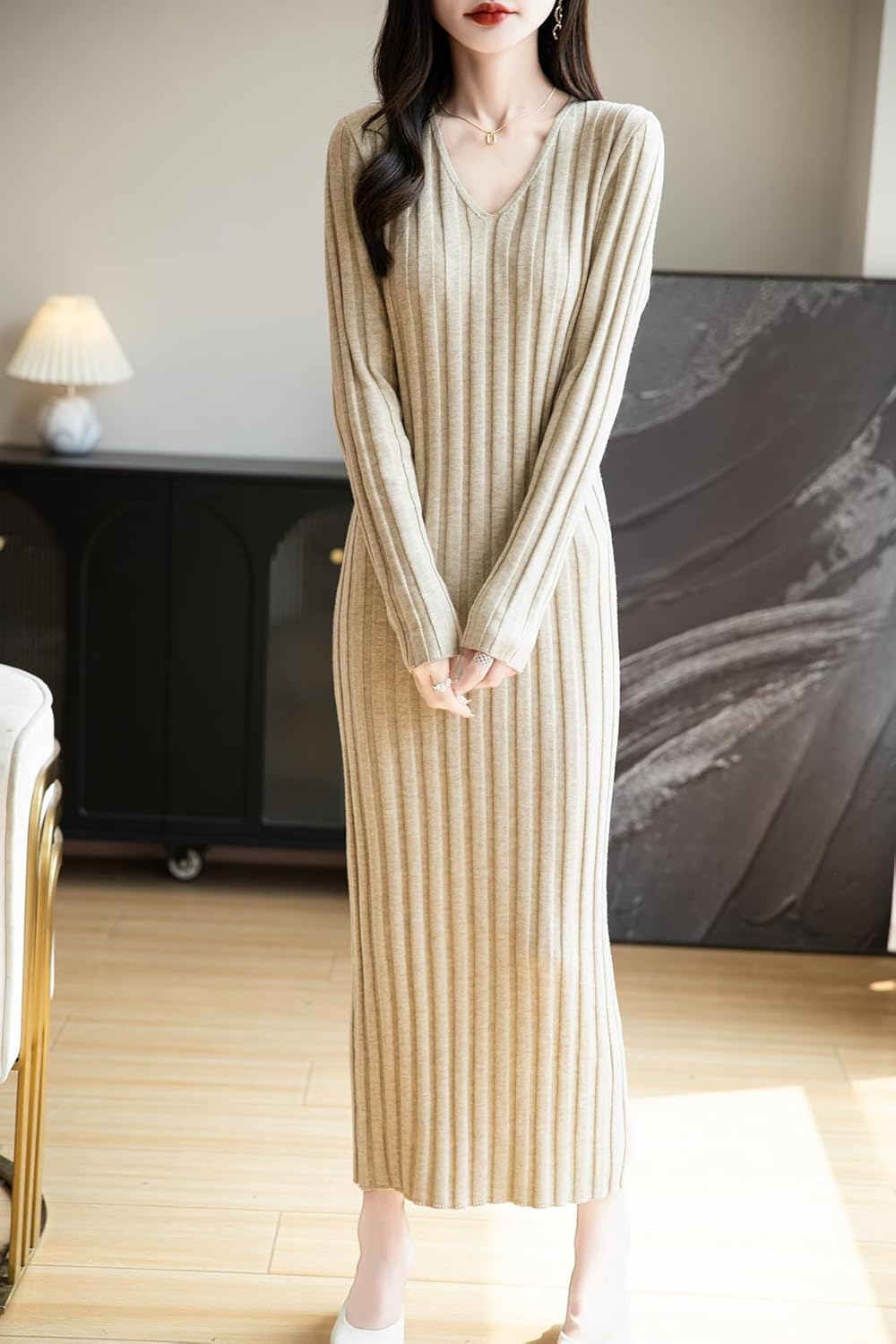 Ciovkis, Women's Merino Wool Blend Long Sweater Dress Fashion 2025 Spring Fall Casual V-Neck Long Sleeve Ribbed Knit Dress.This dress looks just like the product photos. It's a ribbed knit, lightweight yet warm, stretchy, and form-fitting. I ordered the XL, and it fits me just like it does on the model. I'm 5'5", 160 lbs, with a 40DD bust, 30" waist, and 40" hips. I absolutely love this dress—it can be dressed up or down, perfect for layering or wearing on its own. It's very well-made; I washed it on delicate, line dried it, and it came out perfectly.