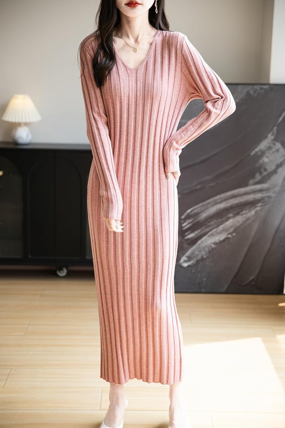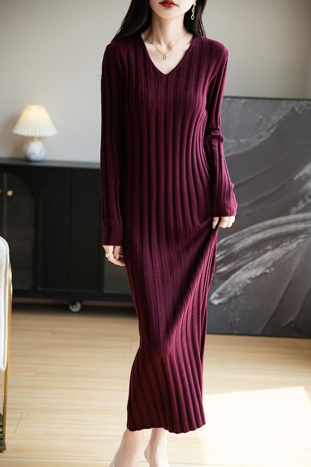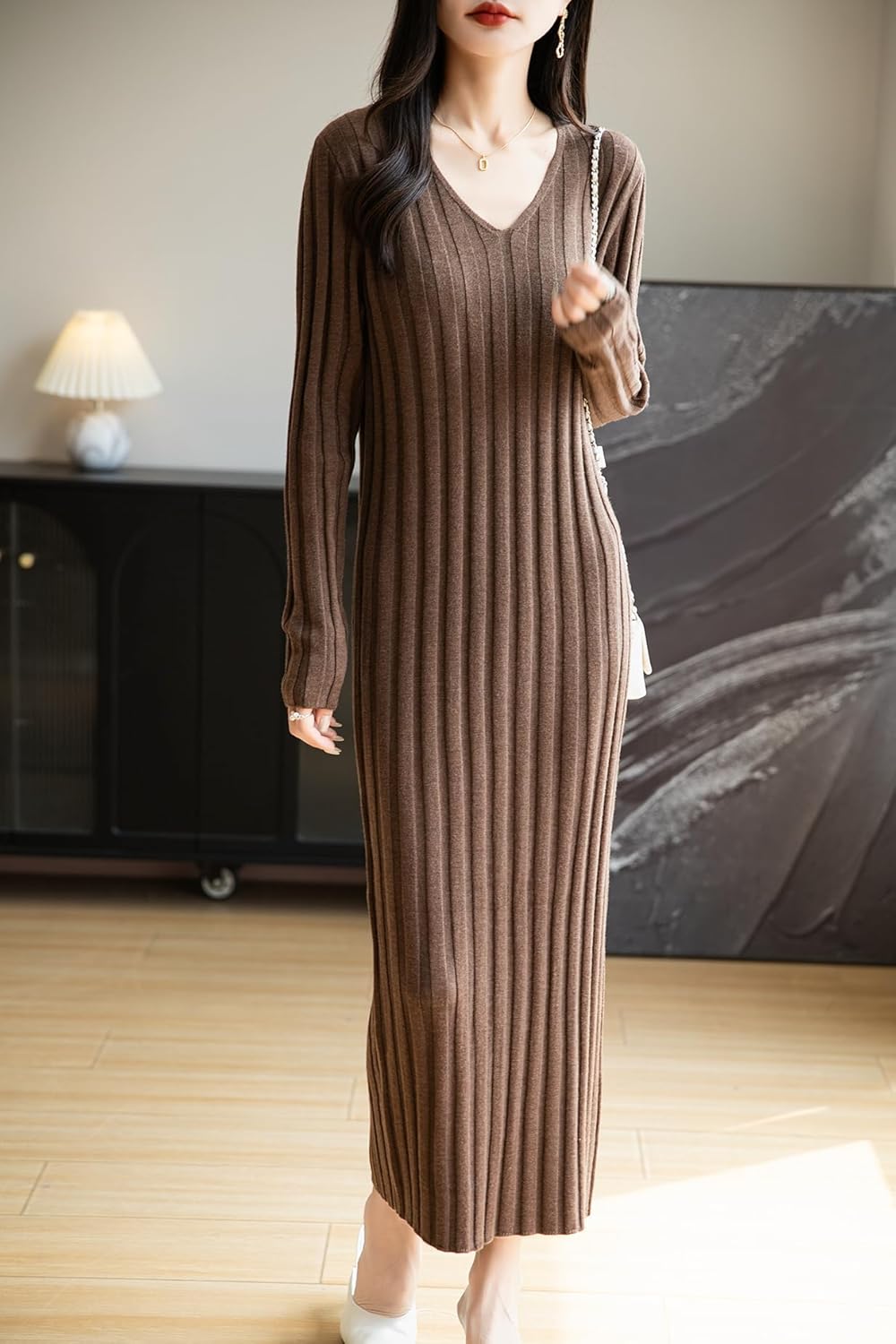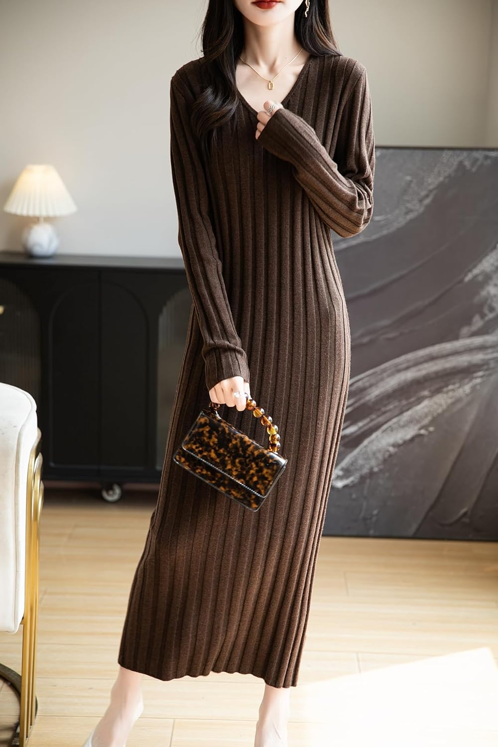 Ciovkis, Women's Merino Wool Blend Long Sweater Dress Fashion 2025 Spring Fall Casual V-Neck Long Sleeve Ribbed Knit Dress.This dress looks just like the product photos. It's a ribbed knit, lightweight yet warm, stretchy, and form-fitting. I ordered the XL, and it fits me just like it does on the model. I'm 5'5", 160 lbs, with a 40DD bust, 30" waist, and 40" hips. I absolutely love this dress—it can be dressed up or down, perfect for layering or wearing on its own. It's very well-made; I washed it on delicate, line dried it, and it came out perfectly.