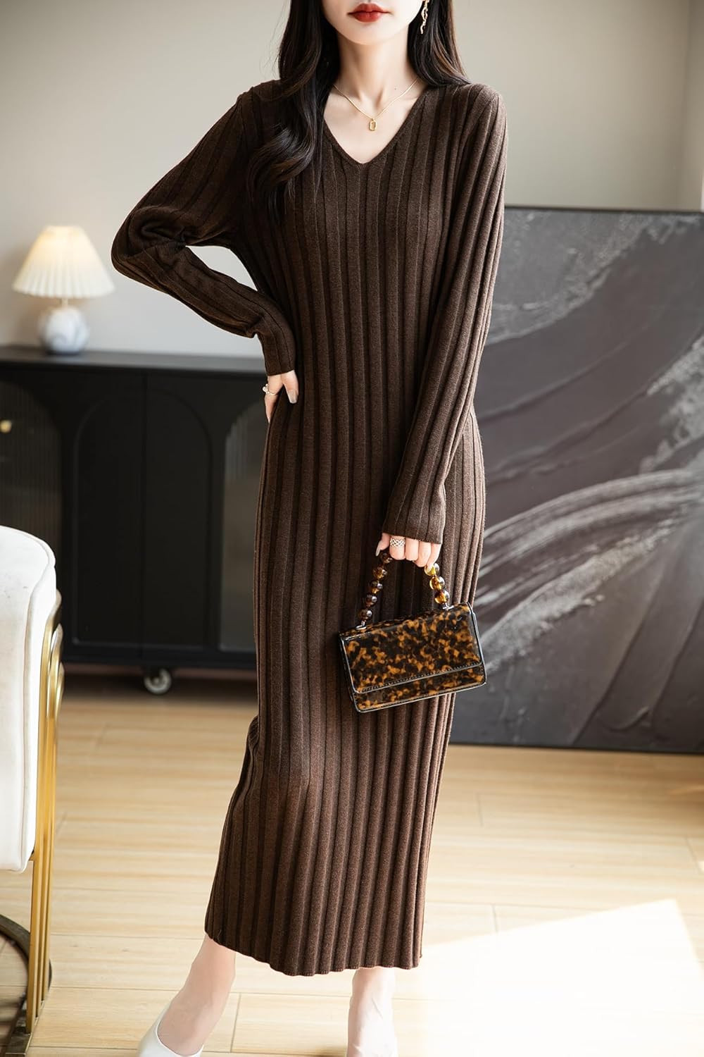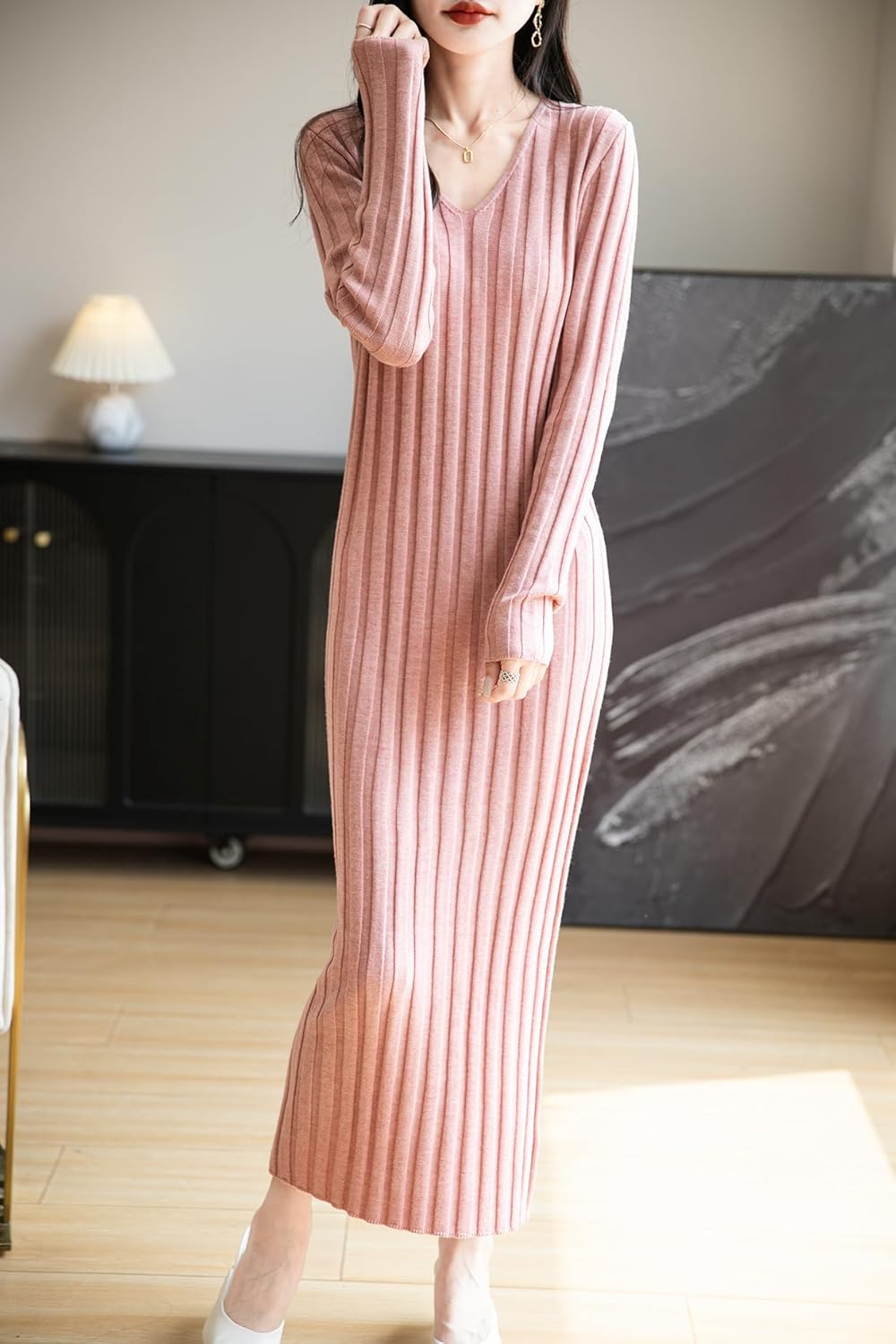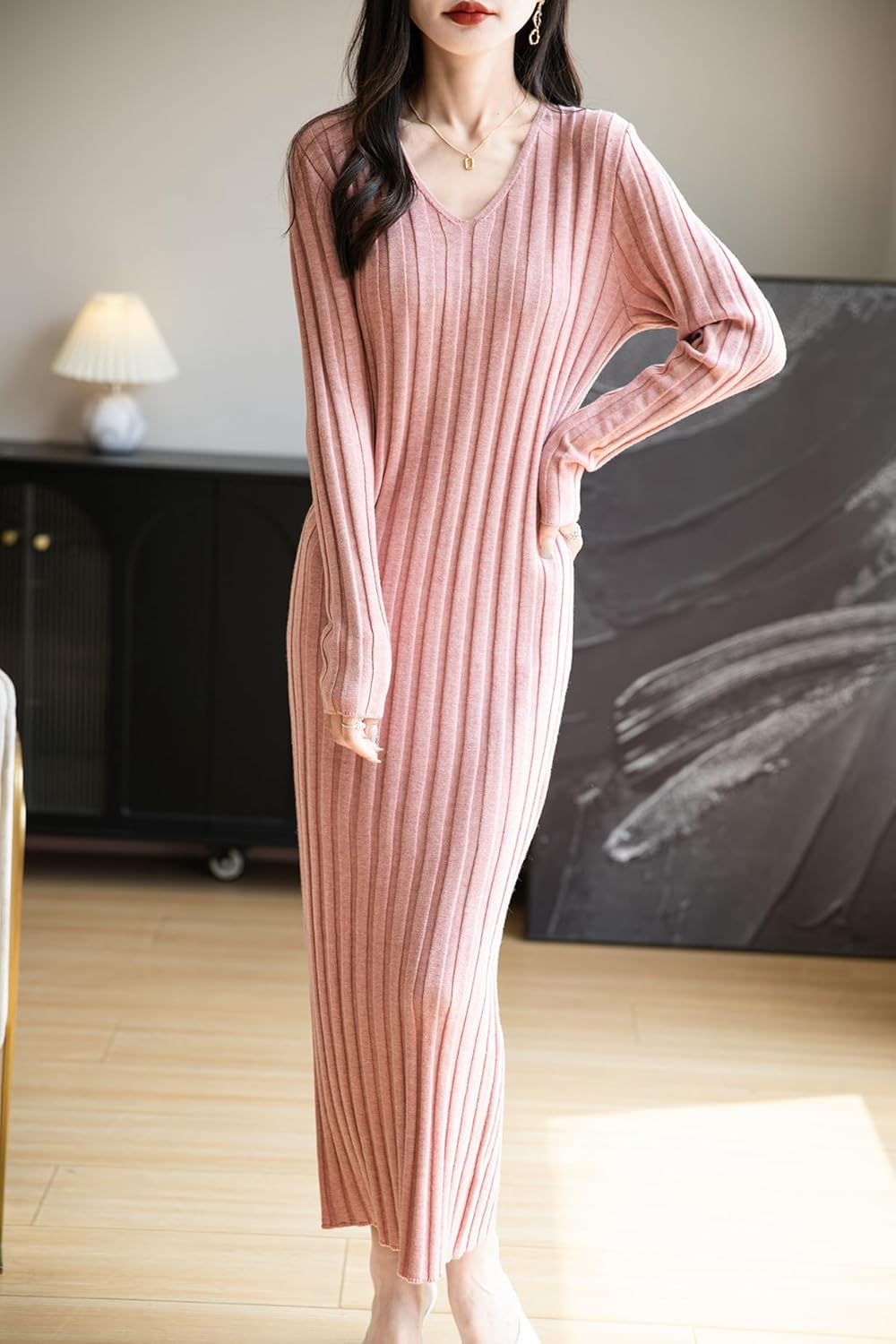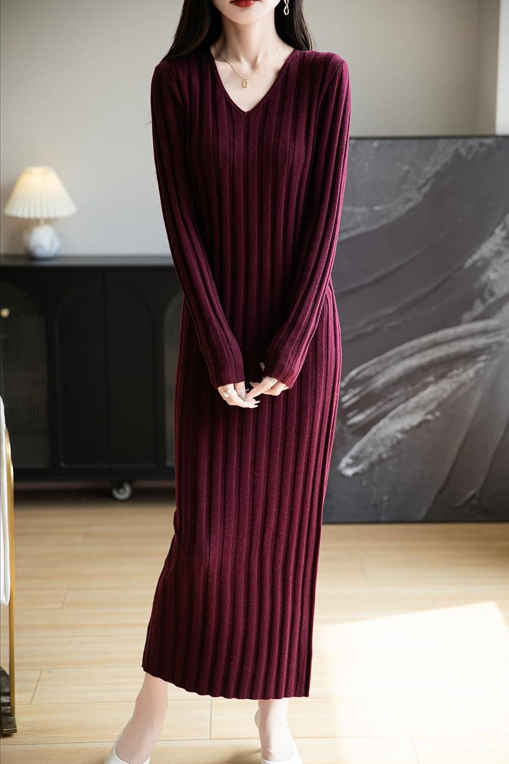 Ciovkis, Women's Merino Wool Blend Long Sweater Dress Fashion 2025 Spring Fall Casual V-Neck Long Sleeve Ribbed Knit Dress.This dress looks just like the product photos. It's a ribbed knit, lightweight yet warm, stretchy, and form-fitting. I ordered the XL, and it fits me just like it does on the model. I'm 5'5", 160 lbs, with a 40DD bust, 30" waist, and 40" hips. I absolutely love this dress—it can be dressed up or down, perfect for layering or wearing on its own. It's very well-made; I washed it on delicate, line dried it, and it came out perfectly.