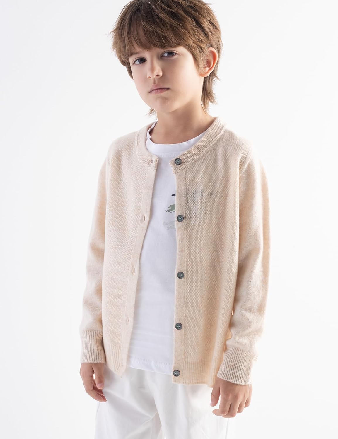 男の子100%メリノウールカーディガン秋の冬のファーストラインレディは乗組員の首の長袖シームレスニットセーターを着用します