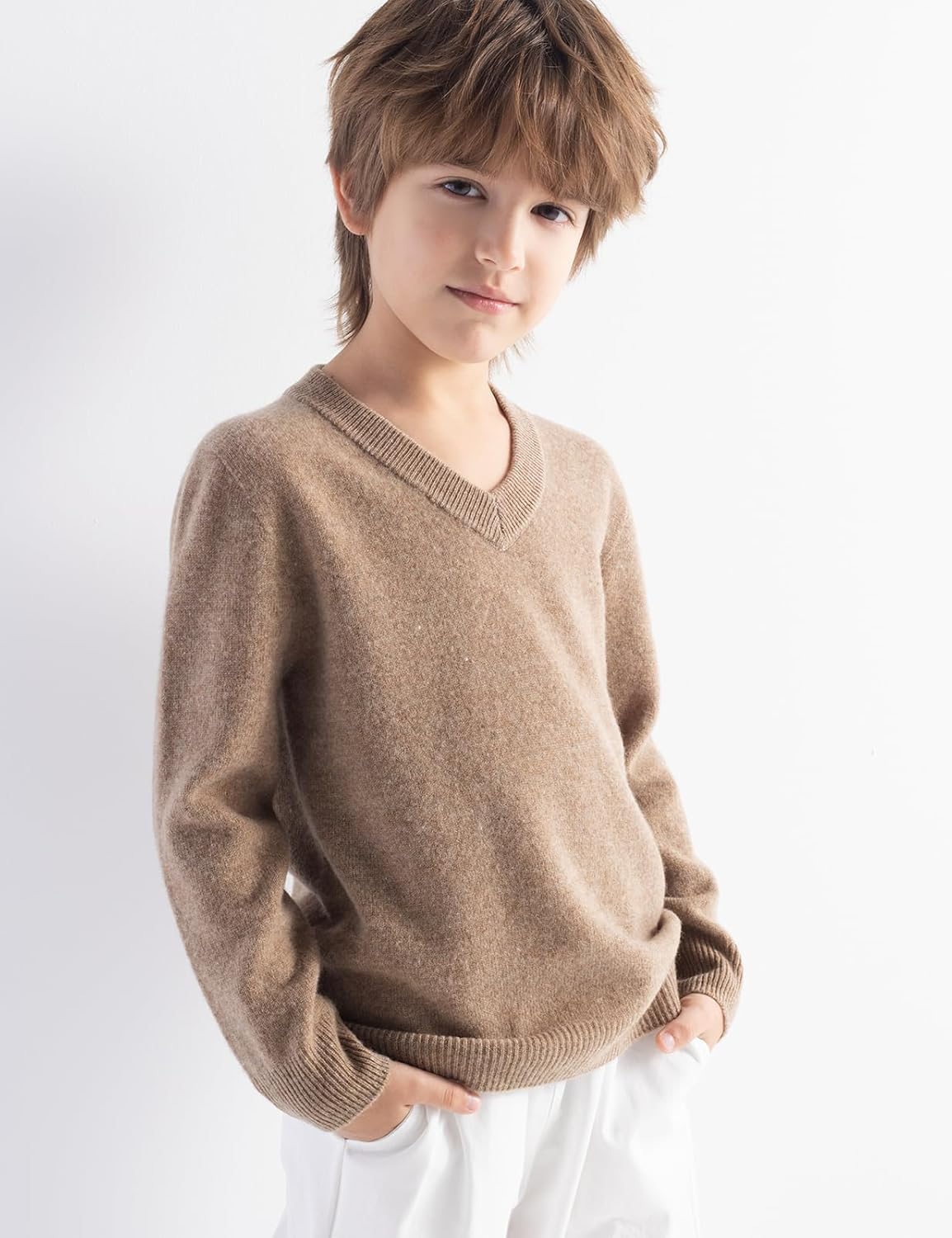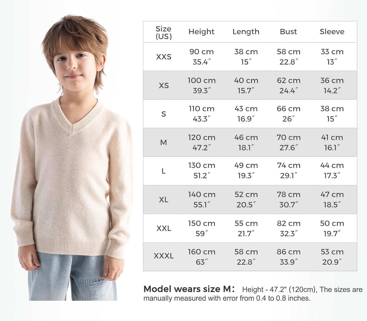 The quality of this merino wool sweater material is incredibly soft against the skin, it's beautifully seamless, and it has a great, classic V-neck look. It feels like a high end product.The sizing is a little unique. I bought a Small for my 6 year old son who is around 40 lbs. The arms were a perfect fit, both in length and slimness. The only note is that the torso runs a bit short on him. It's still wearable, but it's a cropped fit rather than a standard length.This isn't necessarily a deal-breaker, it just means it layers best over a longer undershirt. For the fantastic feel and quality of the wool itself, it's still a great value. Just be aware of the shorter torso length when you order. Would recommend, especially for kids with a slimmer build.