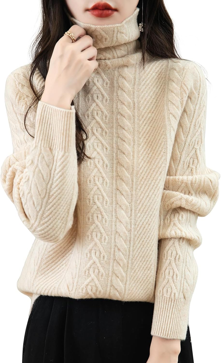 Chanyarn Women's 100%Merino Wool Turtleneck Seater2025秋冬の長袖ソリッドケーブルニットプルオーバーセーター