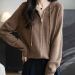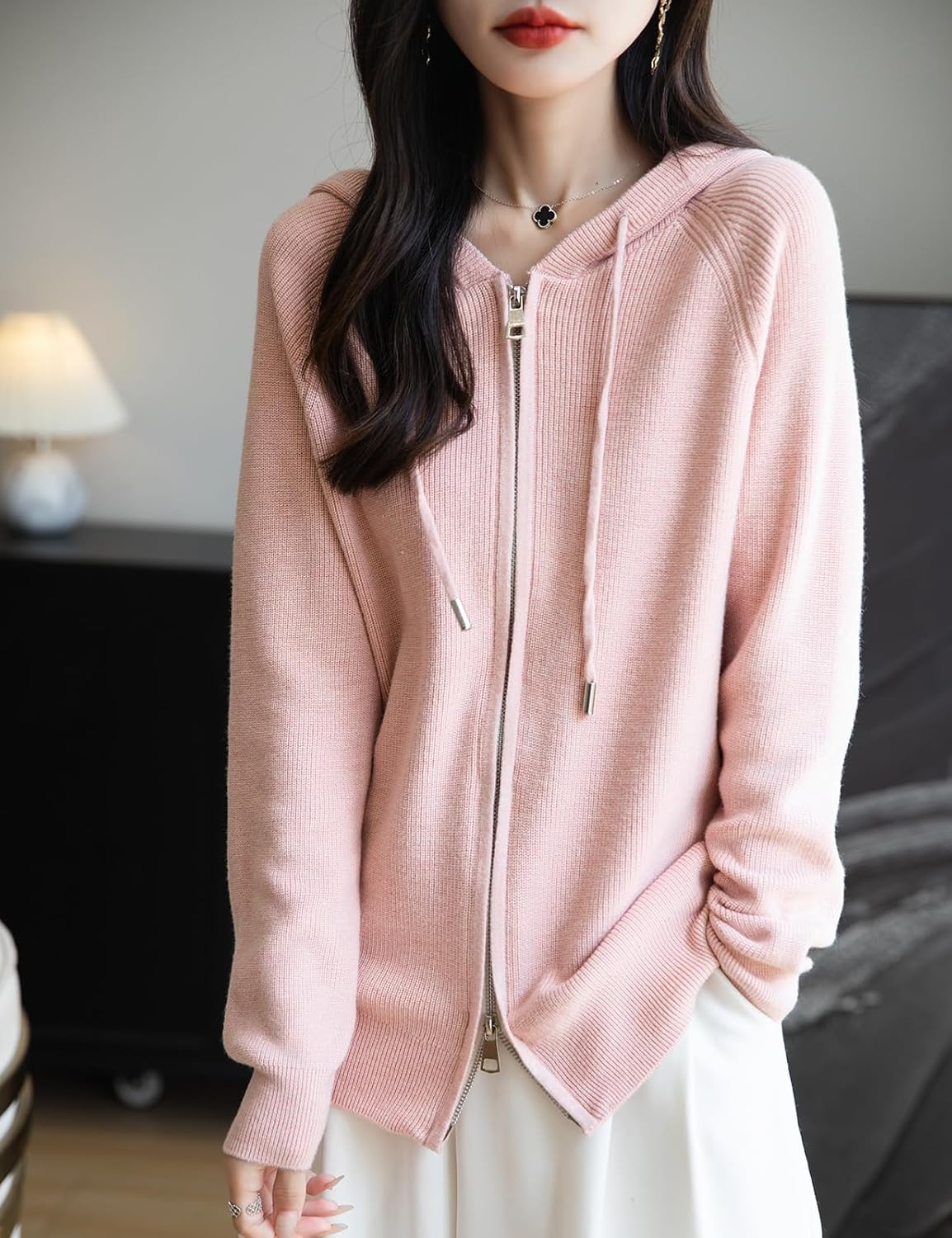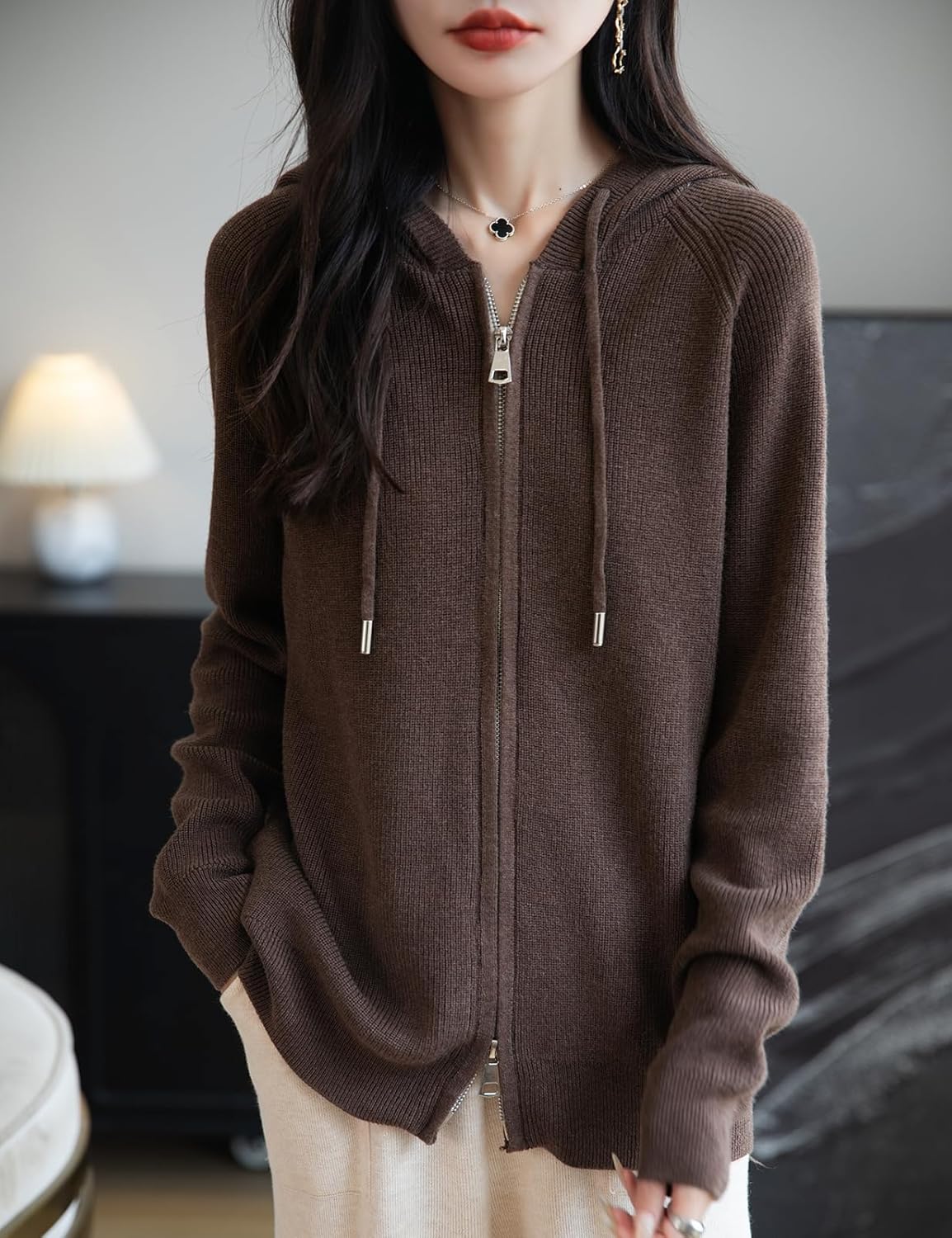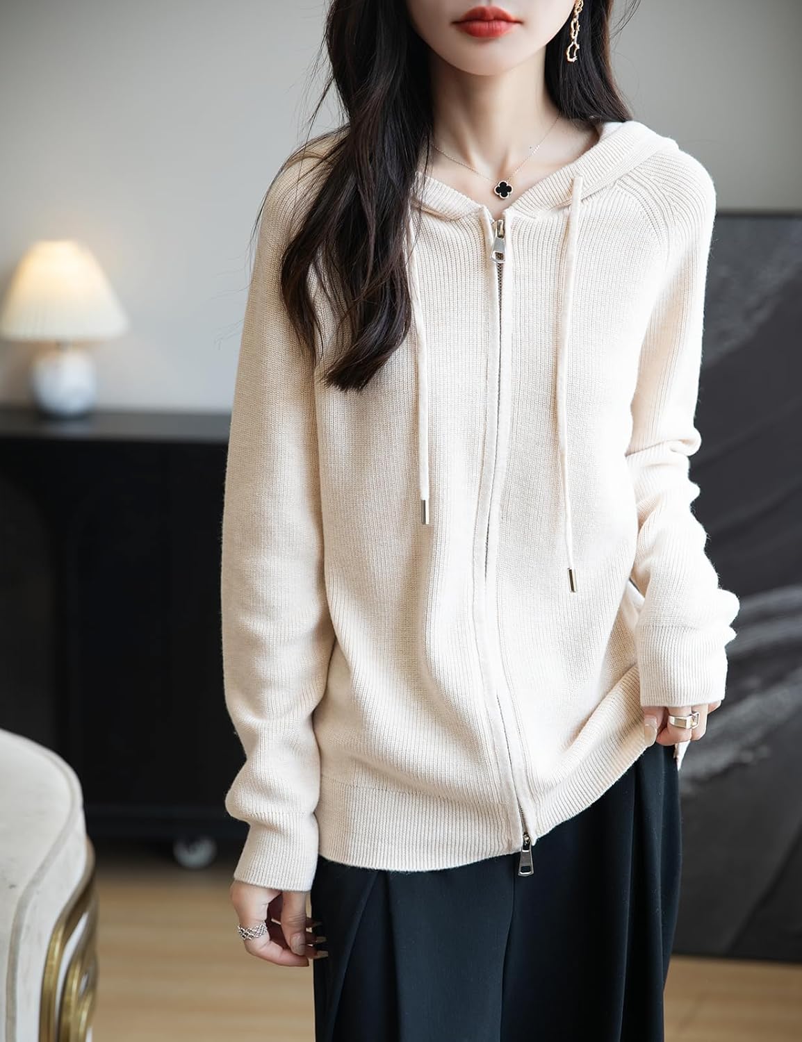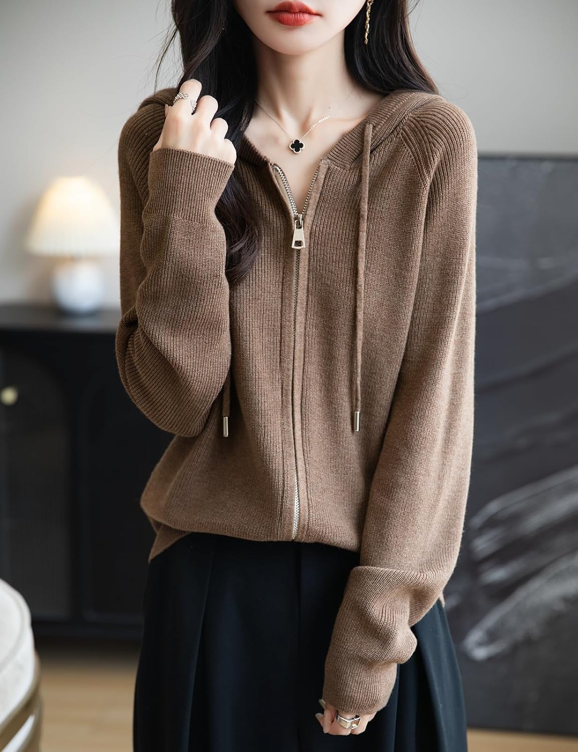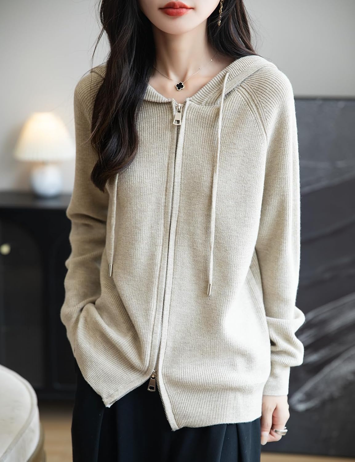 レディースメリノウールブレンドカーディガン2025秋ウィンターカジュアルジッパースウェットシャツ長袖リブ付きニットフード付きカーディガン