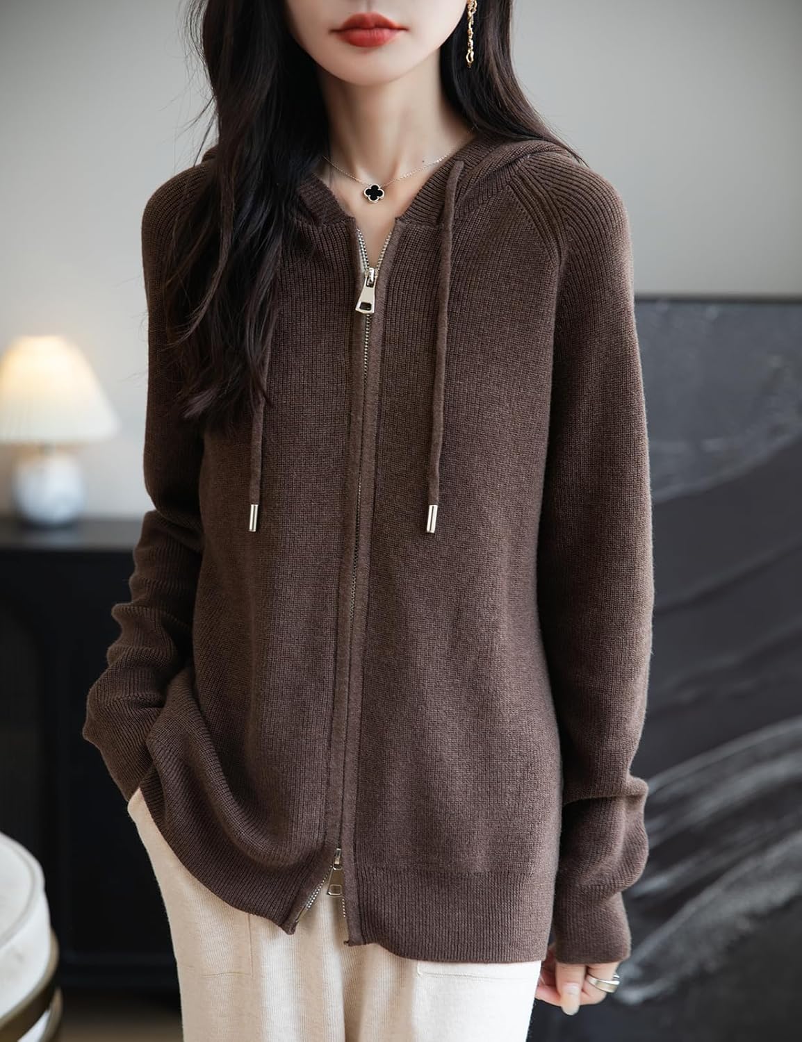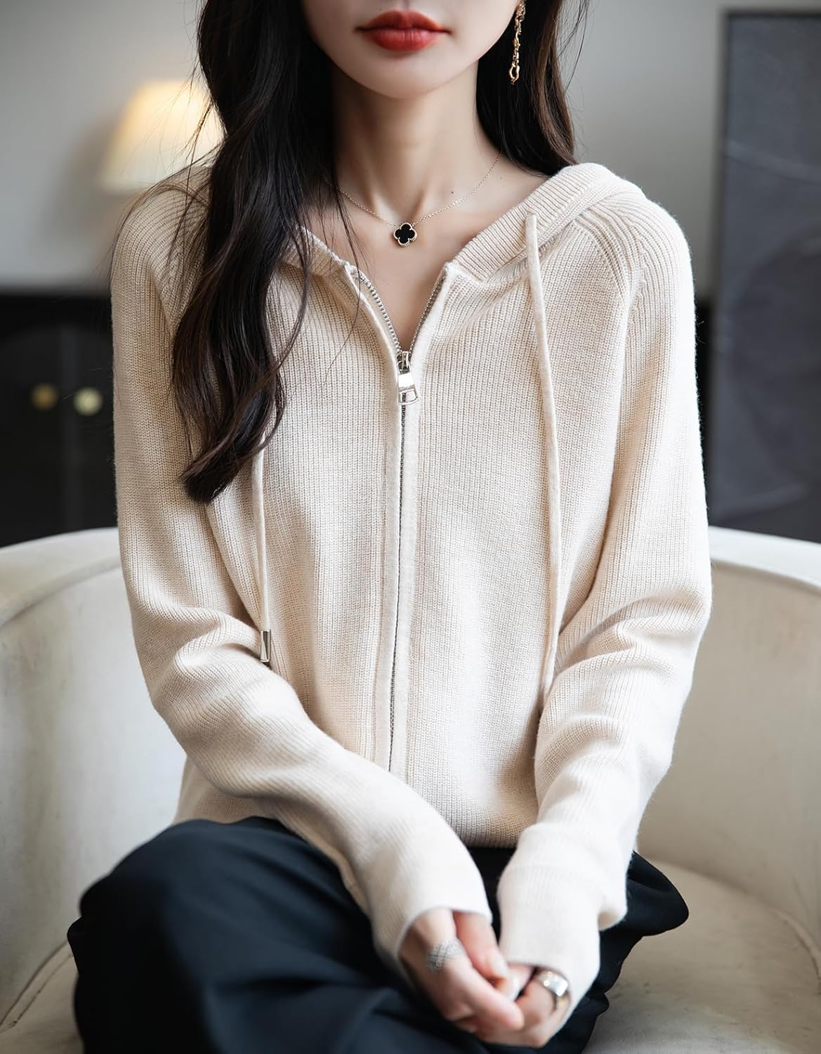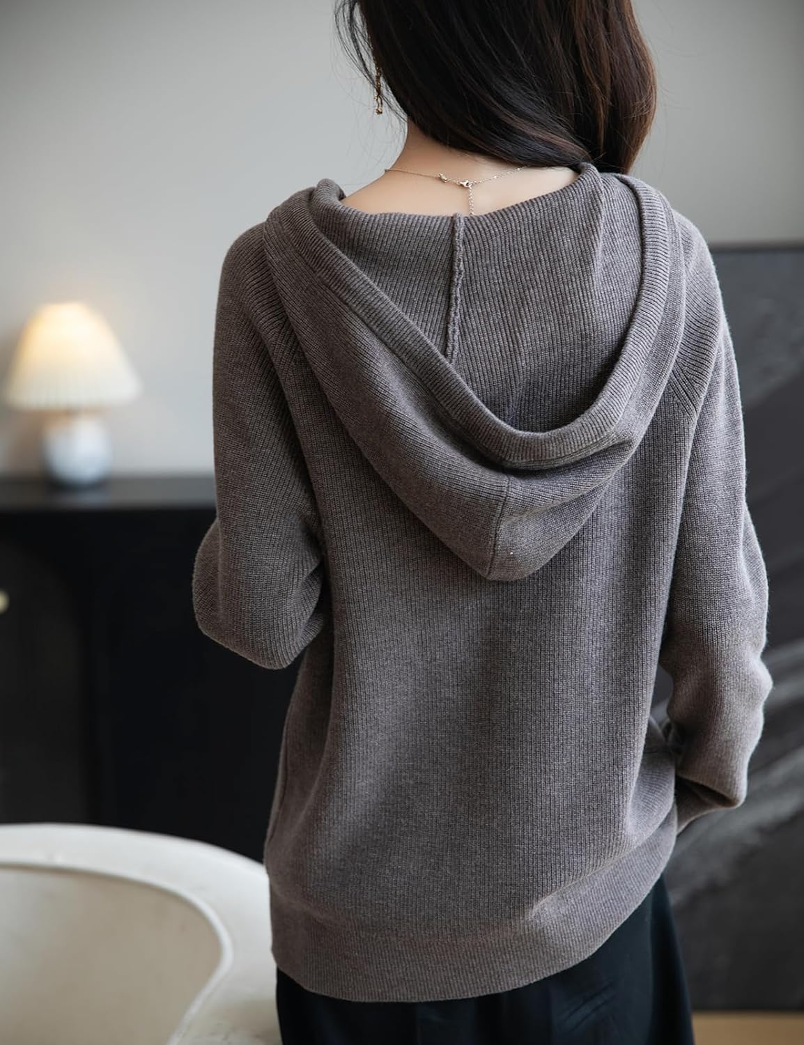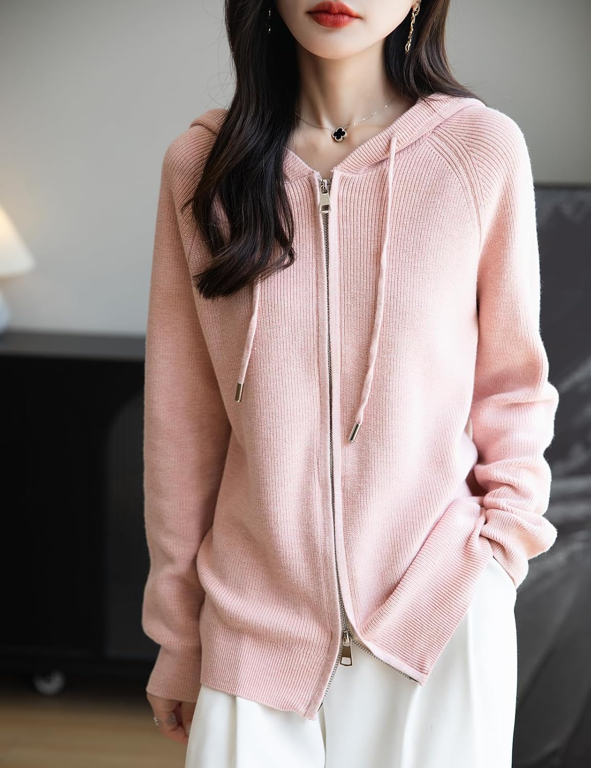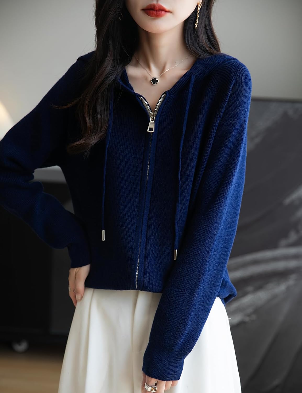 レディースメリノウールブレンドカーディガン2025秋ウィンターカジュアルジッパースウェットシャツ長袖リブ付きニットフード付きカーディガン