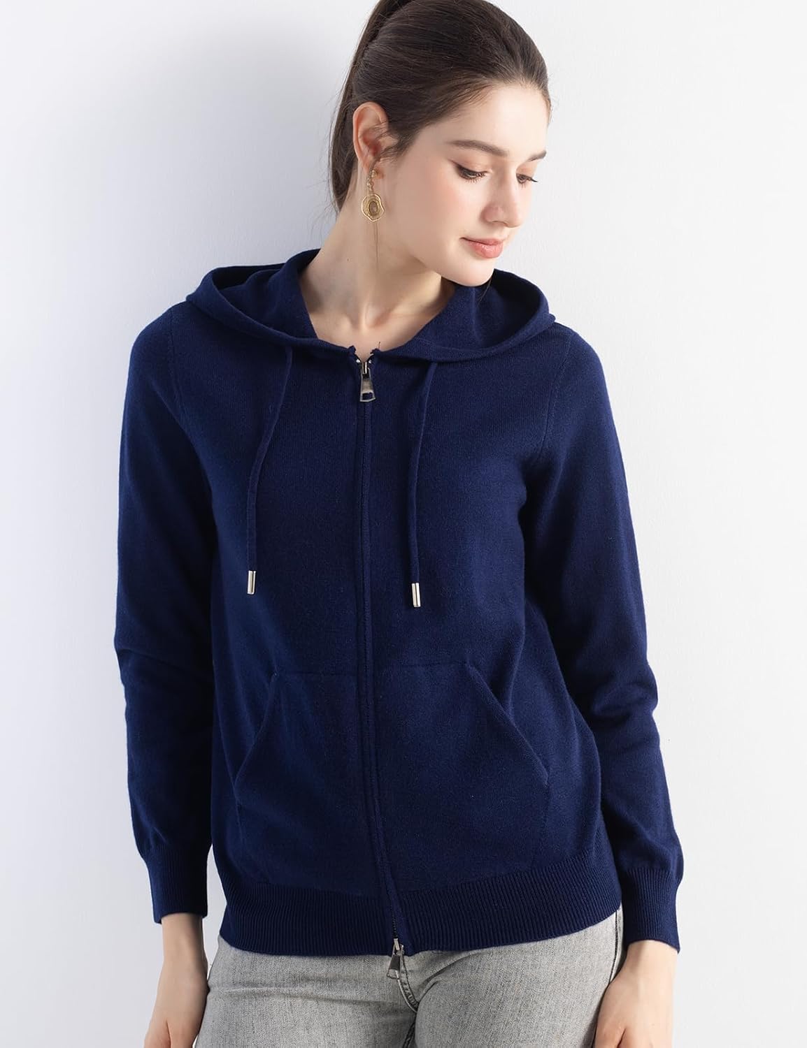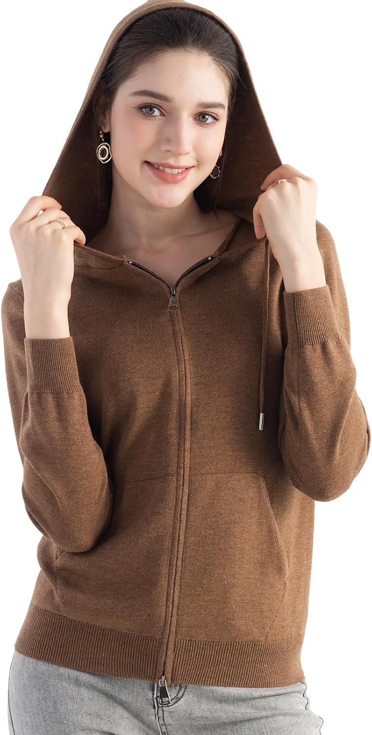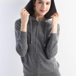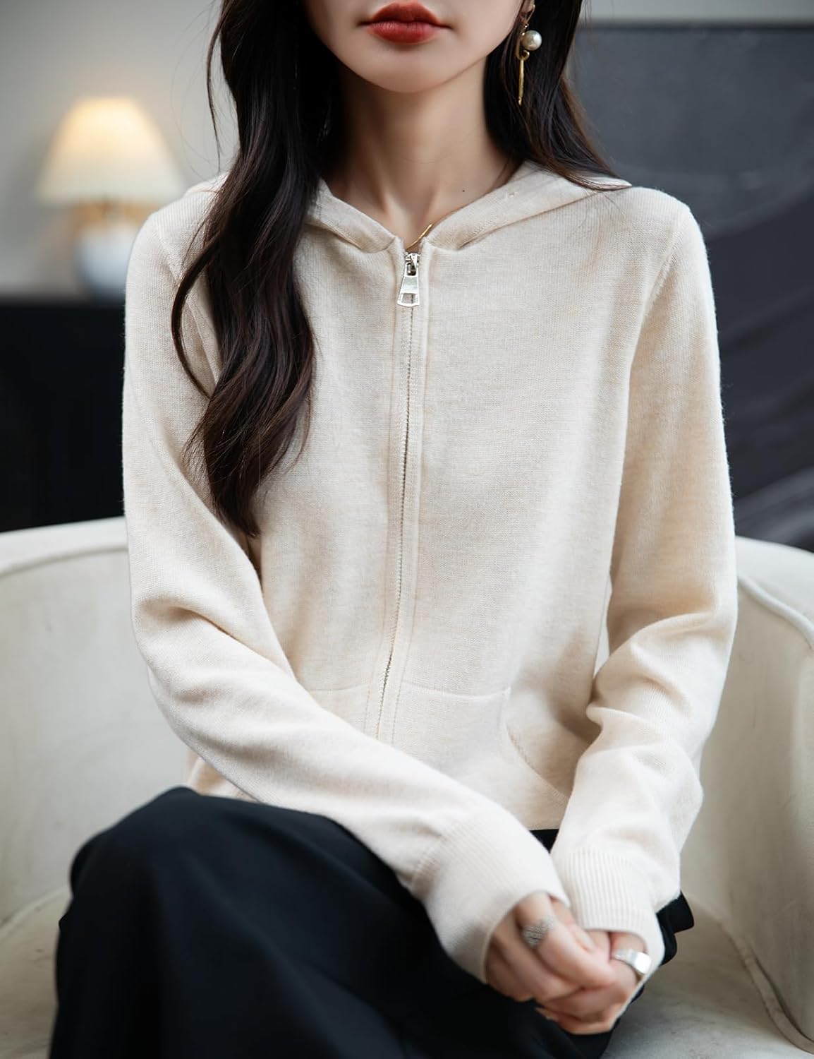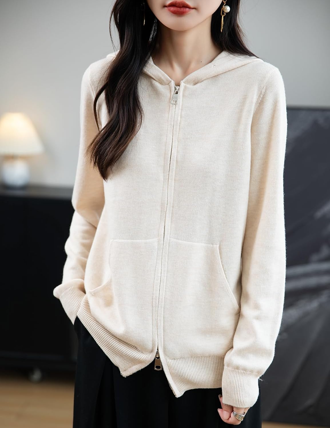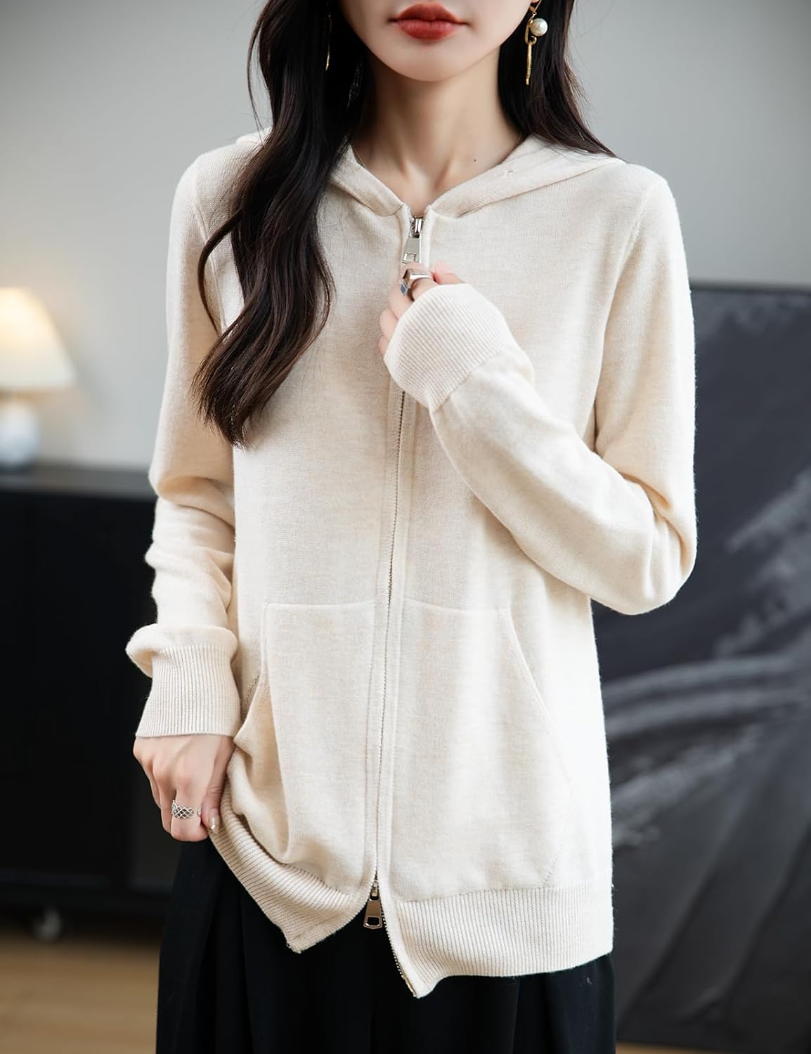 レディースメリノウールブレンドカーディガン2025秋冬のジッパースウェットシャツクルー首長袖ニットフード付きカーディガン