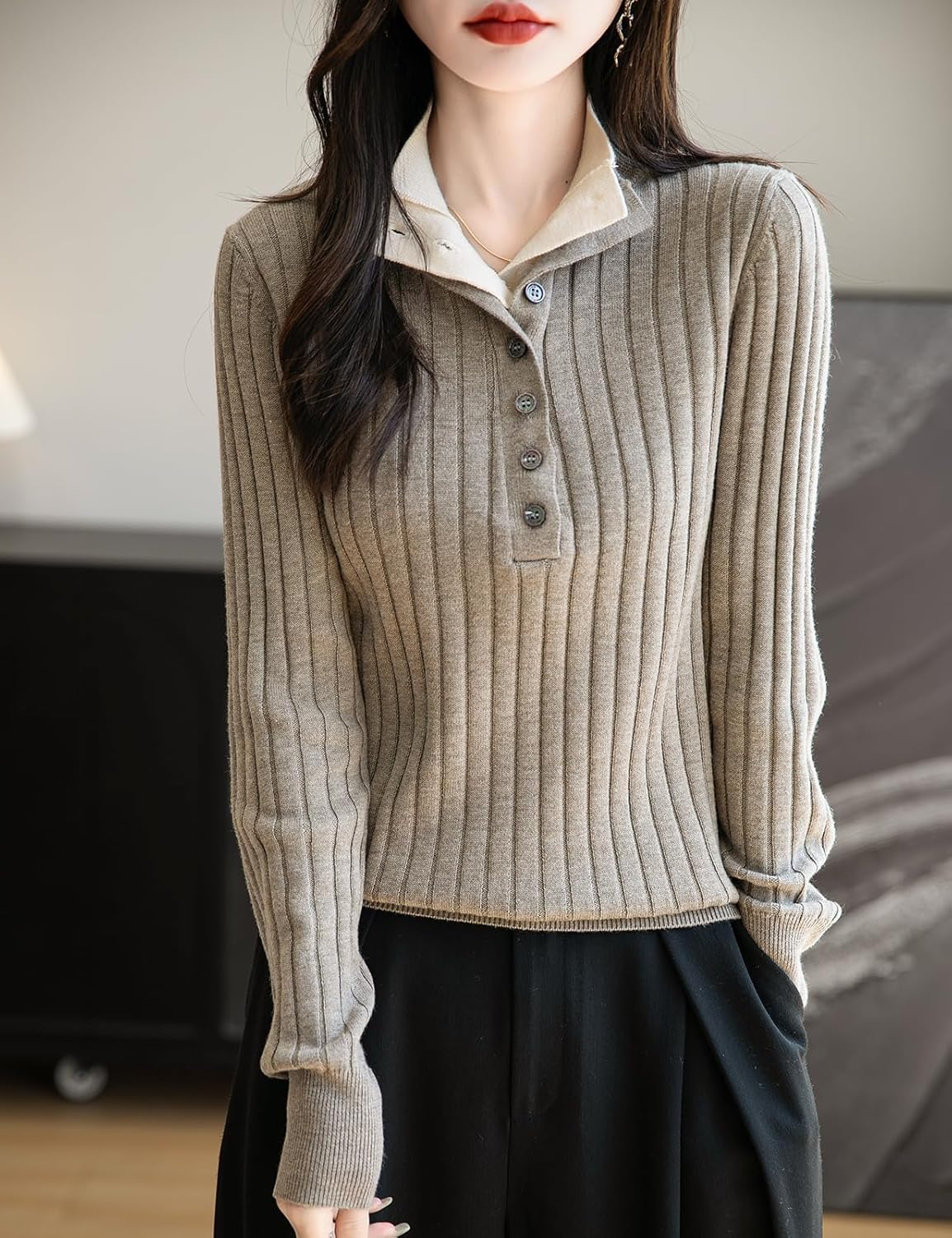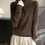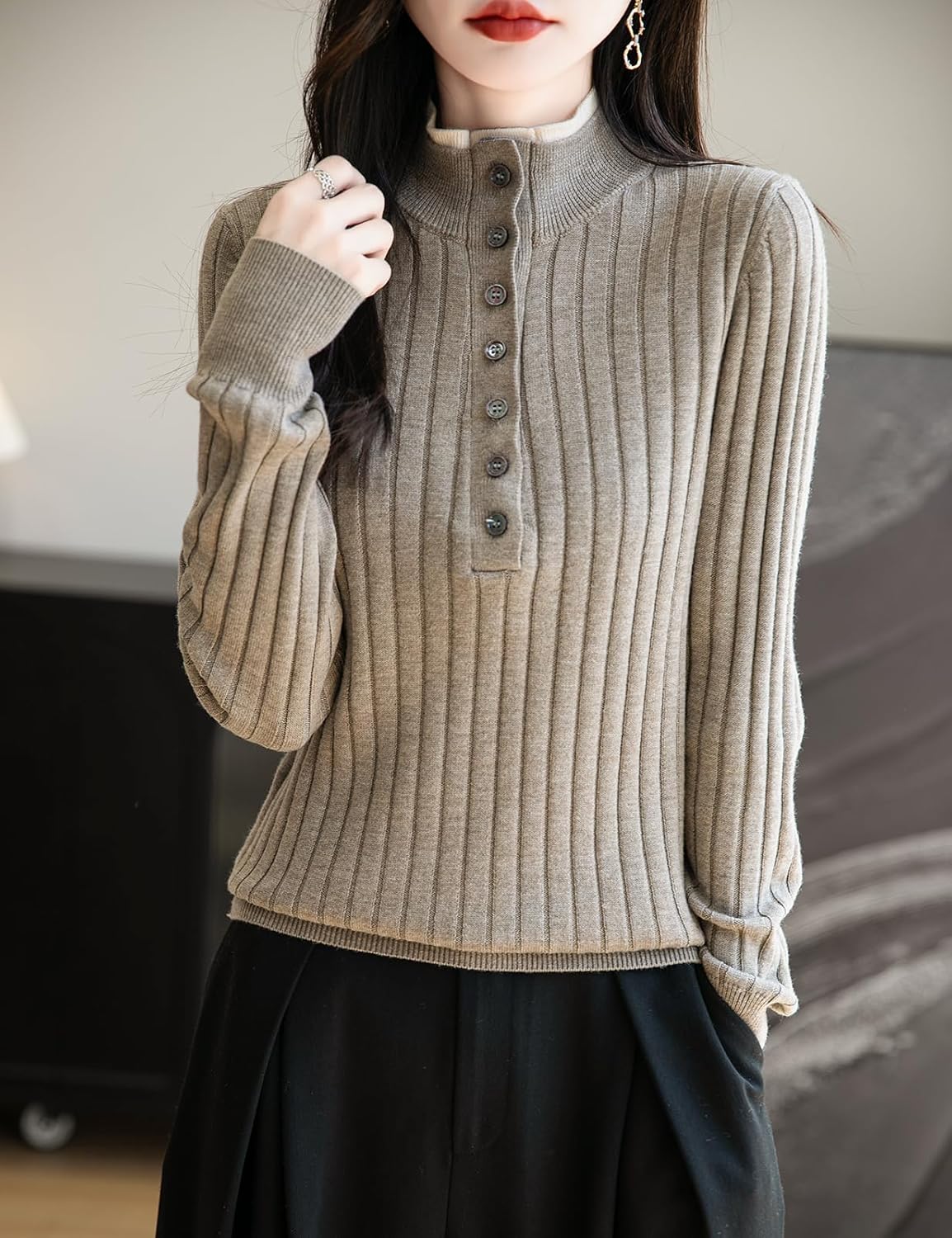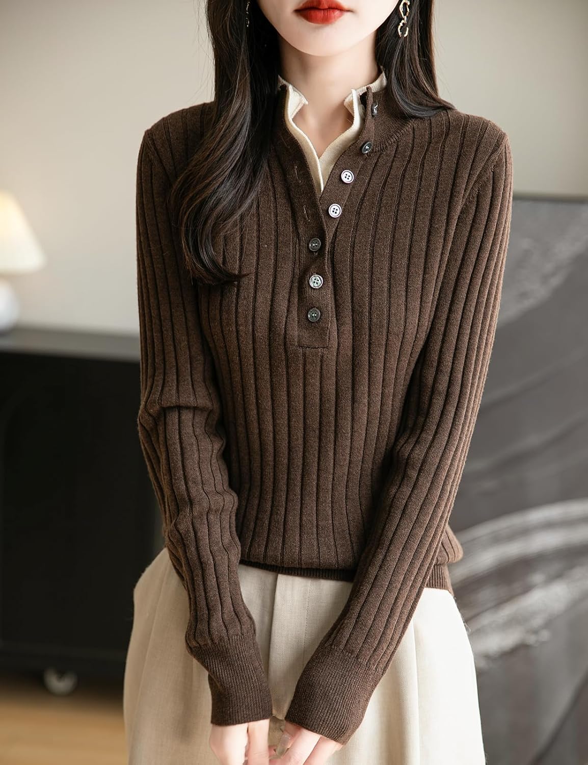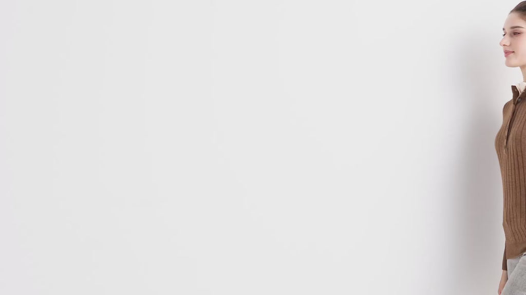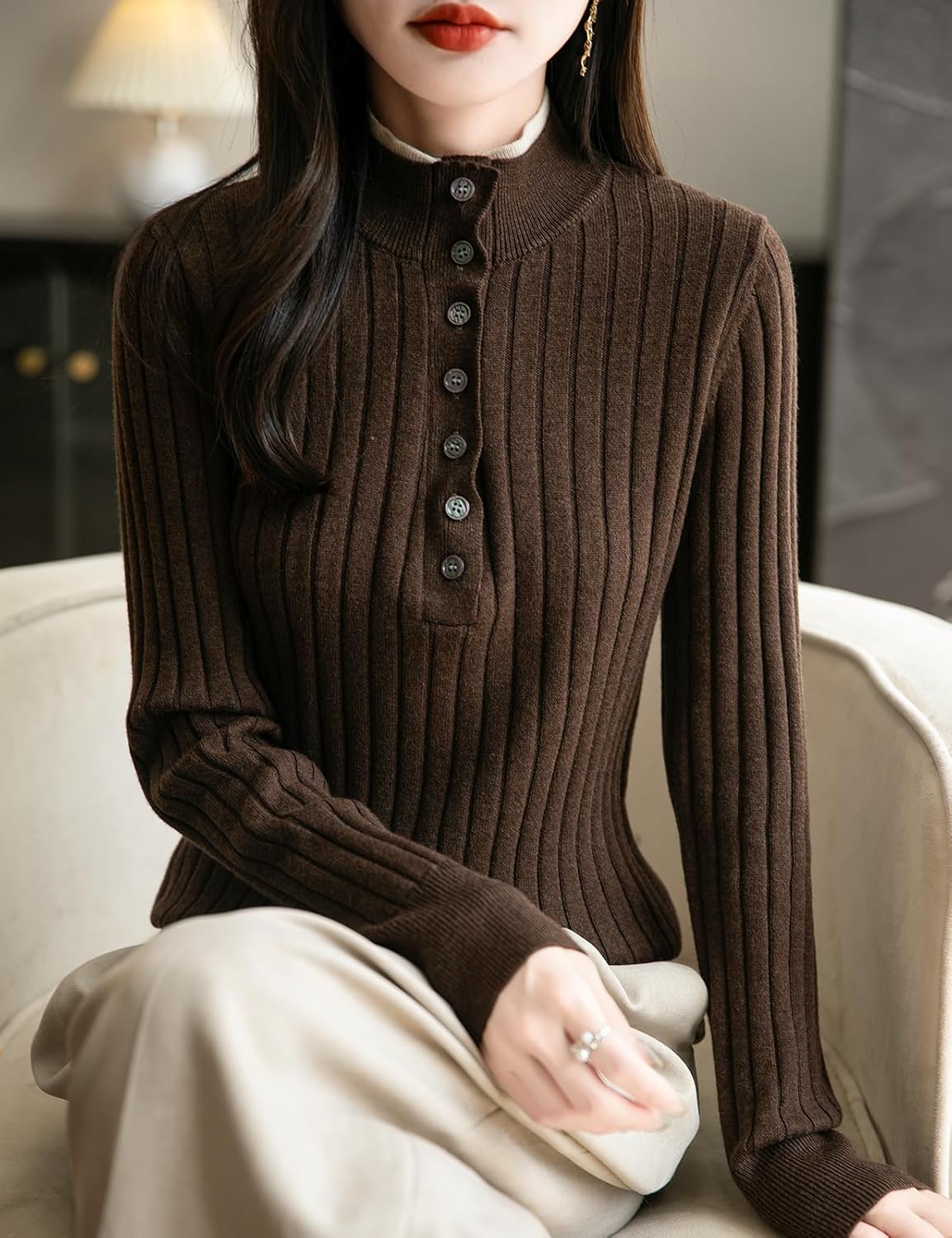 The material is very soft to the touch and I like the style of the mock collar. The color is a true brown, which has been hard to find.It could be worn either casual or dressy. The quality of the manufacure is good.One star off for the sizing. Ordered my usual size, and should have gone one up. This size is very form fitting.