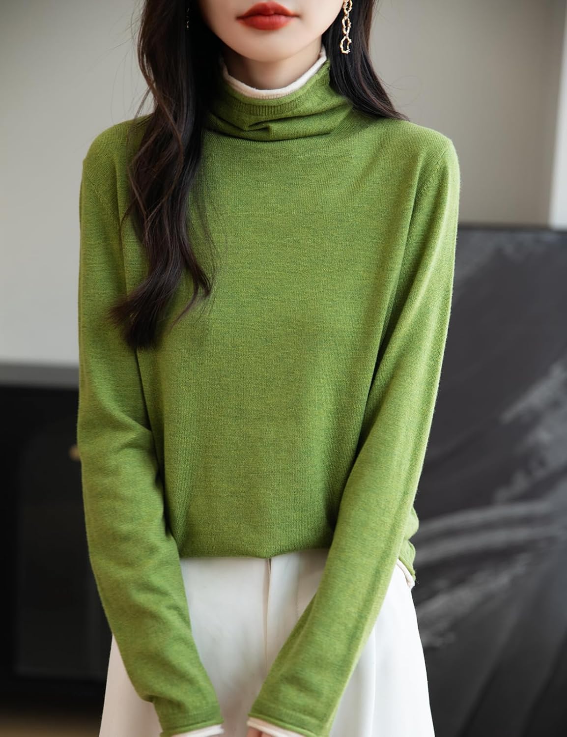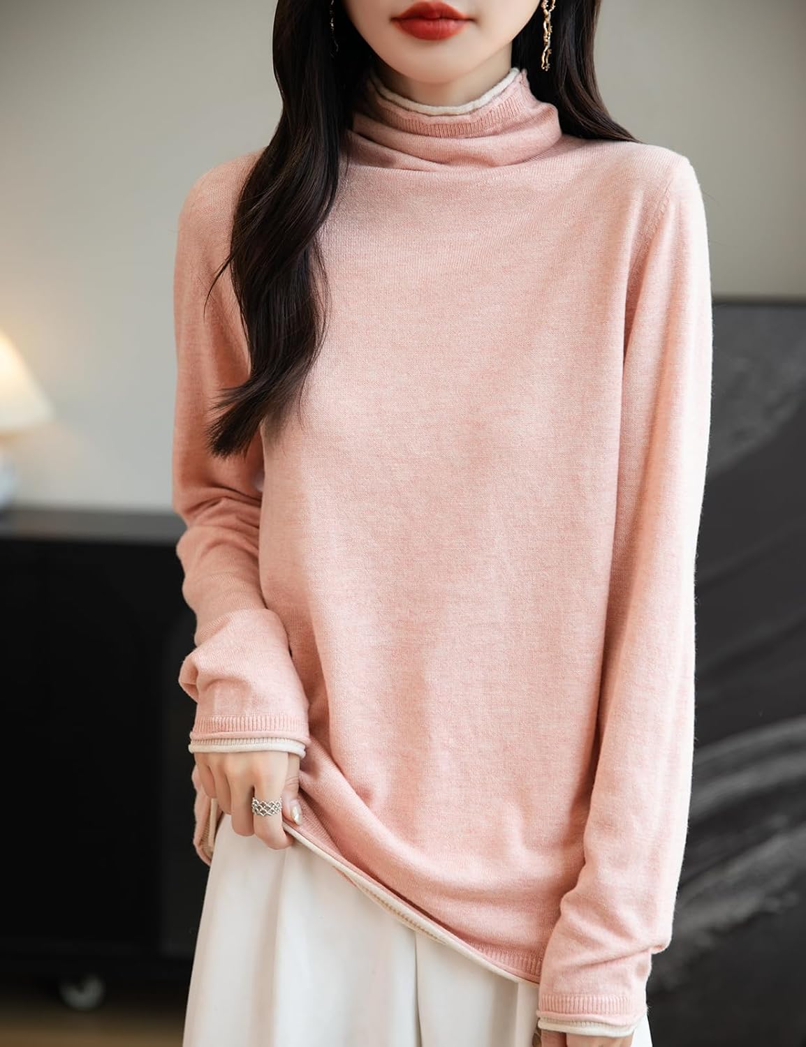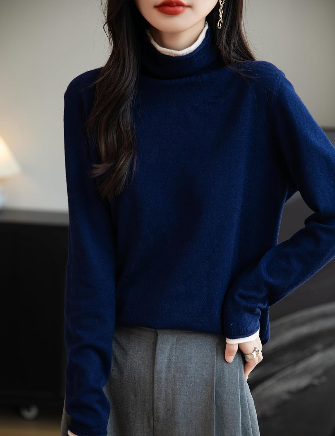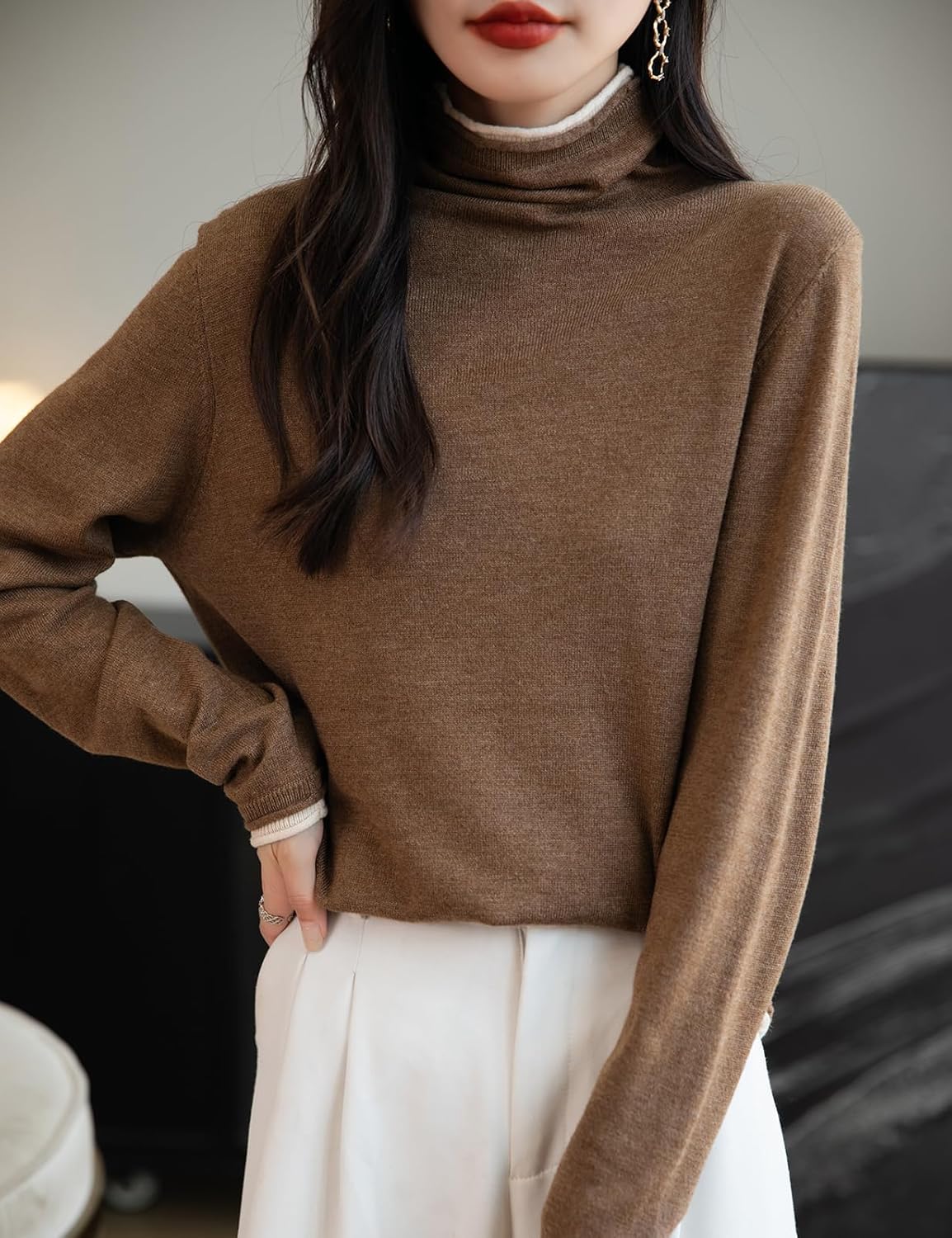 女性のメリノウールブレンドセーター2025秋冬の偽の二枚色ブロックタートルネック長袖ニットプルオーバー