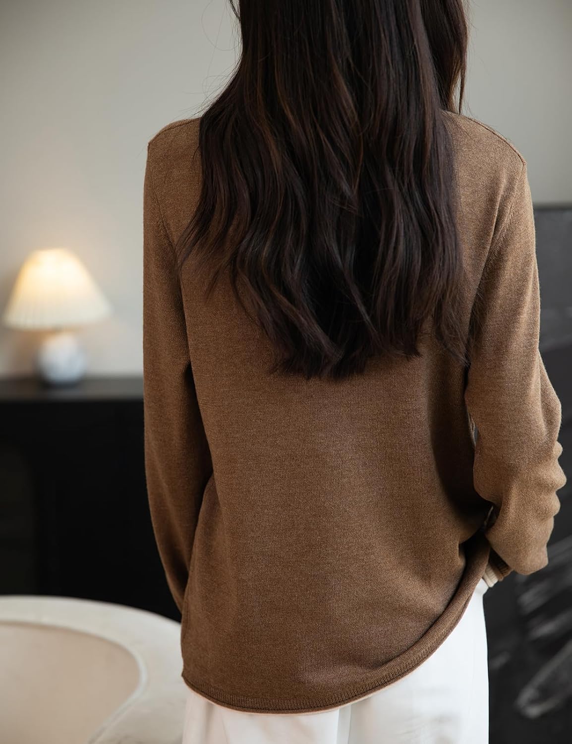This merino wool blend sweater is very soft and lightweight while still providing a lot of warmth. I like the double fabric look without having the bulk of two actual layers. The only reason I took off one star is because the turtleneck cannot be folded down without showing seams (see 2nd picture). The turtleneck is rather tall, so when I pushed it down lower, it felt a bit constricting around my neck.
