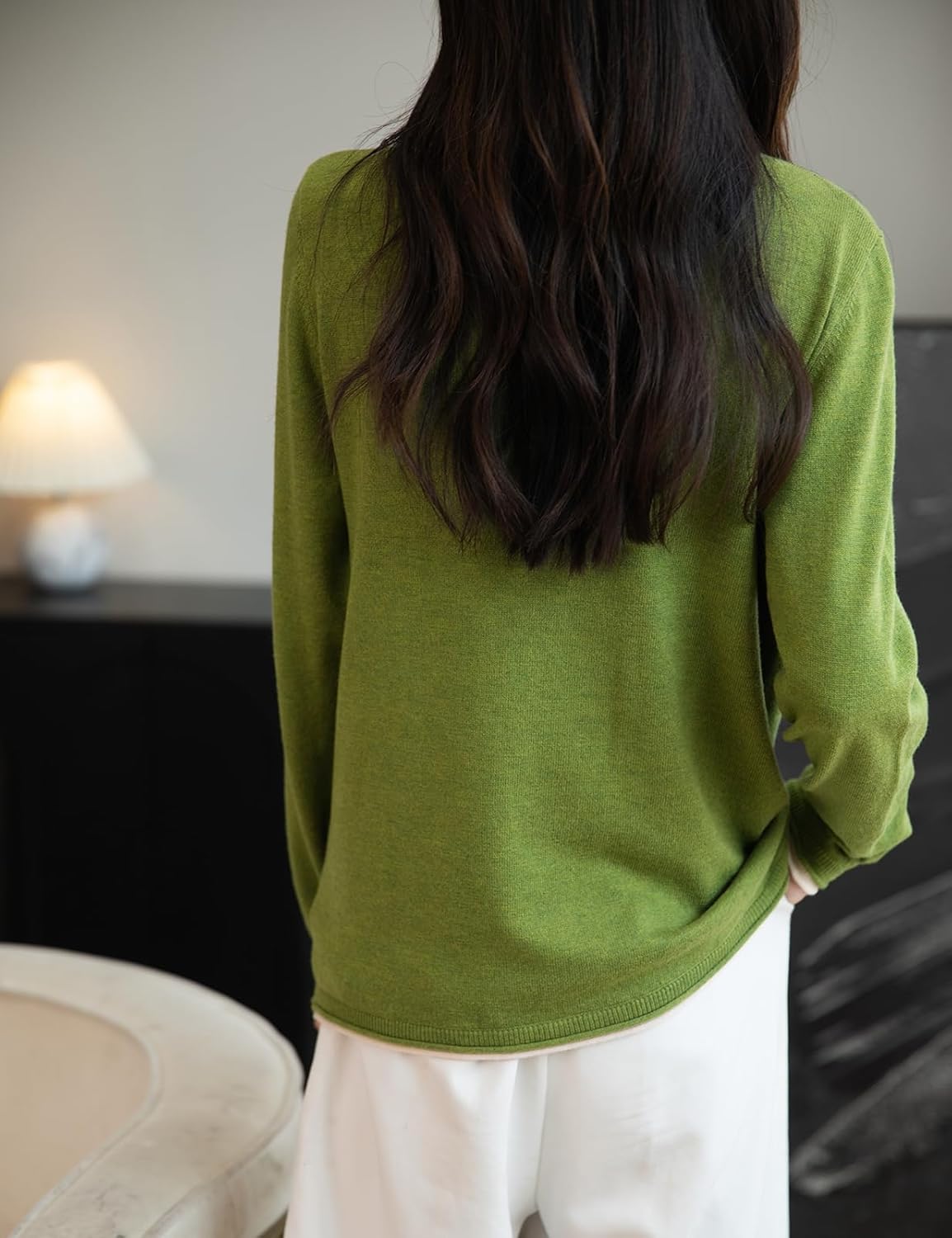 Let me start out by saying I love the "ocean green" color. Not sure where they got the "ocean" part but it's more of an apple, green apple jolly rancher green color. It's gorgeous. Around the collar, cuffs, and hem, there is a beige faux second layer to offset the green. Again, it's a gorgeous detail and I love it.A little about me: I'm 5'3", very busty (G cup), wear between a 14 and 16 in US sizing but often order to the 16 due to my large bust. I don't want things to be overly snug or tight in this area. In this sweater, I ordered the XL to give me a little room and I'm glad I did. It fits great. It has a relaxed fit around the bust and bodice, slightly loose in the arms. Just a great fit on me. The sleeves do fall past my wrists, but the knit of the cuff allows it to stay up at the wrist. The hem falls to about mid to low hip. The mock neck is probably about 2-3 inches tall so not that tall but enough to showcase the faux beige layer. The seams (collar, cuff, and hem) curl over. I tried to take a picture to show it.I like that this is a lightweight sweater that will work well into the cooler months. This is not a layering sweater due to the mock neck but I don't mind that. The material feels AMAZING against the skin and to the touch. It's really soft. Overall, this is a high-quality sweater. I think it could be worn in a variety of environments and could be dressed up or down depending on your needs. It's just gorgeous and this color is chef's kiss.