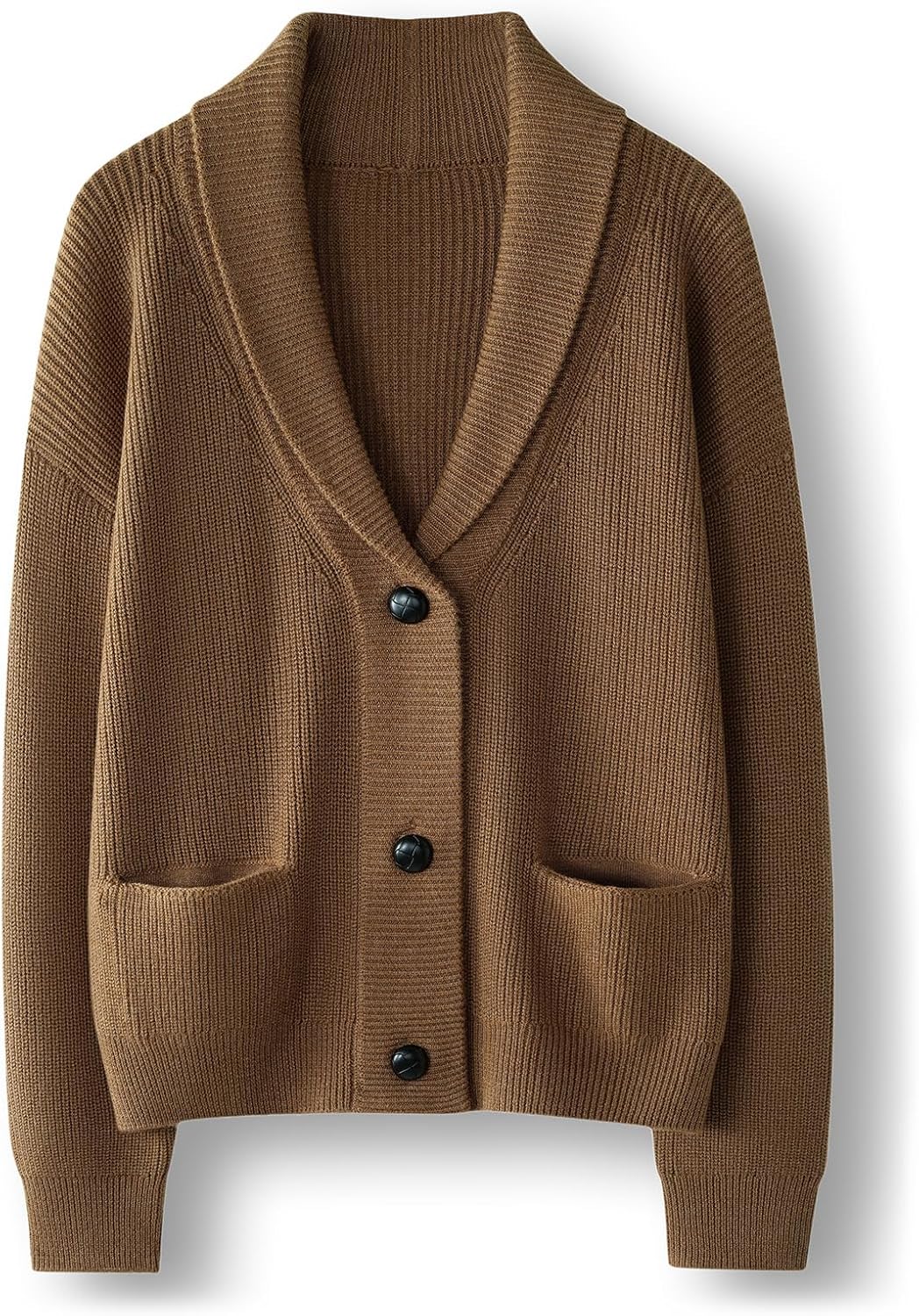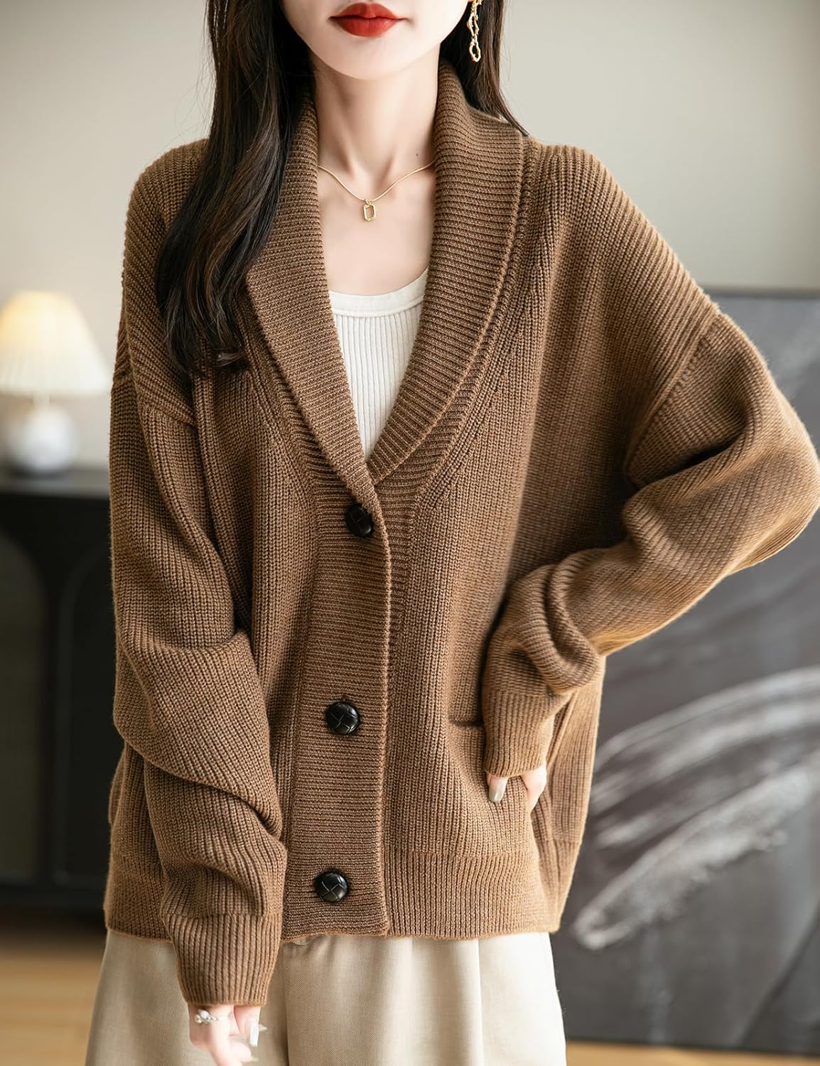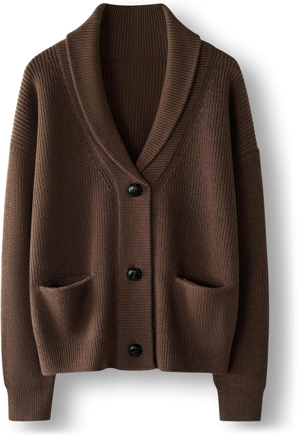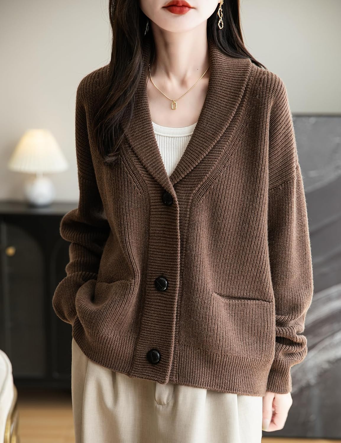 レディースメリノウールブレンドセーターVネック2025秋の冬のラペルボタンダウン長袖ニットカーディガンとポケット