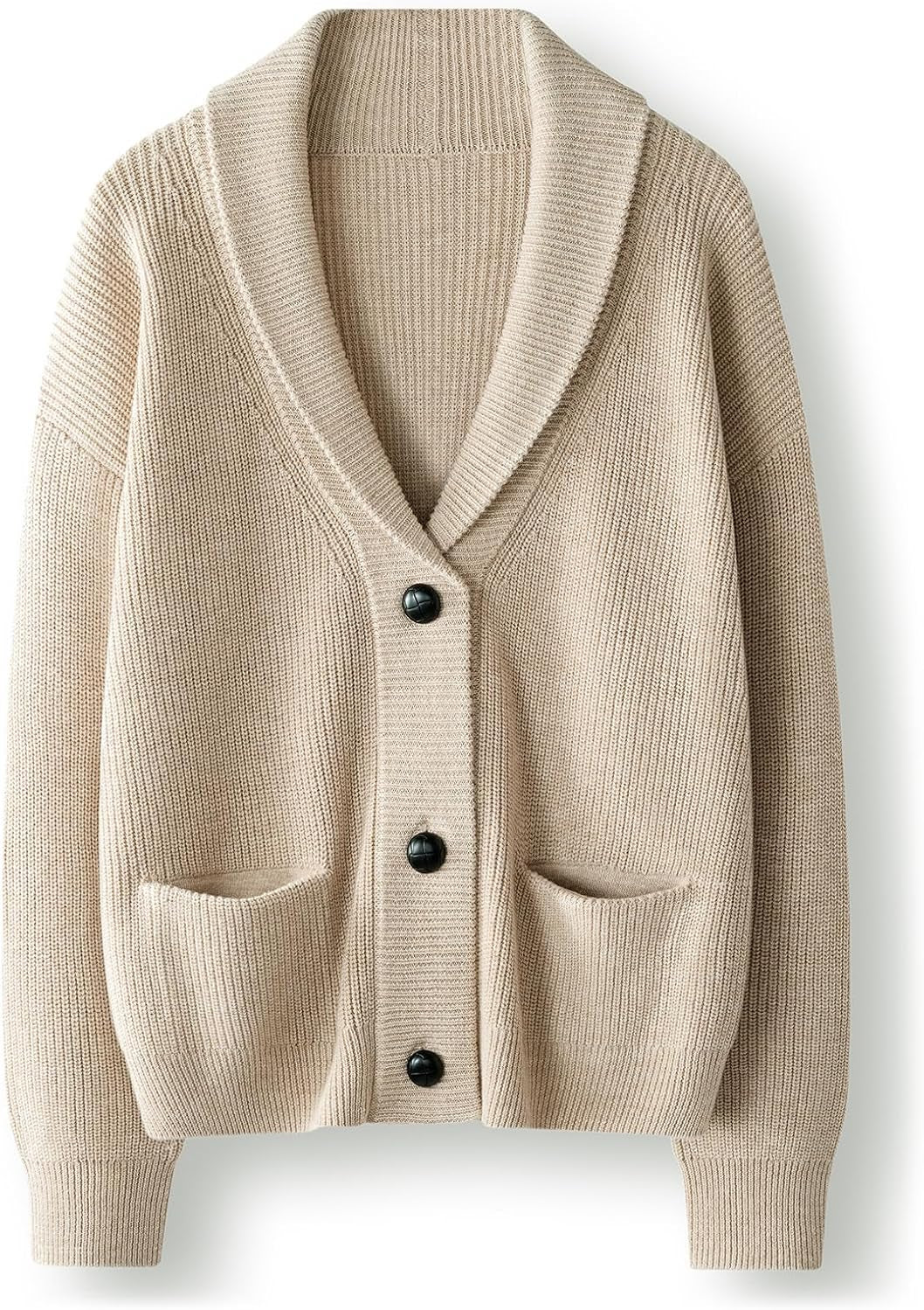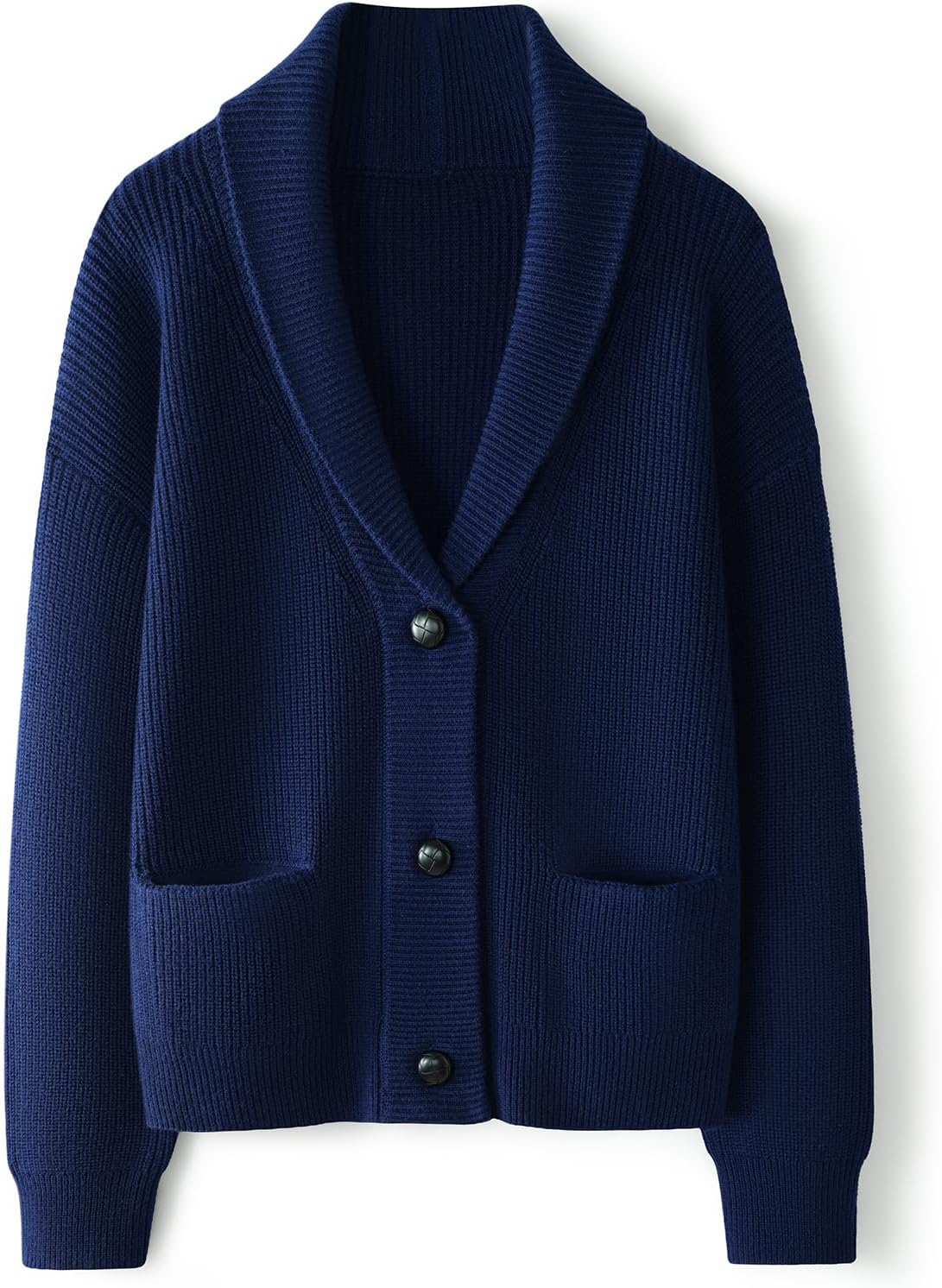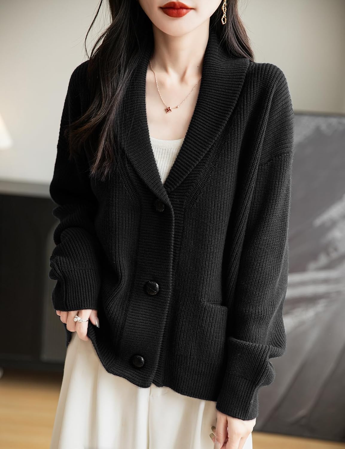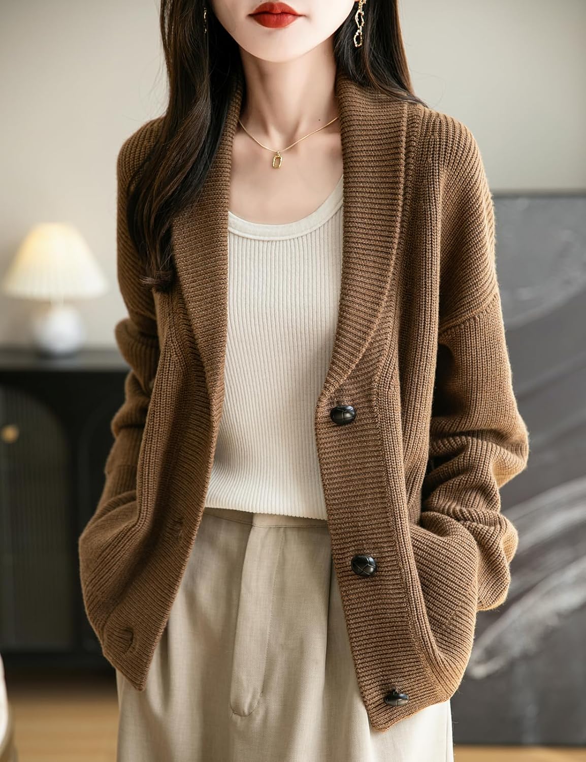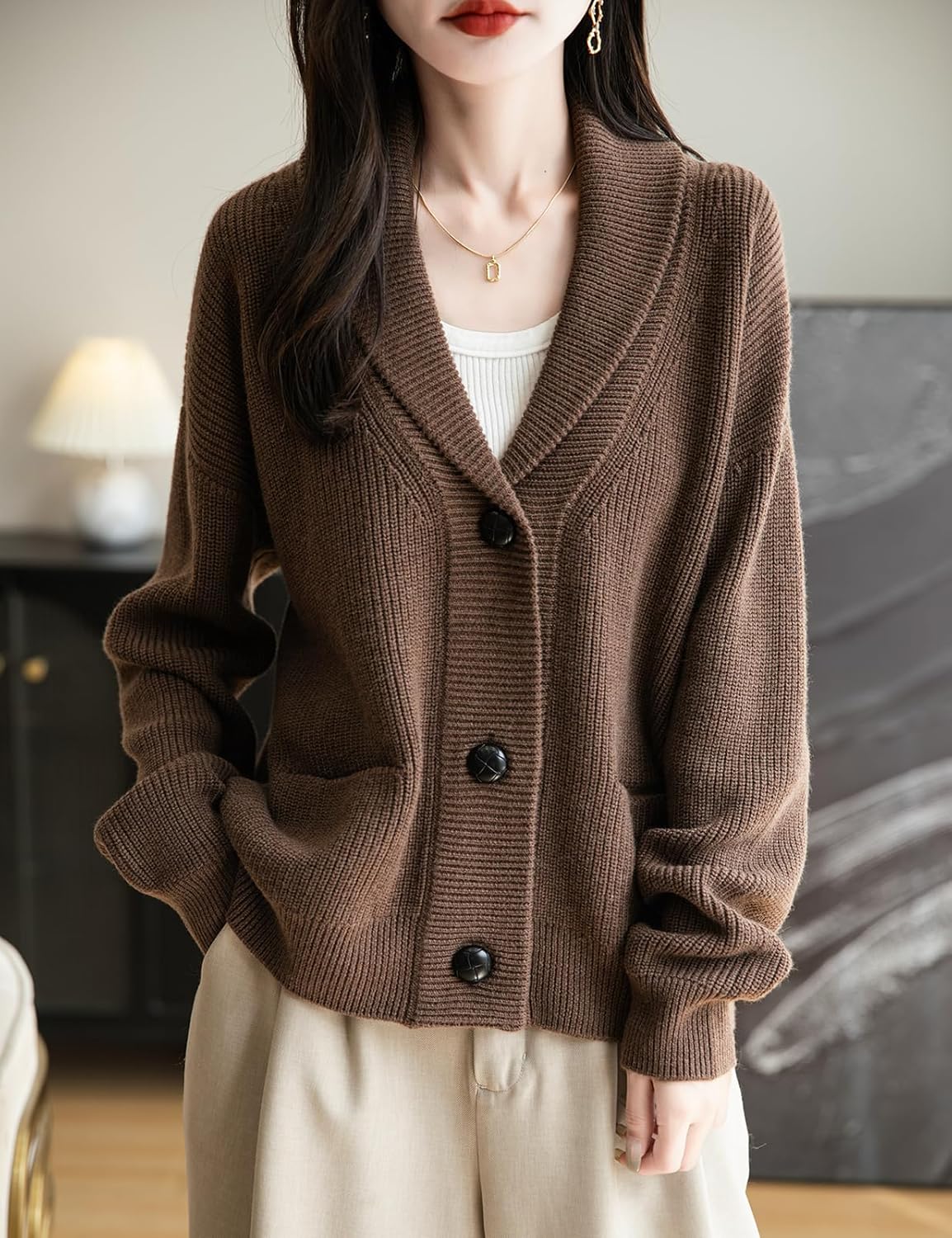 レディースメリノウールブレンドセーターVネック2025秋の冬のラペルボタンダウン長袖ニットカーディガンとポケット