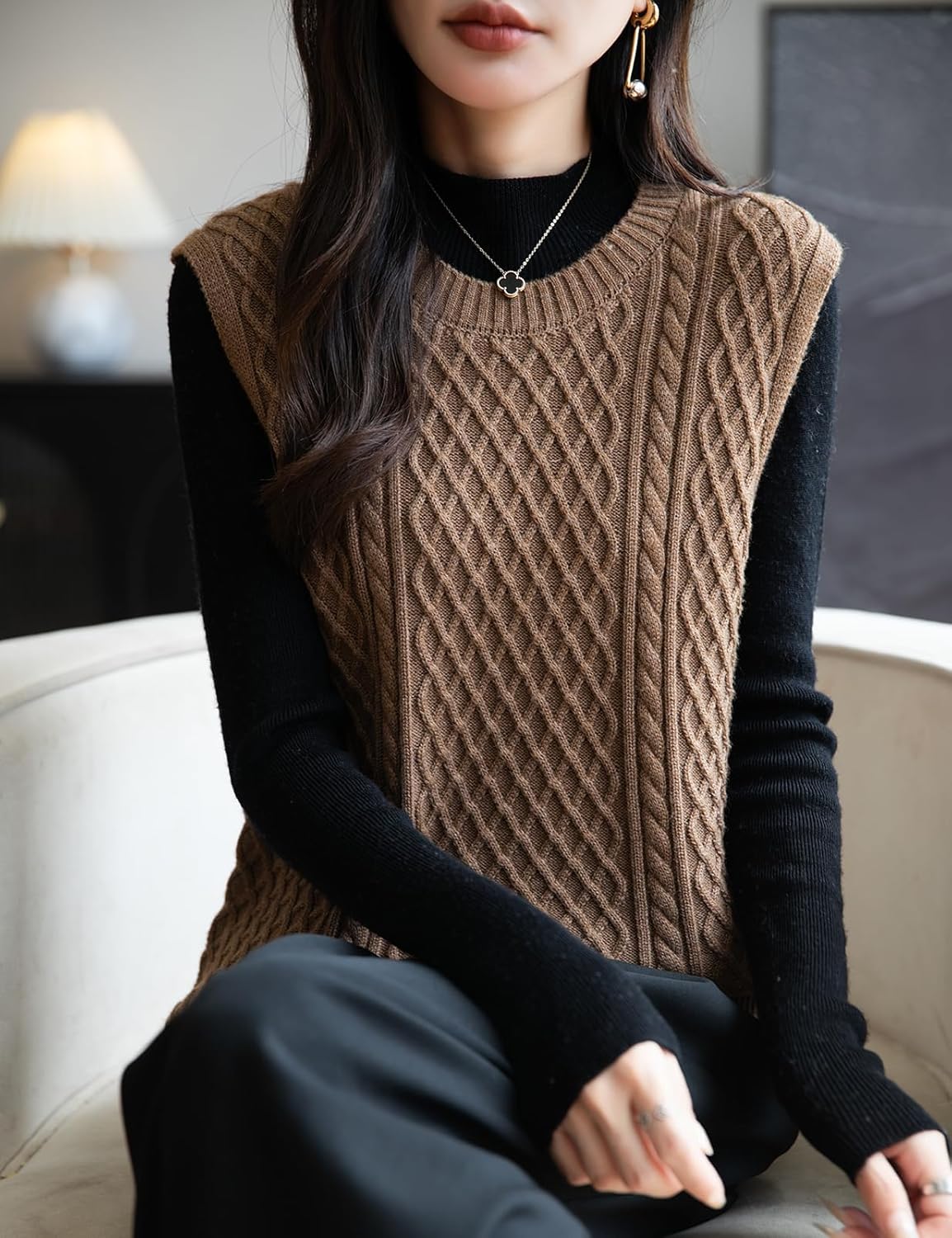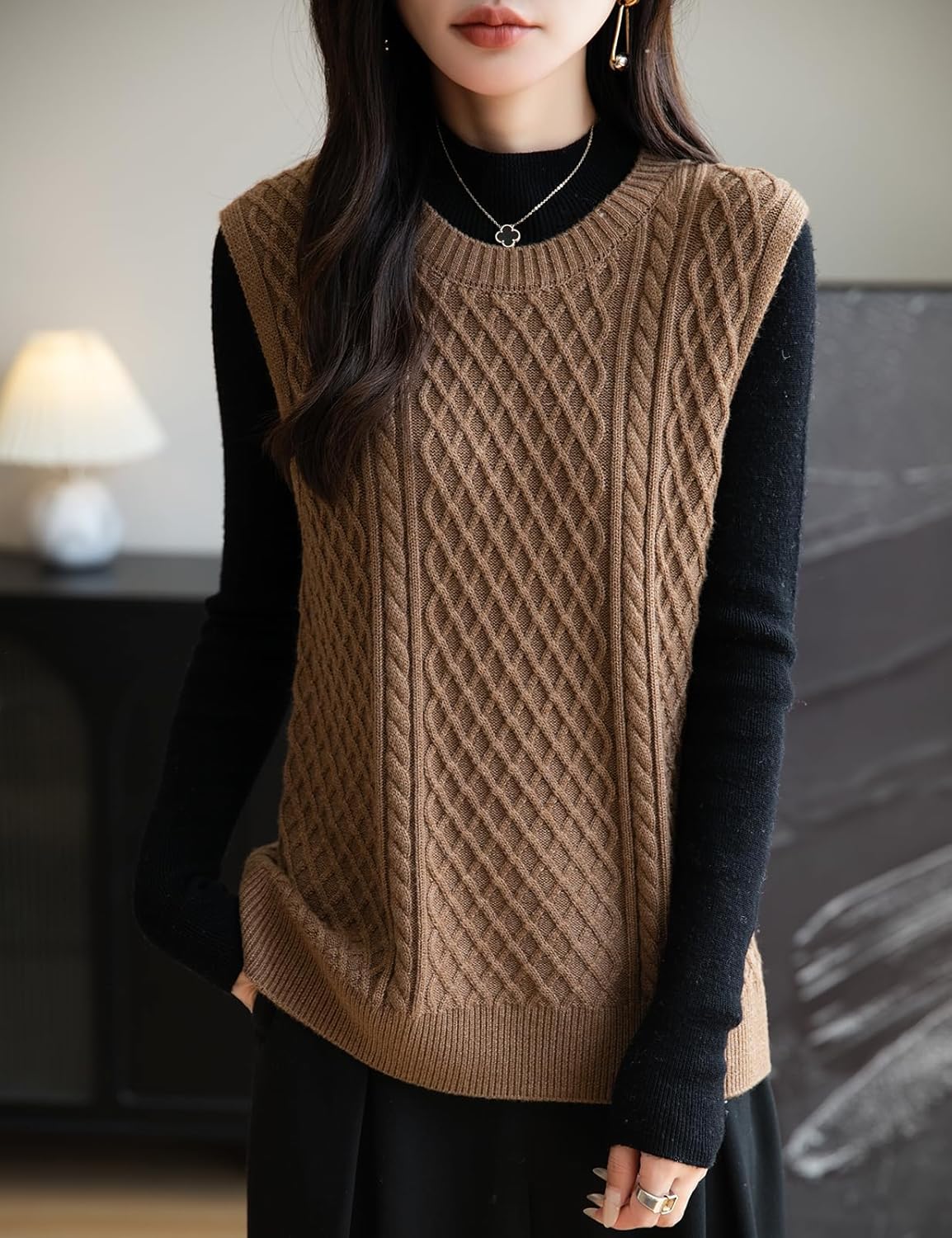 女性のメリノウールブレンドセーターベスト2025秋ウィンタークラシッククルーネックノースリーブケーブルニットプルオーバーセーターベスト