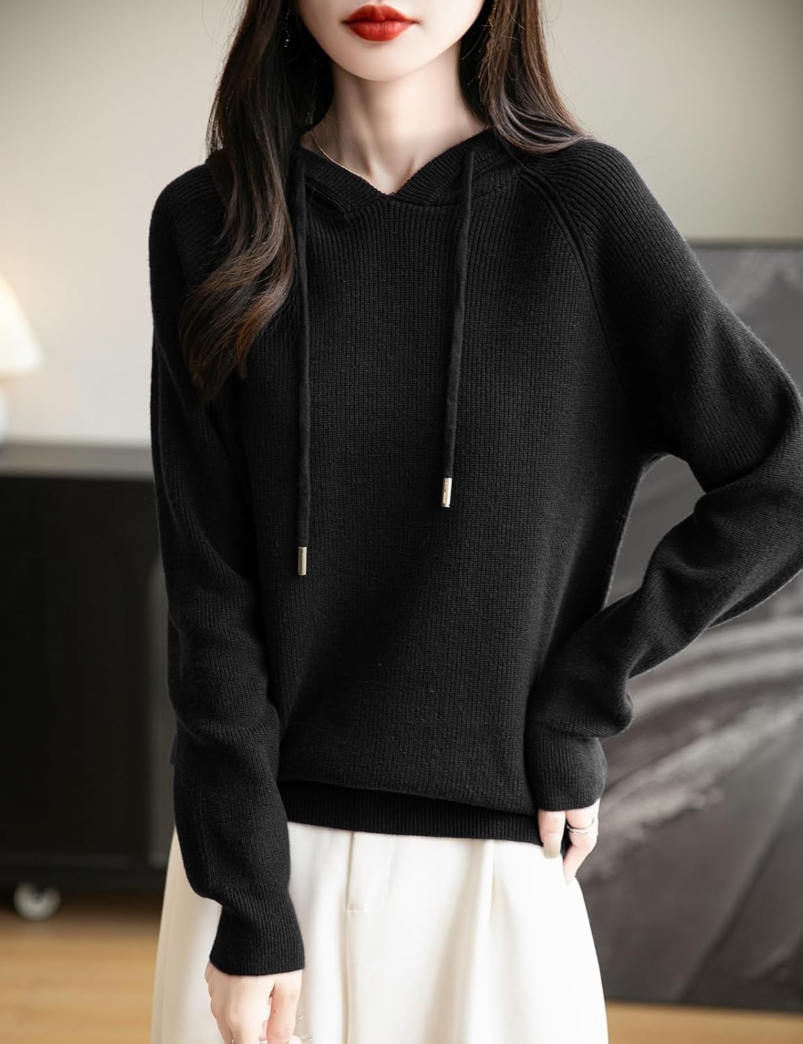 女性のメリノウールパーカー2025秋の冬のカジュアルクルネックスウェットシャツ長袖ニットセータードローストリング