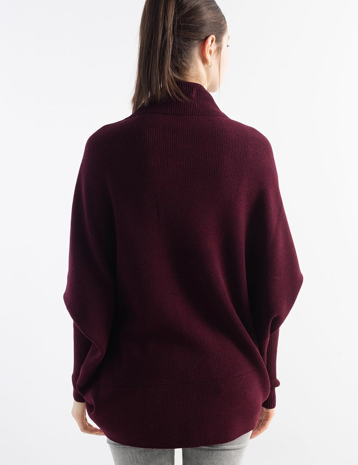 This is a chic looking sweater that can be styled casual or dressy and you can feel cozy in either way. It is a bit tricky to find which way is up for wearing but we referred to the pictures online and found there is a seam toward the bottom of the collar when it is on correctly. It is advertised as Merino wool but that is only a small 5.9 percentage of the fiber content still, it is soft, warm and has a nice drape to it. The fiber is also described as anti-pilling, only time and wearing will tell if that is true. The cut is long enough to cover your bottom and the sleeves are snug enough to not slip down your arm. The size medium a good oversized fit on a 5ft 110lb woman.This is not bargain priced but it is a fair price for the styling you get if the fabrication holds up to the promise of anti-pilling, it will be worth the price and then some!