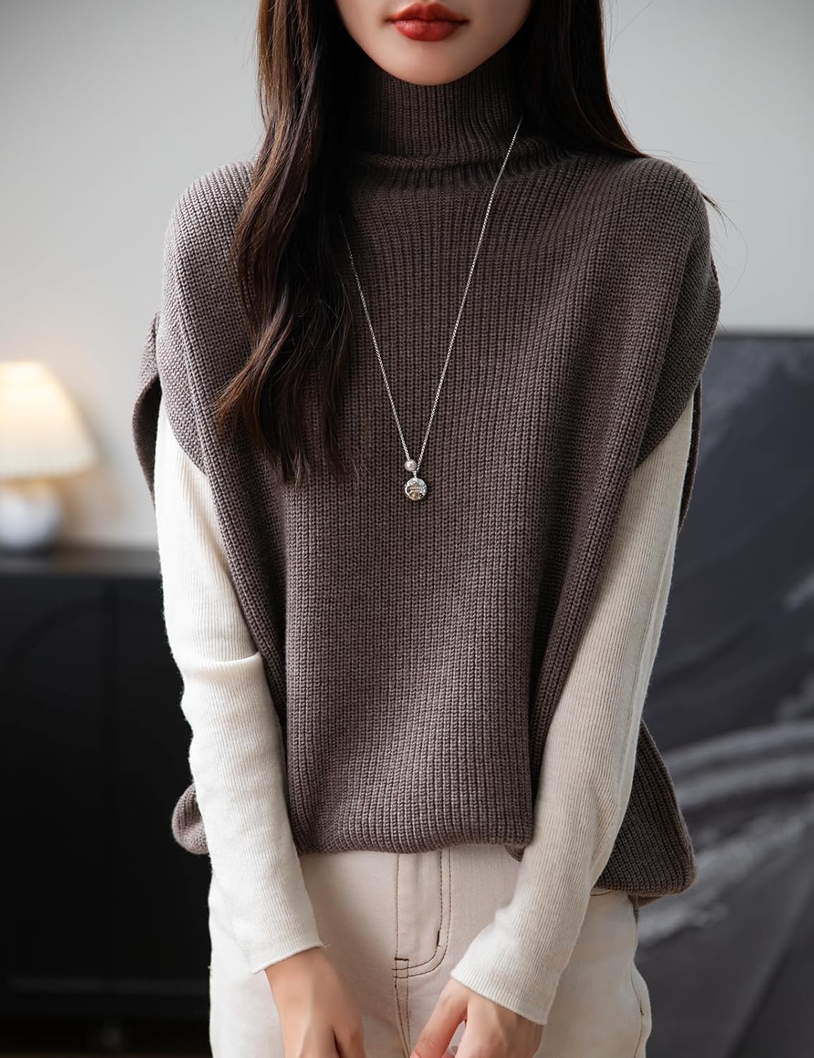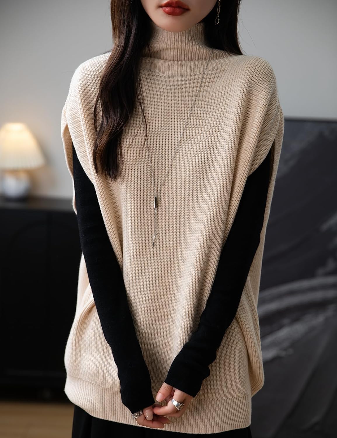女性のメリノウール特大のセイターベスト2025秋冬のカジュアルルーズタートルネックノースリーブニットプルオーバーセーター