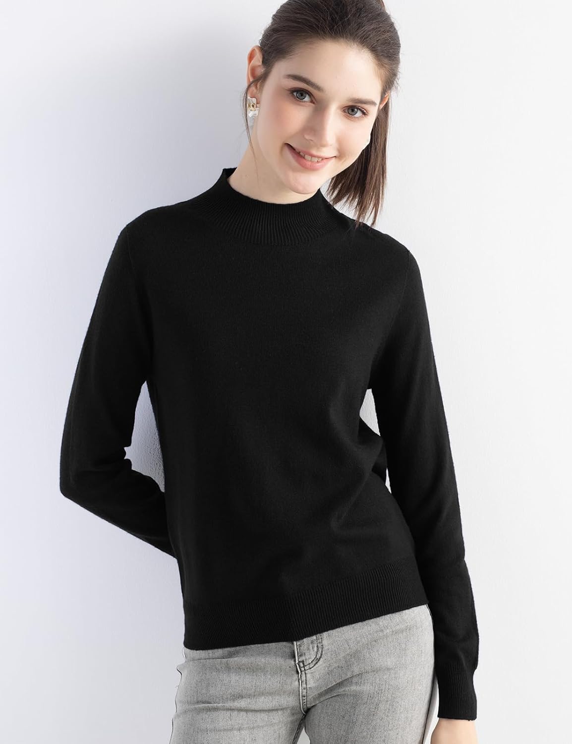 I have worn this sweater at least three times in the past 2 weeks as the weather has gotten chillier. It looks great with jeans but could also be worn with dressier pants or a skirtThe material itself is of good quality for the price point. The color is exactly as pictured in the seller's listing photos. The neck is higher than the typical crew neck found on these sweaters. It's not quite a mock turtleneck, but it's definitely higher than the standard crewneck sweater, which is a nice feature on chilly mornings!I've worn this sweater three times and it is not pilling at all, so I'm hopeful it will stay nice looking. If it begins to pill, I will update this review.If you are seeking a basic fall sweater to wear under blazers or to layer, this is a good option. It's soft, comfortable, and it was true to fit in my normal size.
