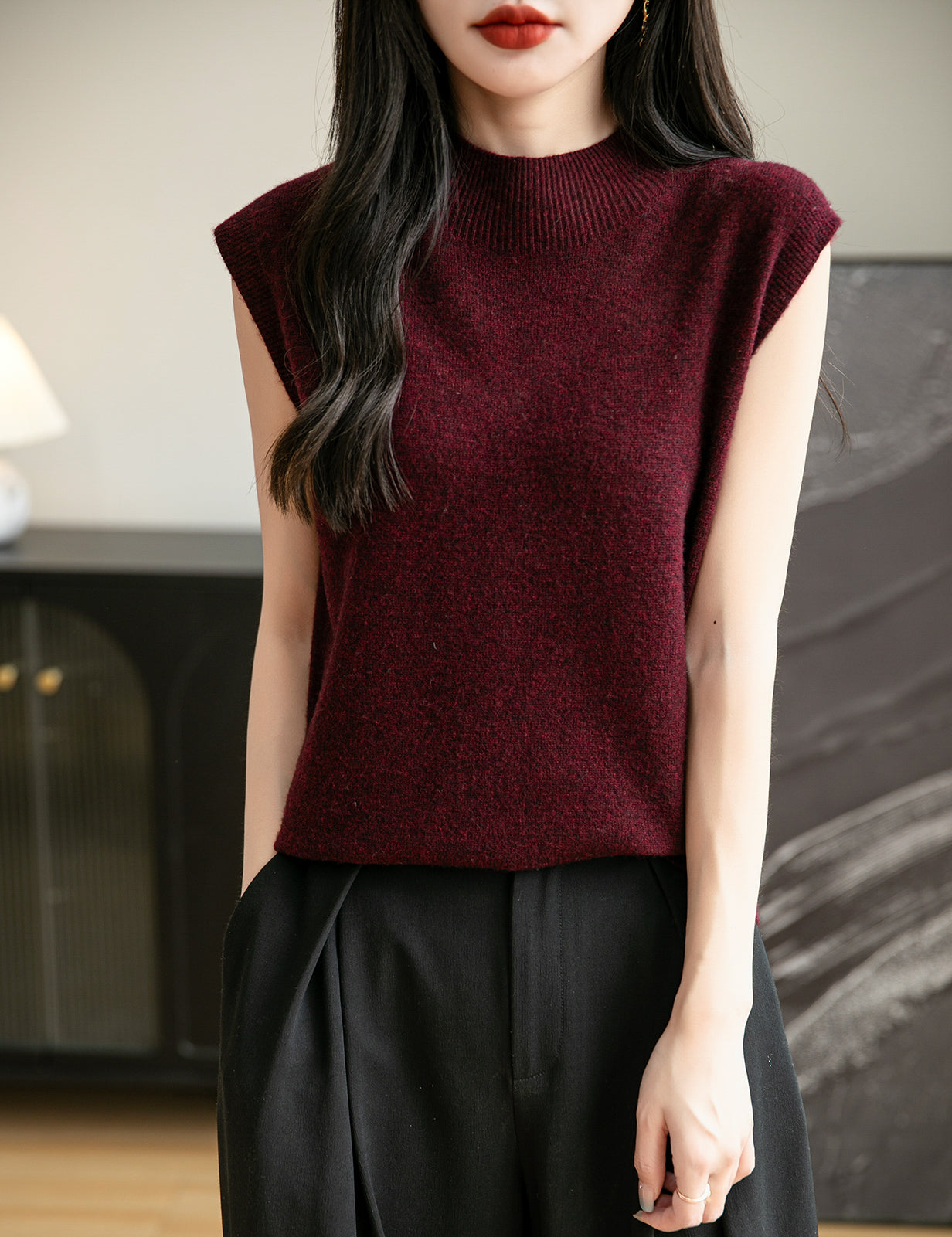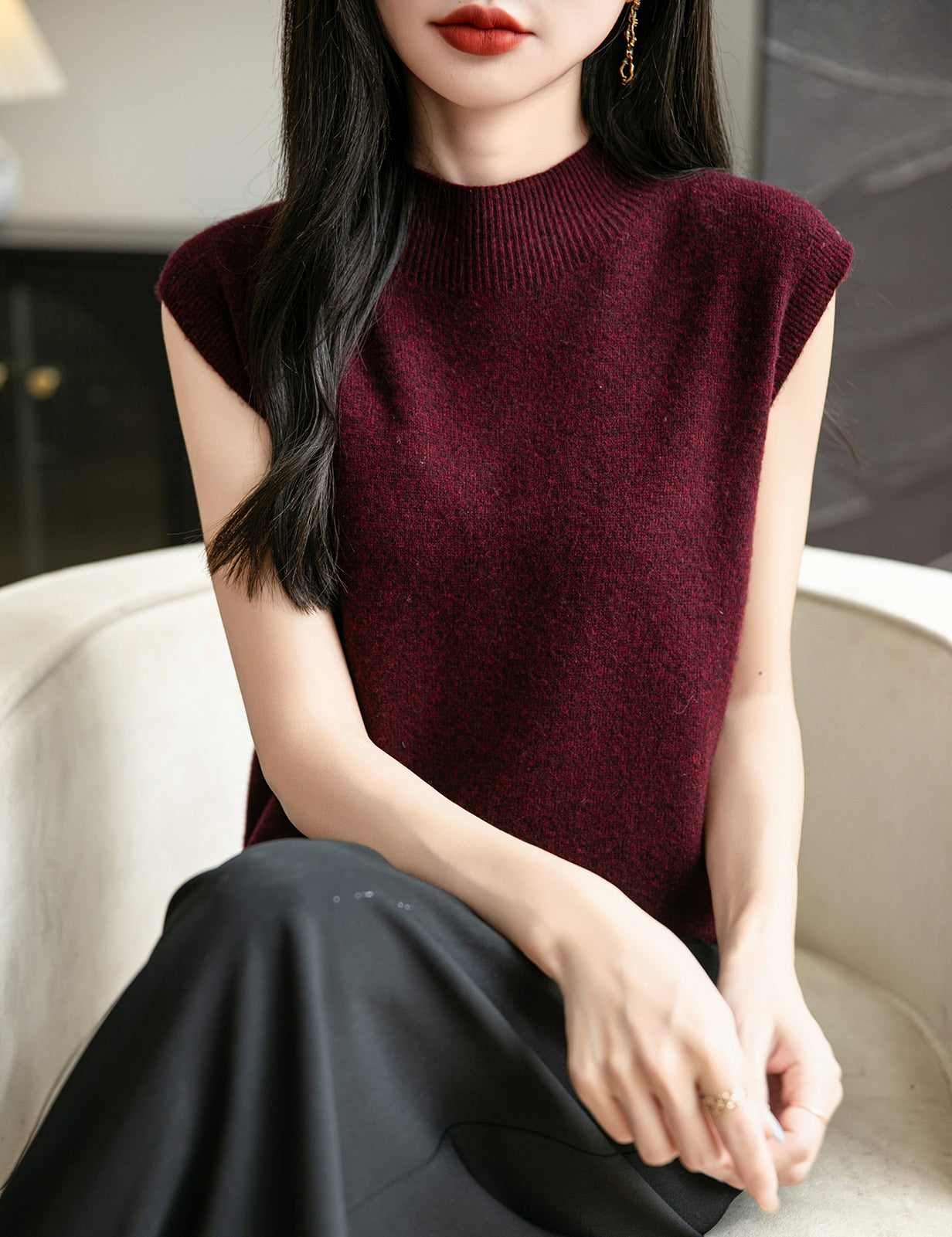 A woman wearing a pink crewneck merino wool sweater with half sleeves, paired with white trousers and accessorized with a long pearl necklace.