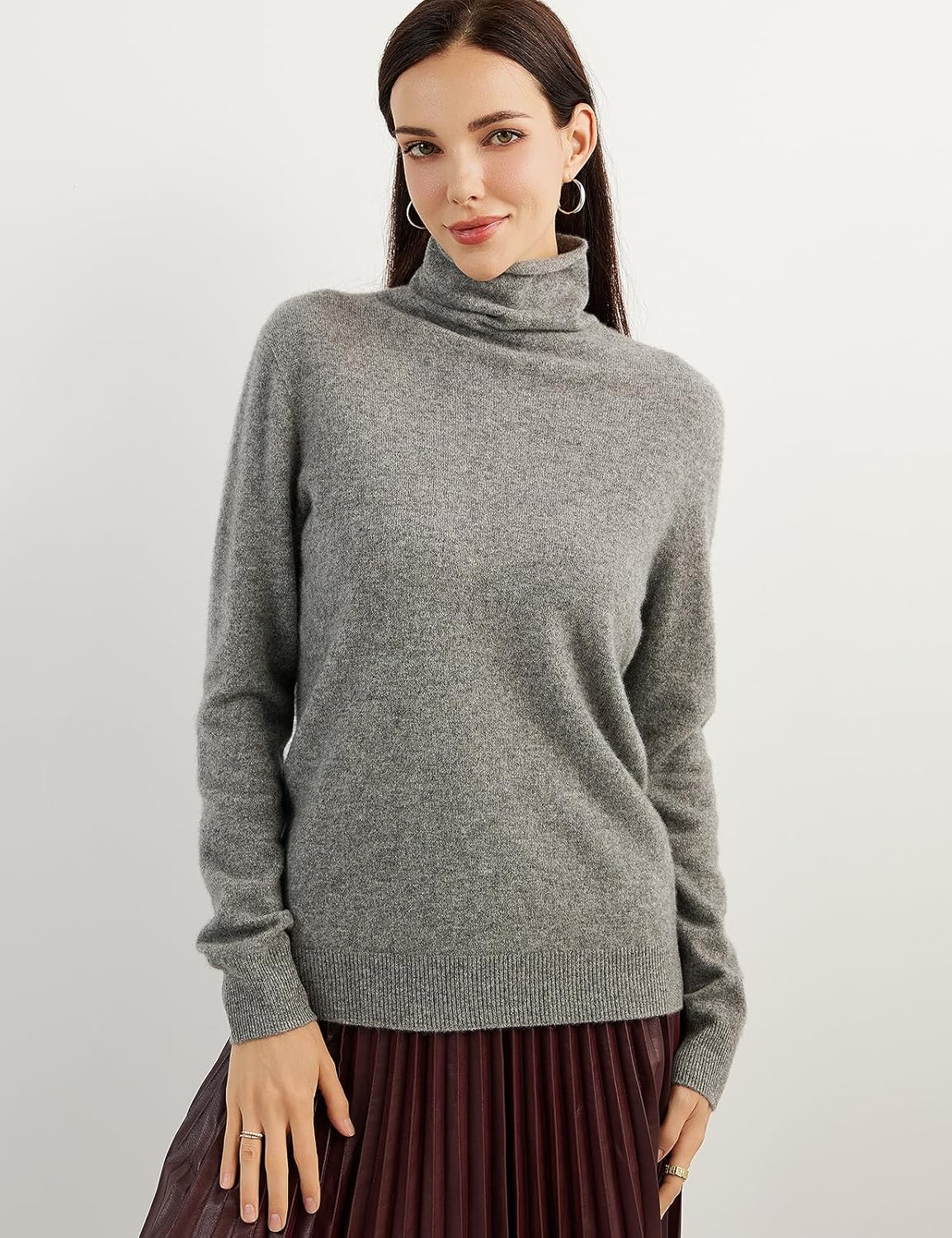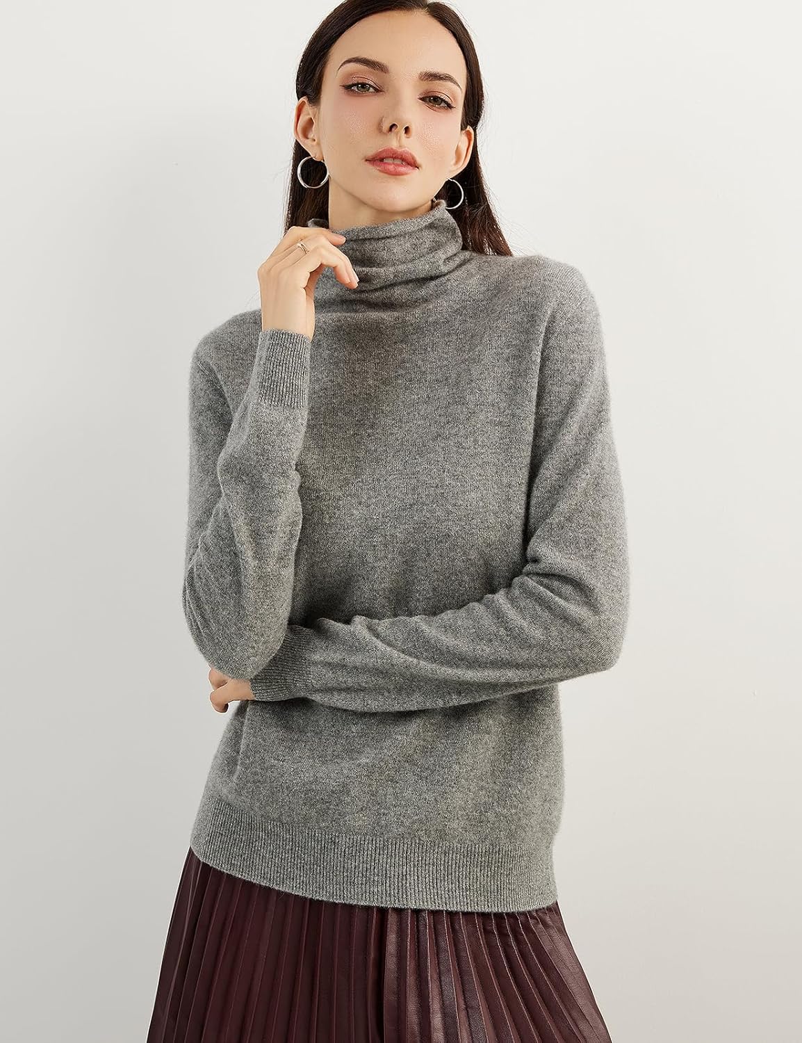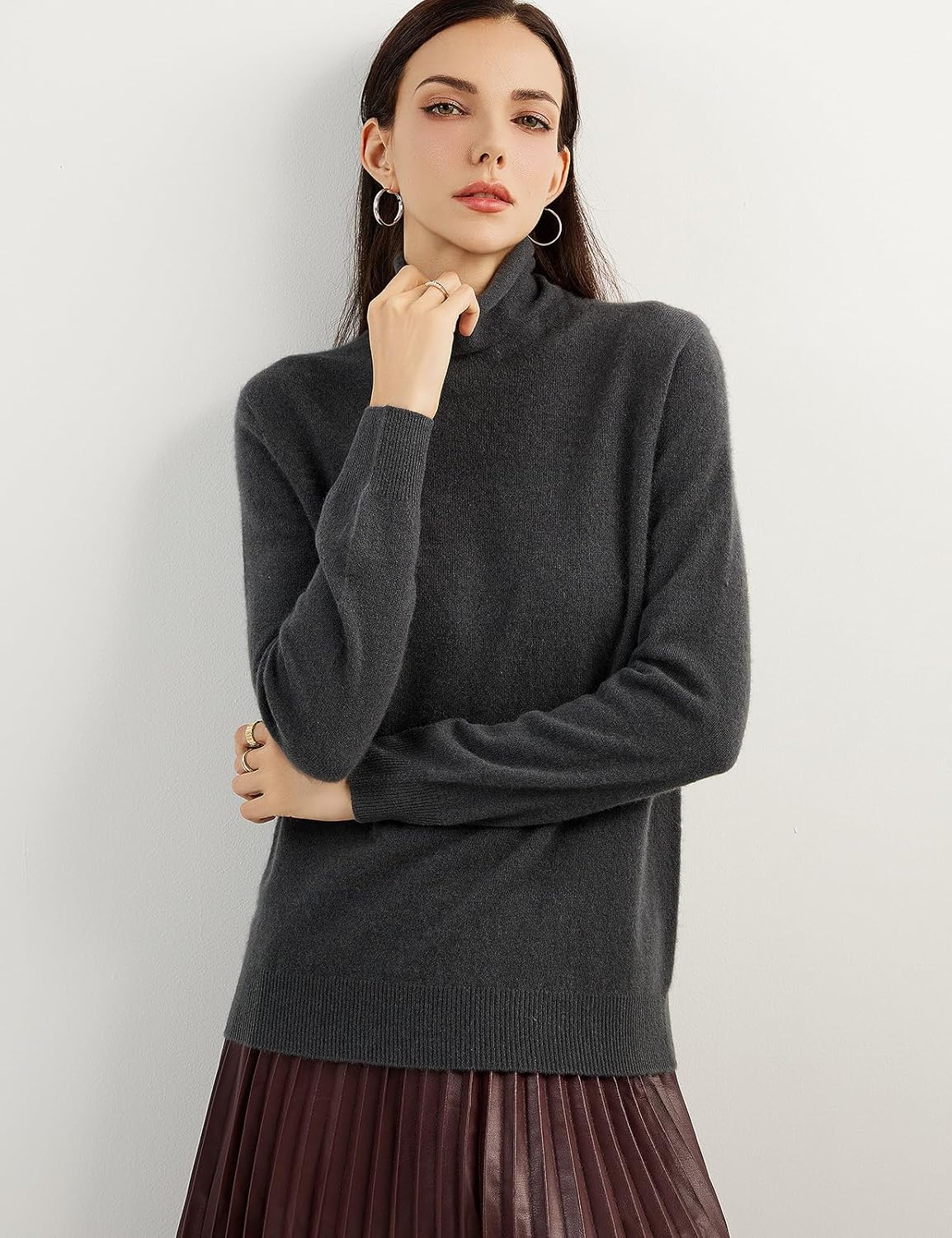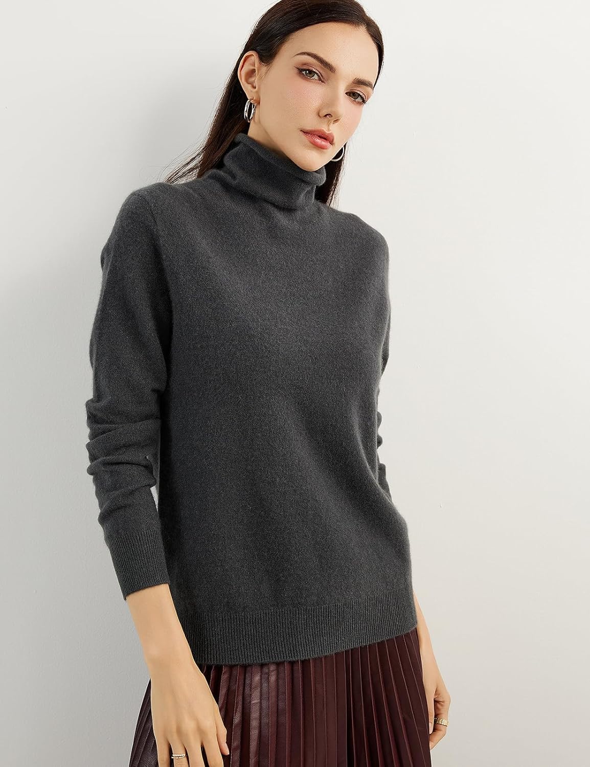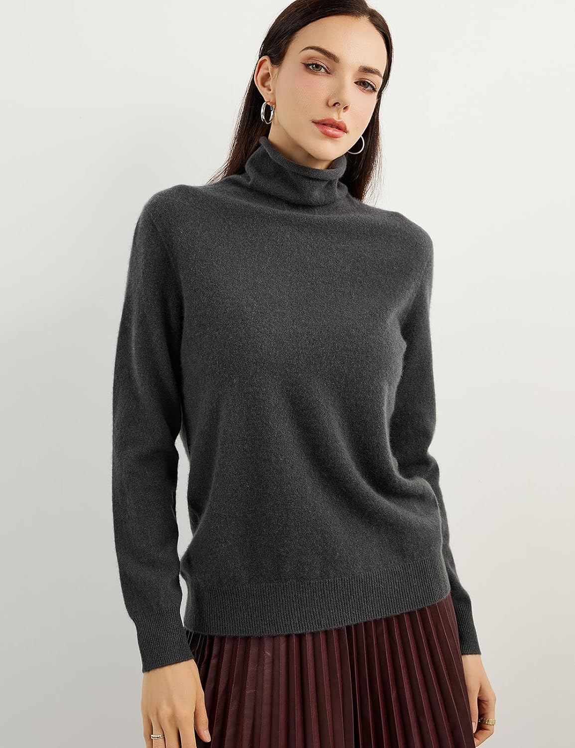 Fine cashmere sweater. Even though turtlenecks are not her thing, my wife still loved this one. It's super soft and fits true to size. Everything about it is nice and warm. The black color is very classy. The price is a little high, but it is cashmere. It makes a fine gift.