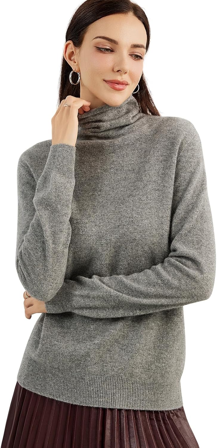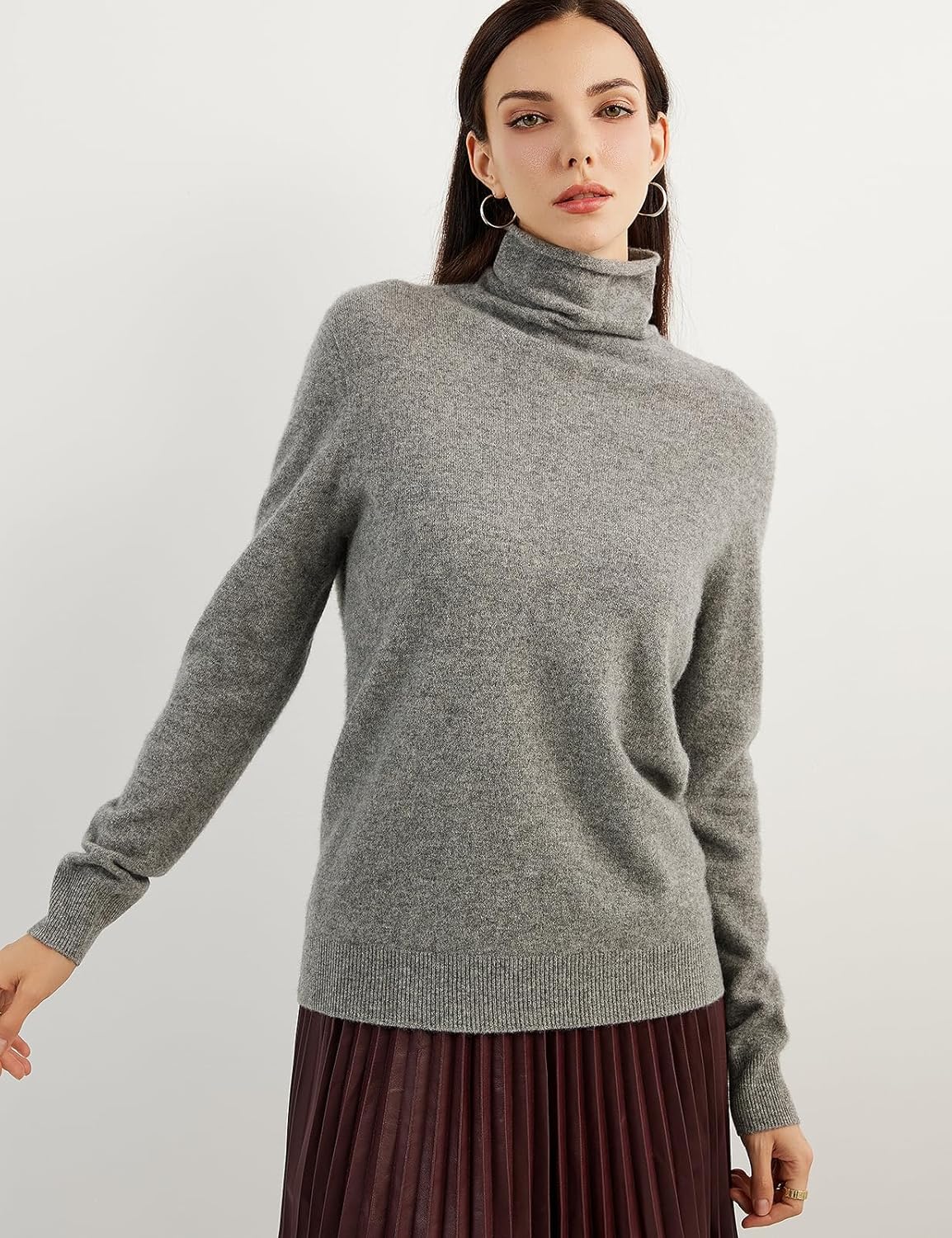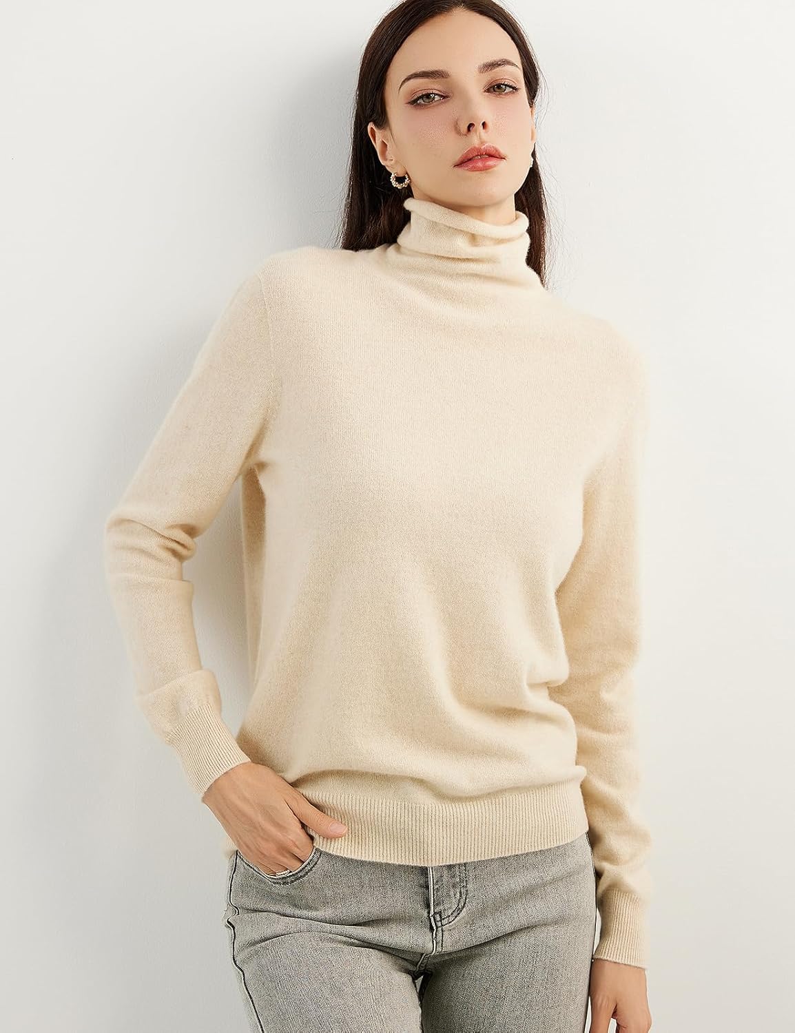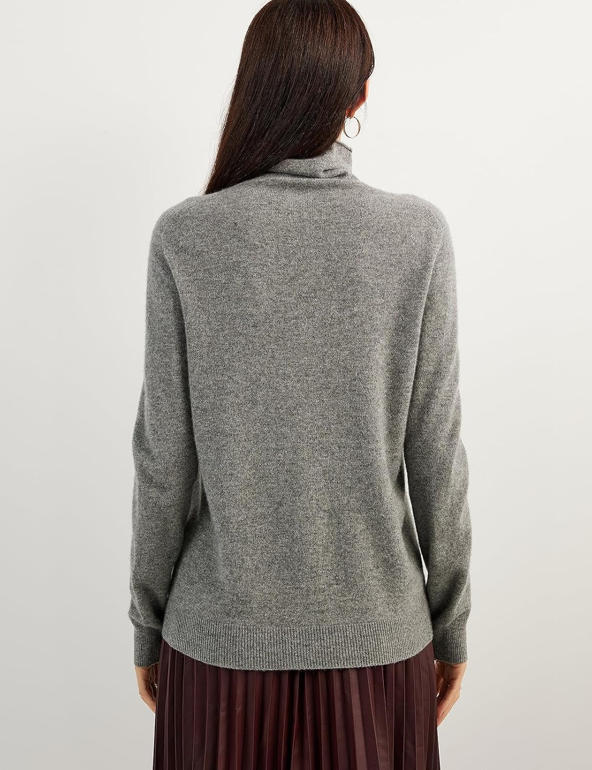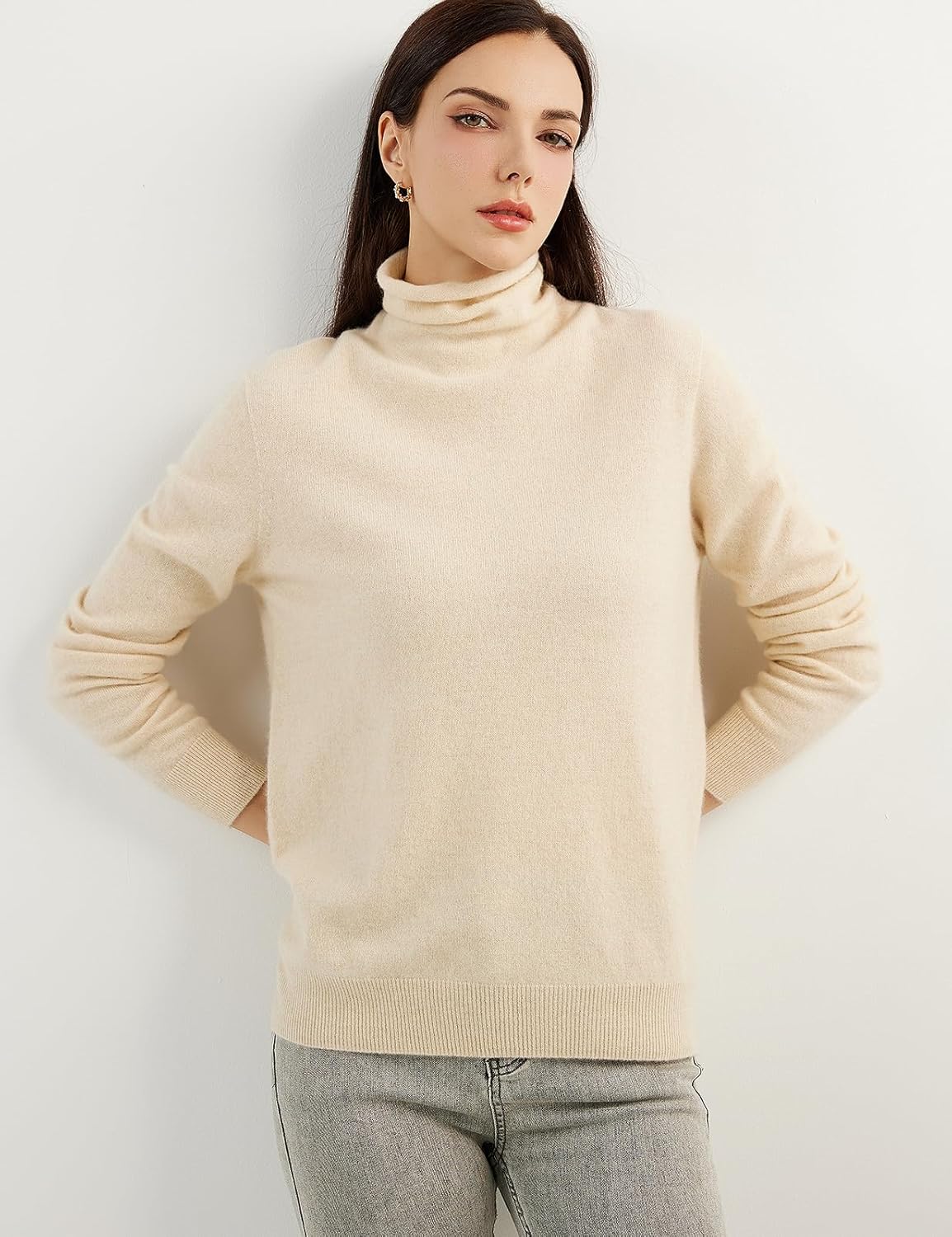 Fine cashmere sweater. Even though turtlenecks are not her thing, my wife still loved this one. It's super soft and fits true to size. Everything about it is nice and warm. The black color is very classy. The price is a little high, but it is cashmere. It makes a fine gift.