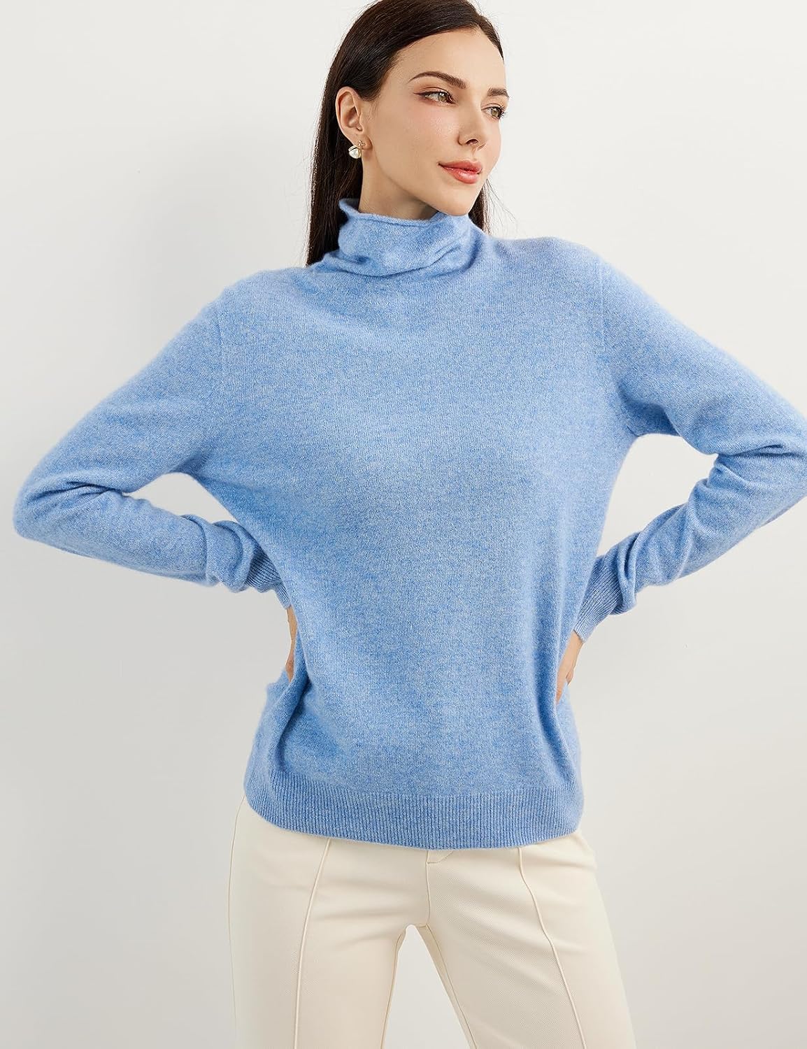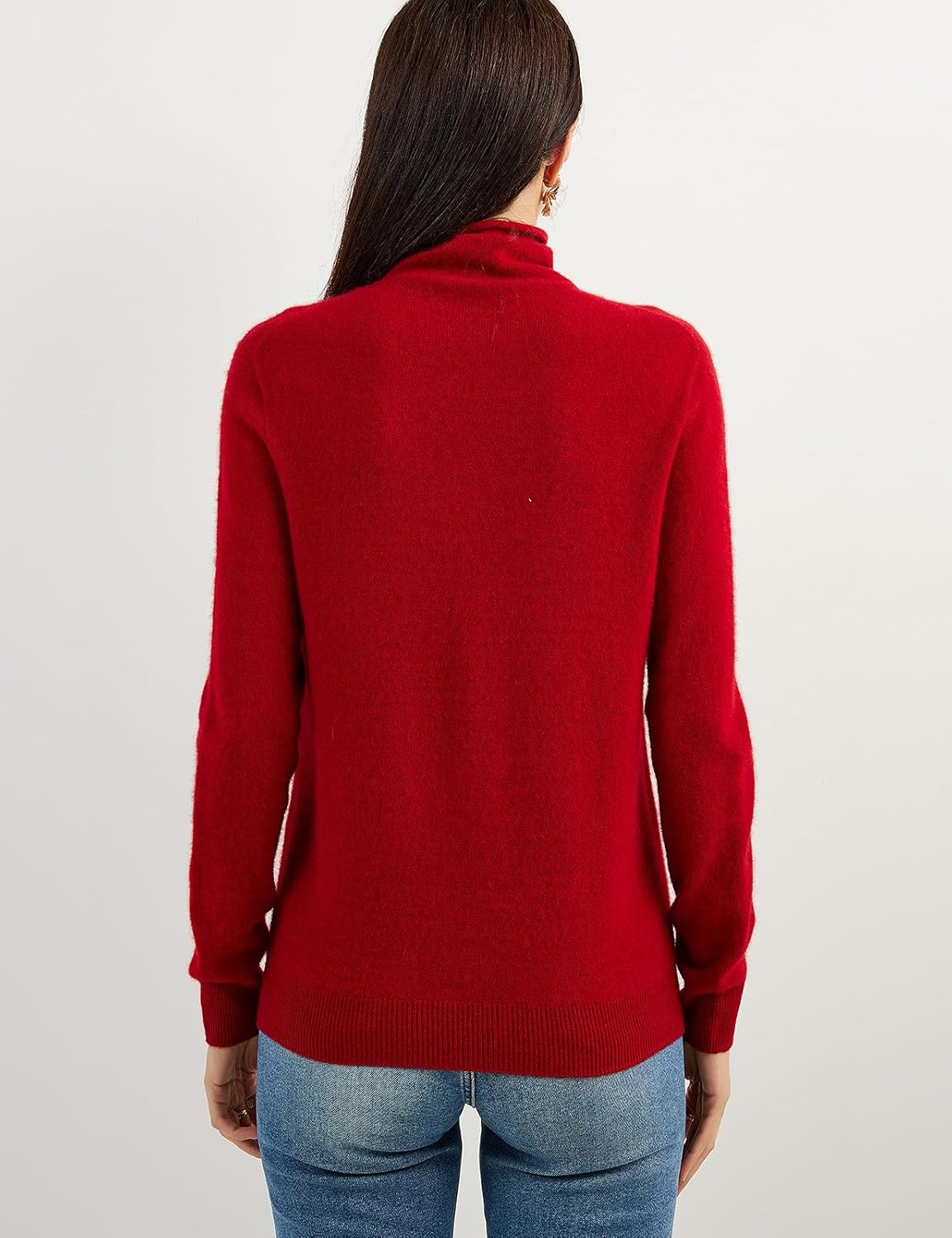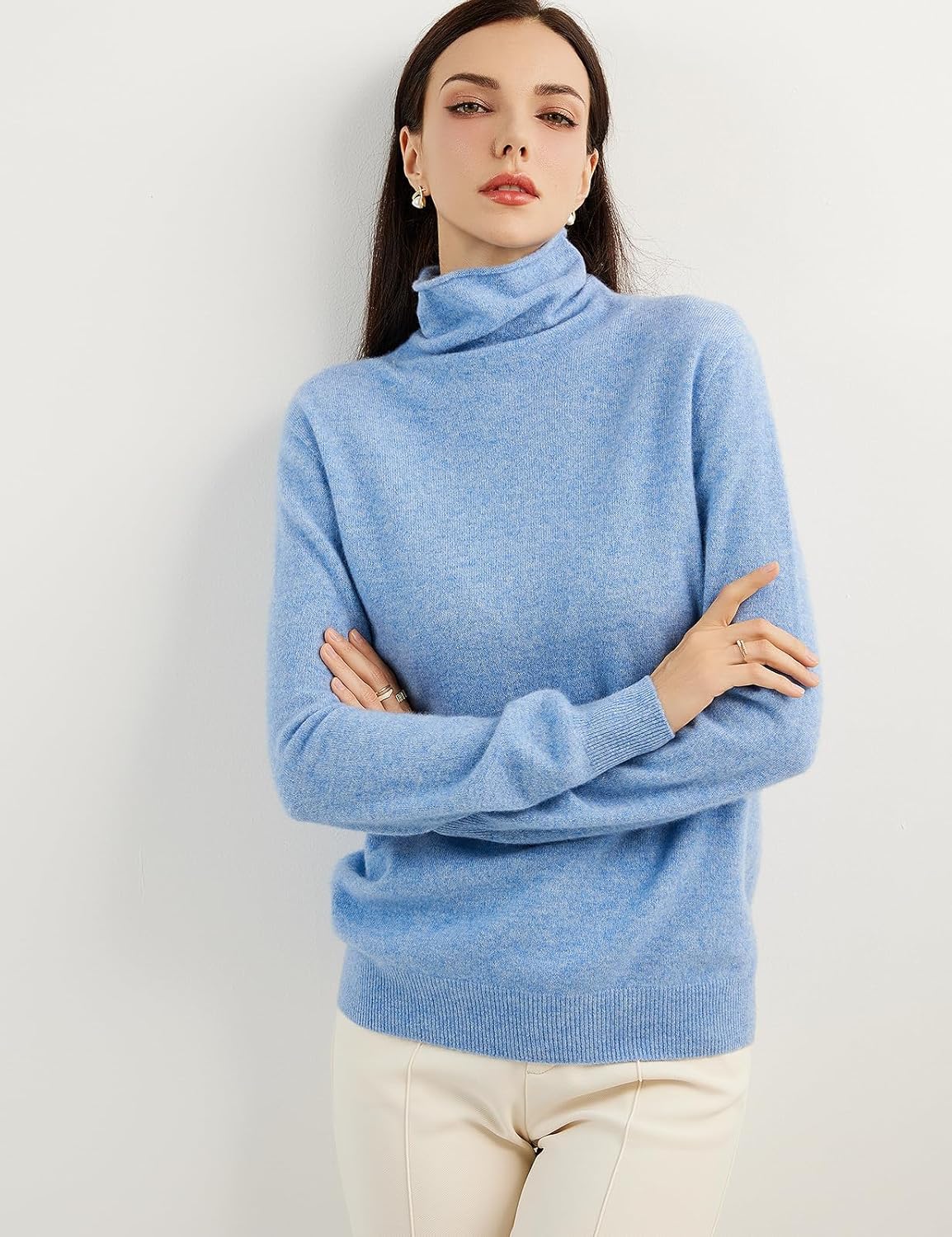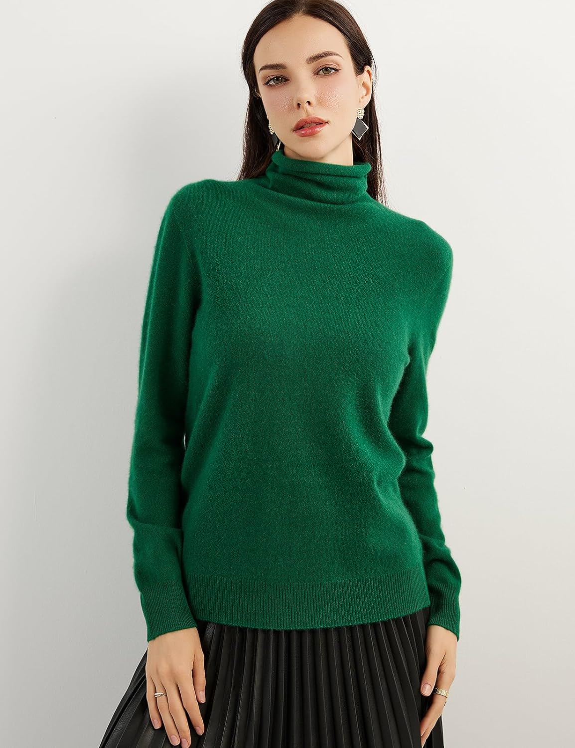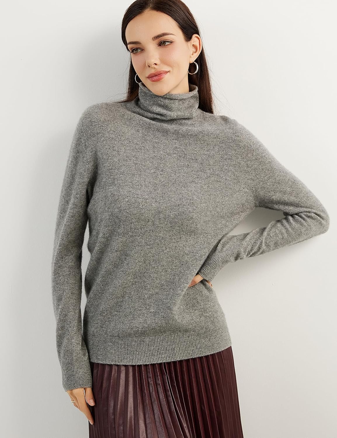 Fine cashmere sweater. Even though turtlenecks are not her thing, my wife still loved this one. It's super soft and fits true to size. Everything about it is nice and warm. The black color is very classy. The price is a little high, but it is cashmere. It makes a fine gift.