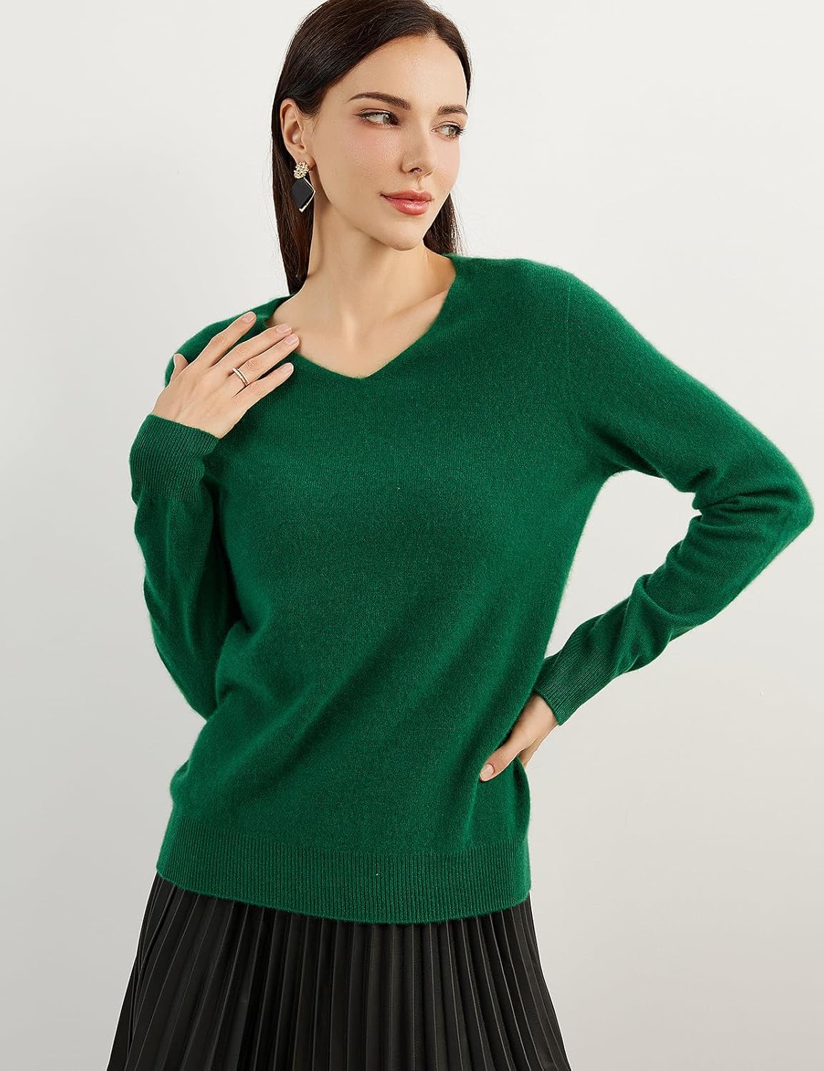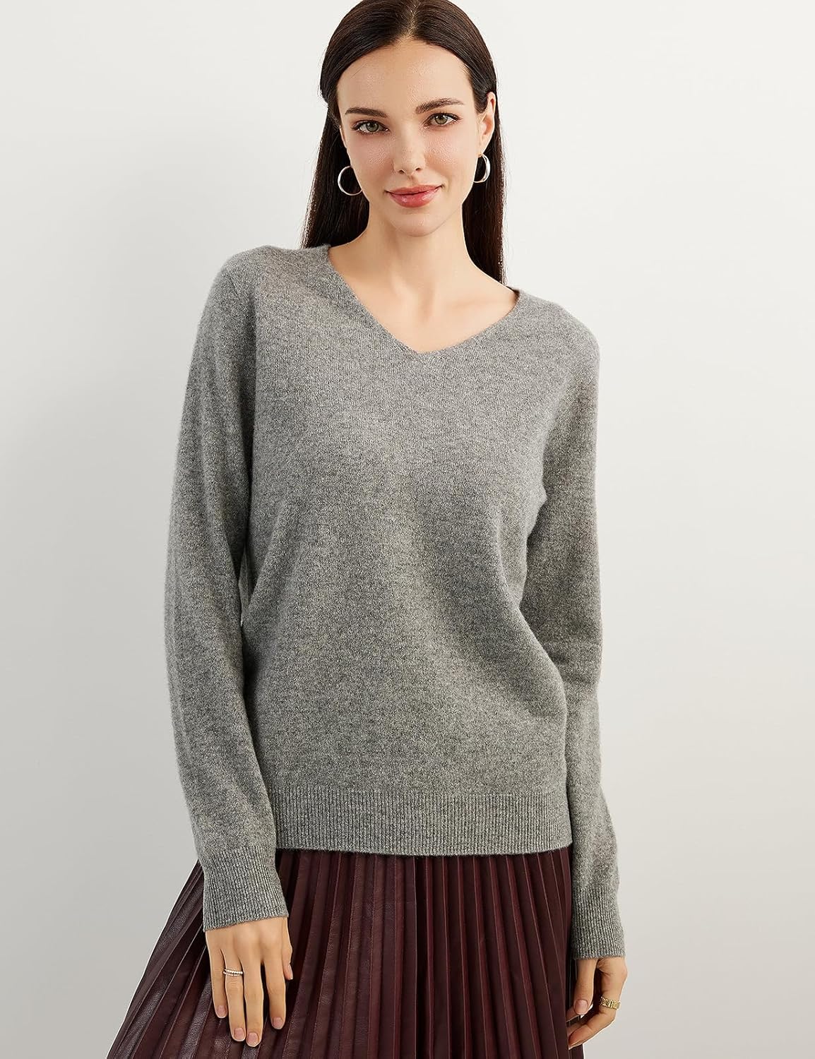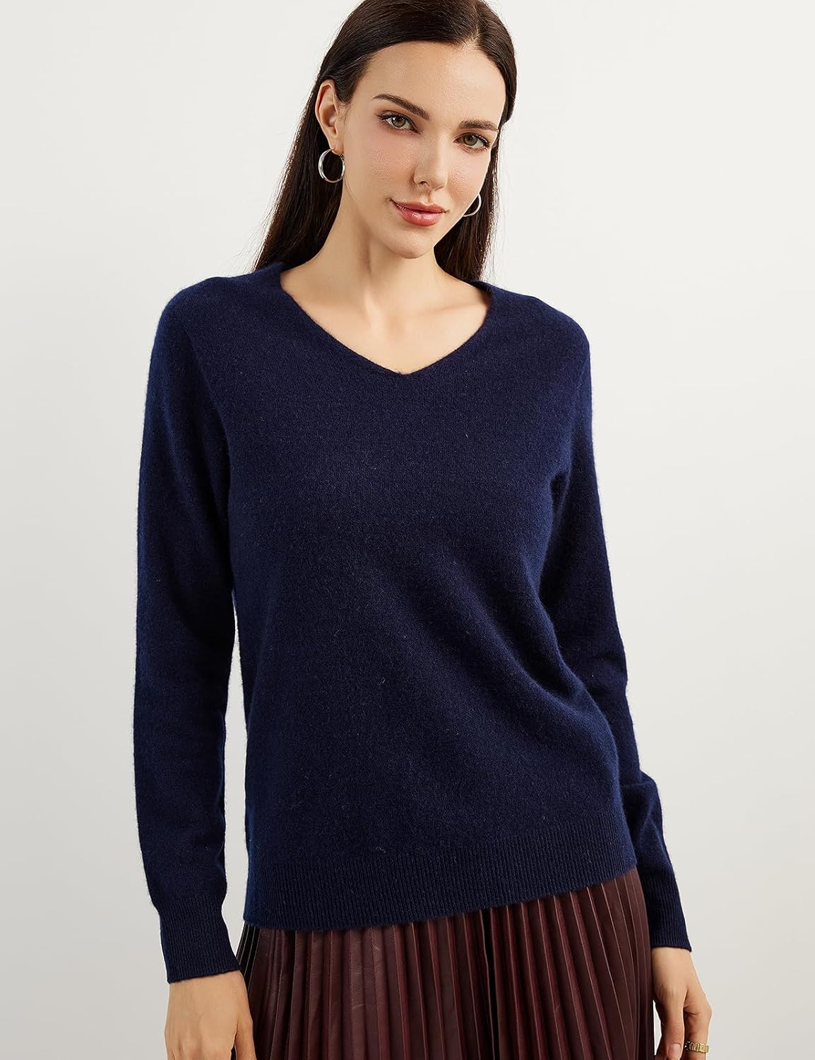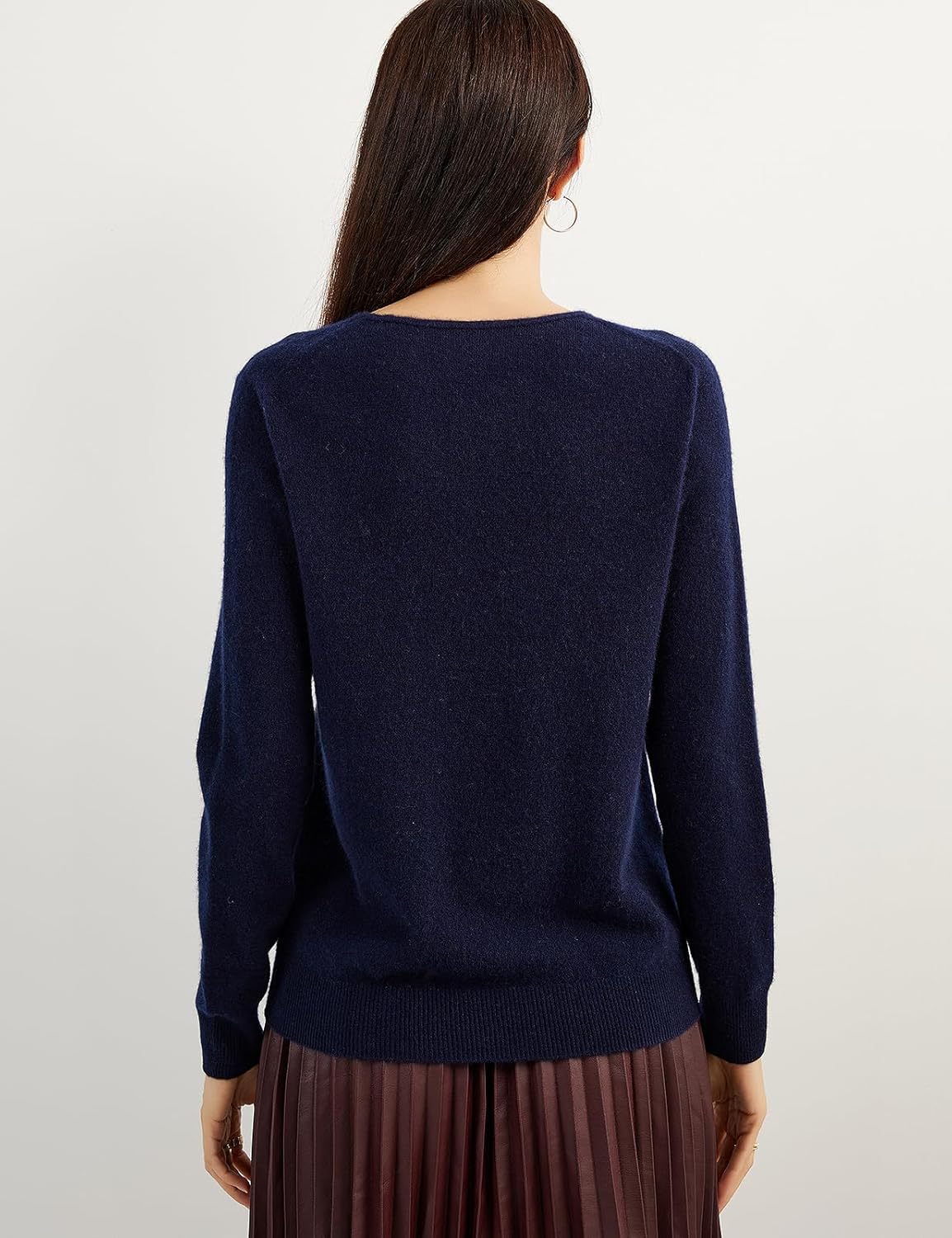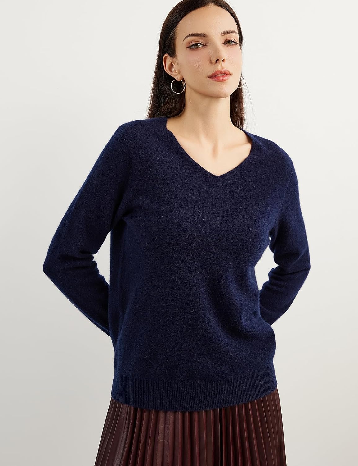 Beautiful, well made, deliciously soft and comfortable black cashmere.The maker uses some kind of unique woven knitting structure that eliminates seams, the whole sweater is woven from one yarn or several strands at one time. This seamless technology eliminates stitches at the shoulders, sides and underarms allowing for ease of movement and stretch and makes for a most incredible fit. .Fits perfectly on my size small wife and she not only looks great in it but she loves it.A great wardrobe addition-cashmere, especially in black goes with everything.Priced right too.