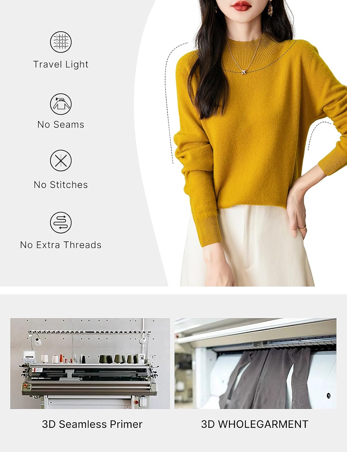 - 3D 심리스 VS 전통 뜨개질: 이 100% 메리노 울 스웨터는 최신 완벽한 심리스 기술을 사용하여 어깨, 옆면 및 겨드랑이 부분의 부피가 크고 성가신 스티치가 없어졌으며 솔기가 더 이상 니트의 자연스러운 탄력을 방해하지 않으므로 더 많이 움직이고 늘릴 수 있습니다. freely.There 절단이나 솔기가 없고, 부드럽고 편안하며 매끄러운 라인으로 착용감이 더욱 편안하고, 착용 시 조이거나 피부에 마찰되는 느낌이 없습니다.