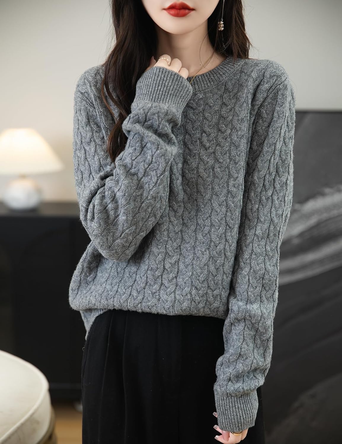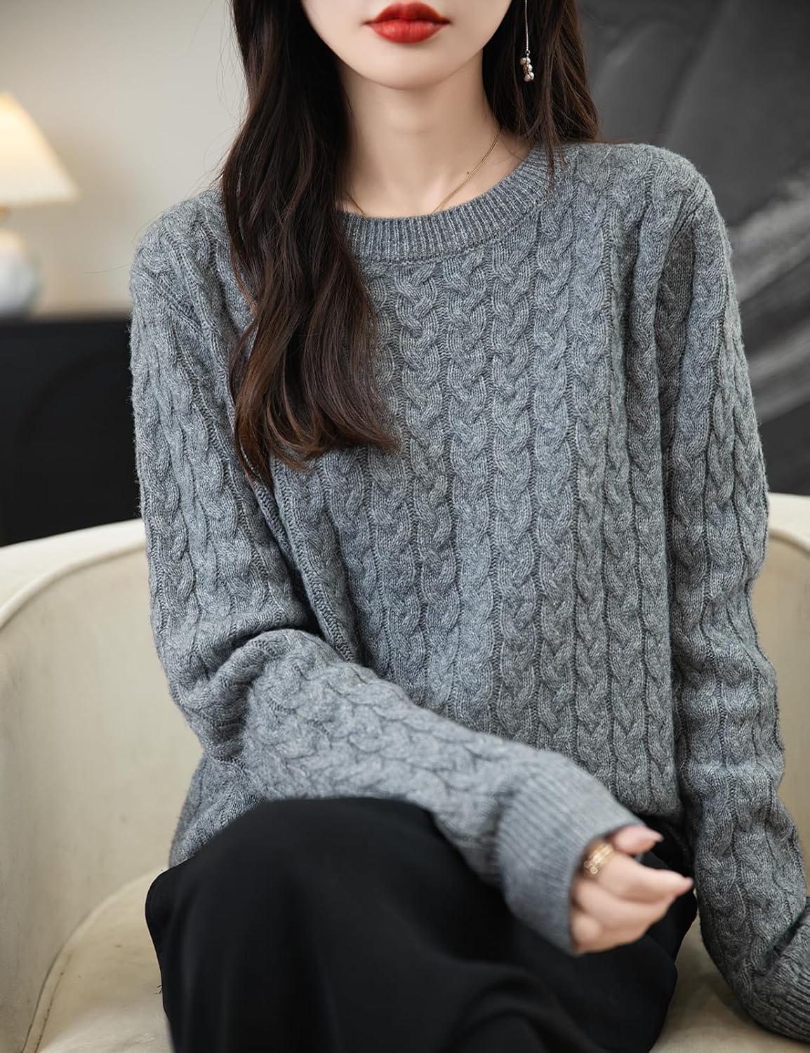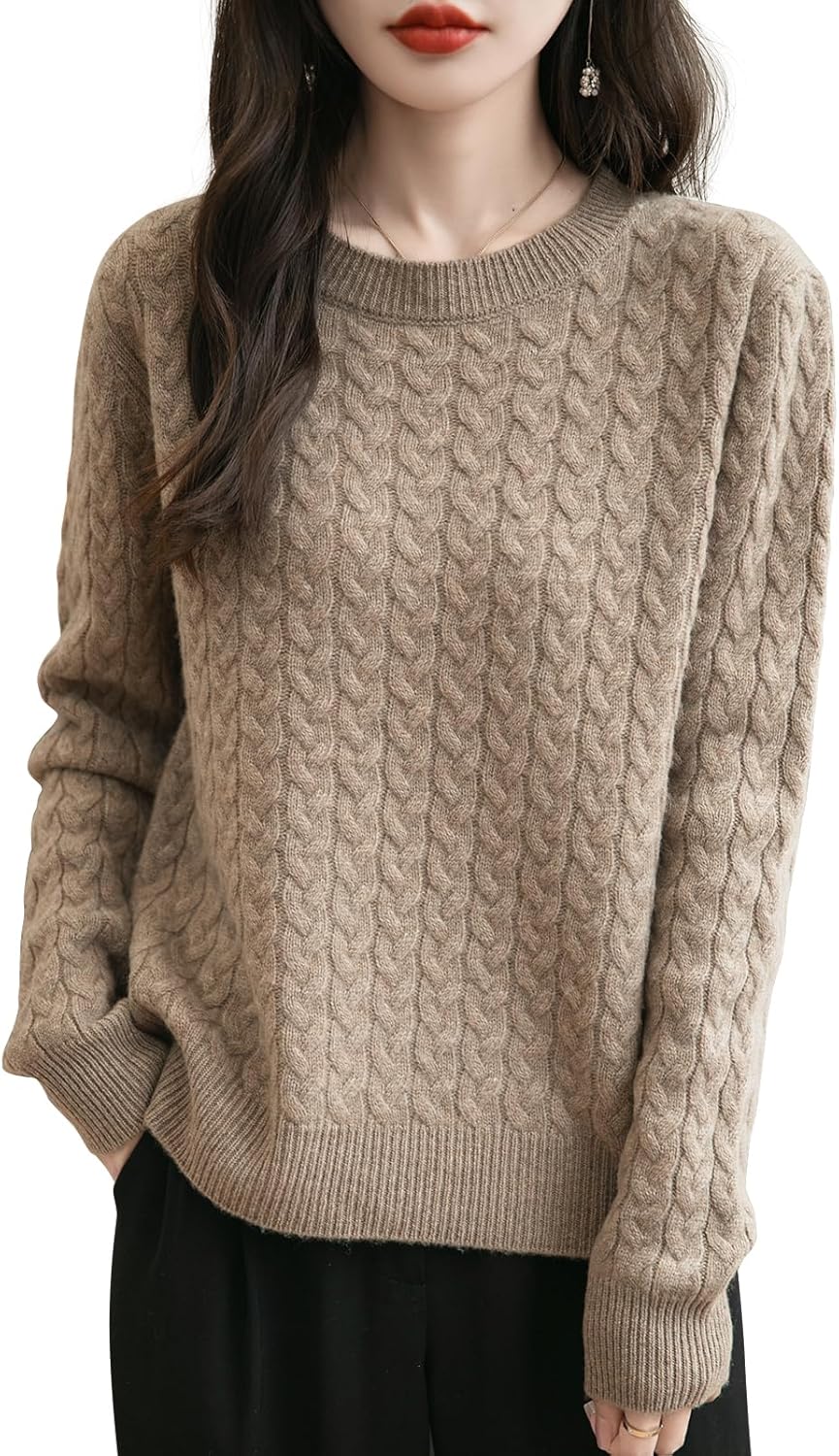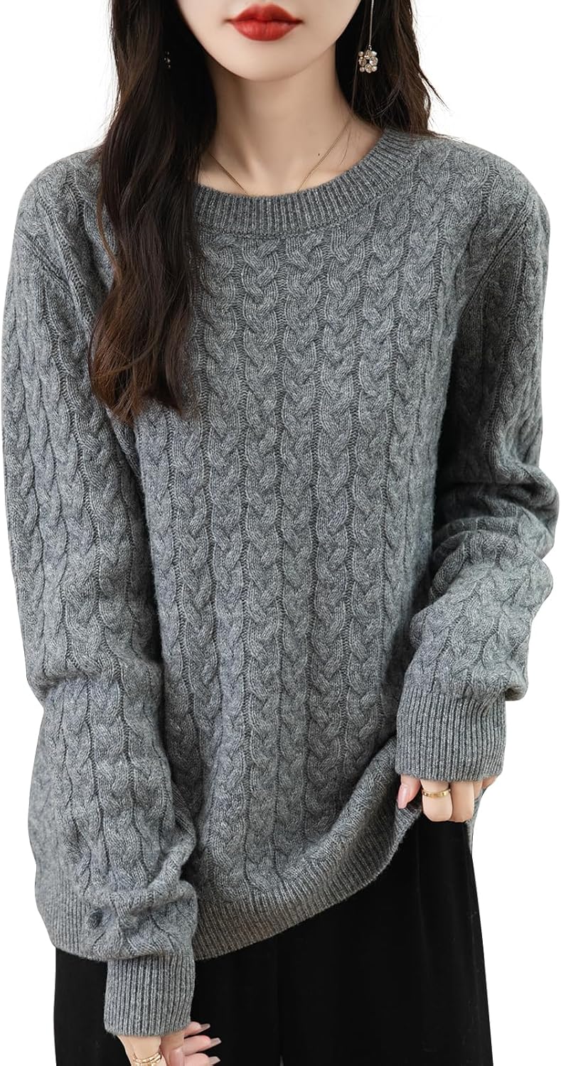 100% 메리노 울 크루넥 케이블 니트 스웨터