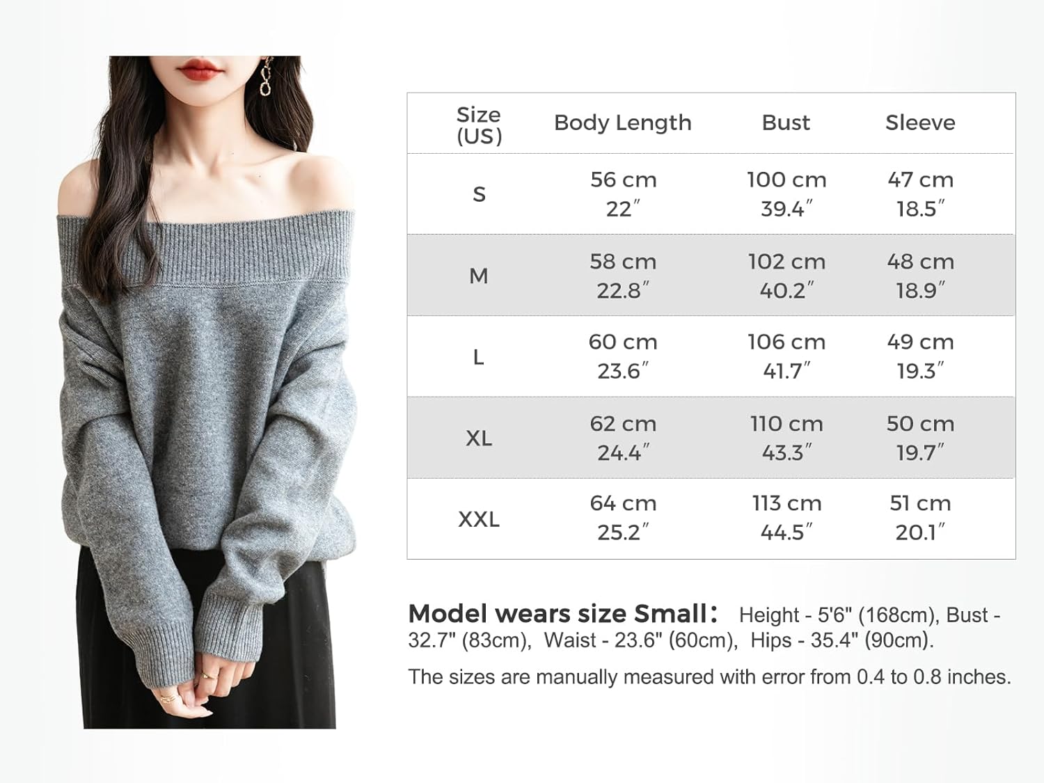 - 특징: 캐주얼 니트 오프숄더 스웨터, 고급 7게이지 원단, 가벼움. 높은 신축성, 부드럽고 편안한 캐주얼 스타일. 루즈핏, 솔리드 컬러, 긴소매 오프숄더, 신축성 있는 골지 네크라인 디자인. 한쪽 어깨 또는 양쪽 어깨에 걸쳐 착용 가능. 이 오프숄더 스웨터는 따뜻함과 동시에 섹시한 룩을 연출해 줍니다!