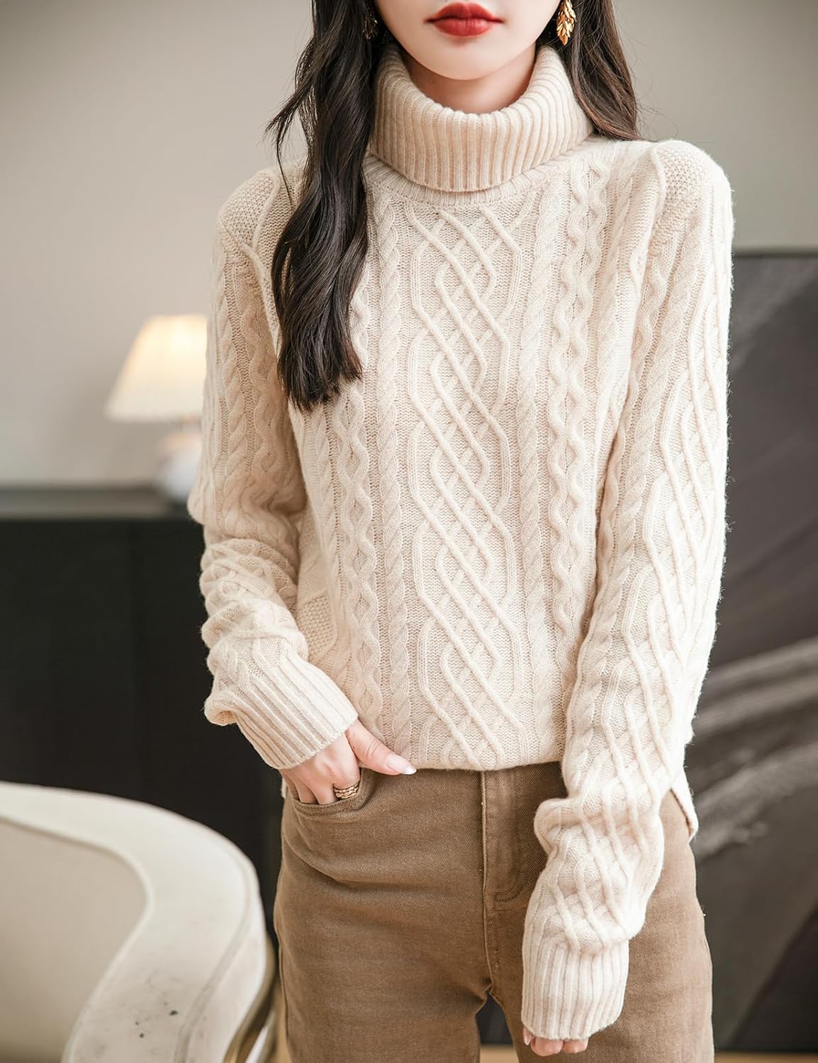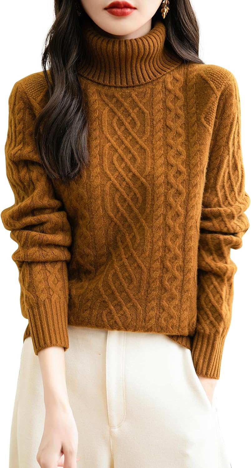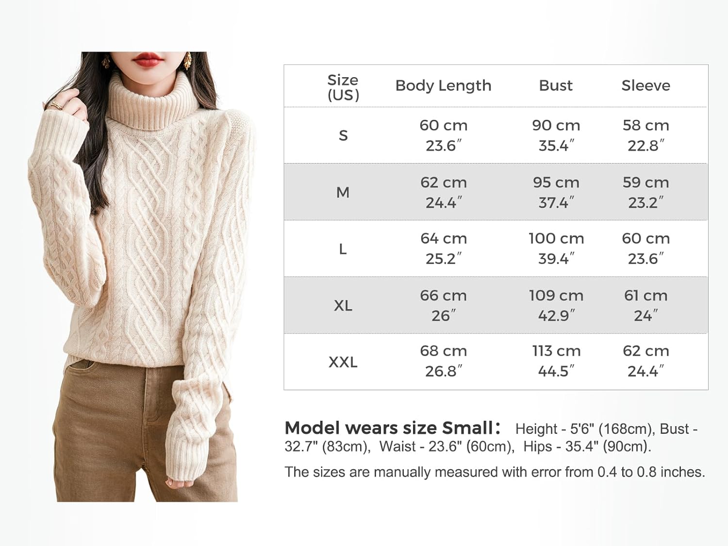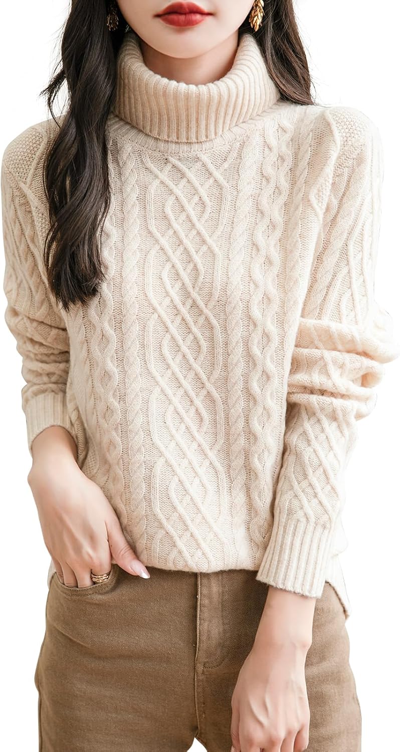 - 특징: 7게이지 고급 원단, 중간 두께. 일반 핏, 단색, 터틀넥, 긴소매, 클래식한 케이블 스티치 디자인, 골지 커프스. 높은 신축성, 캐주얼한 스타일. 가볍고 따뜻하며 부드러워 착용감이 매우 편안합니다. 이 메리노 울 스웨터는 독특한 질감의 패턴이 겨울 옷장에 시각적인 재미와 매력을 더합니다.