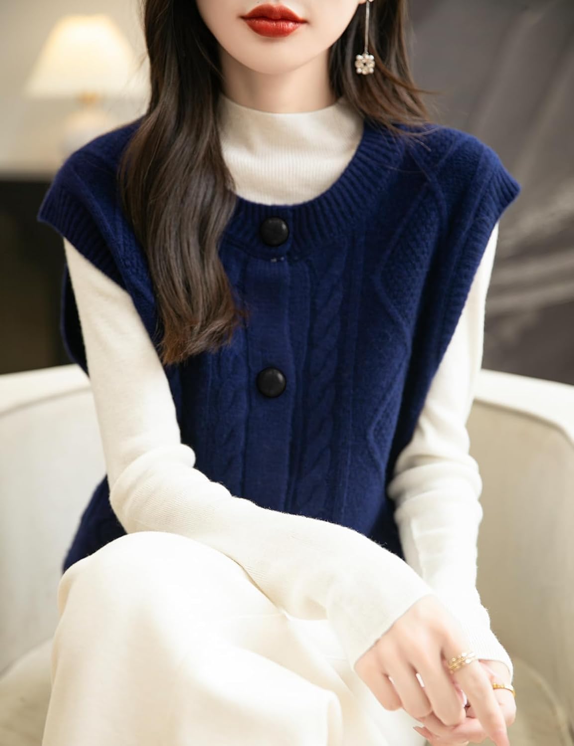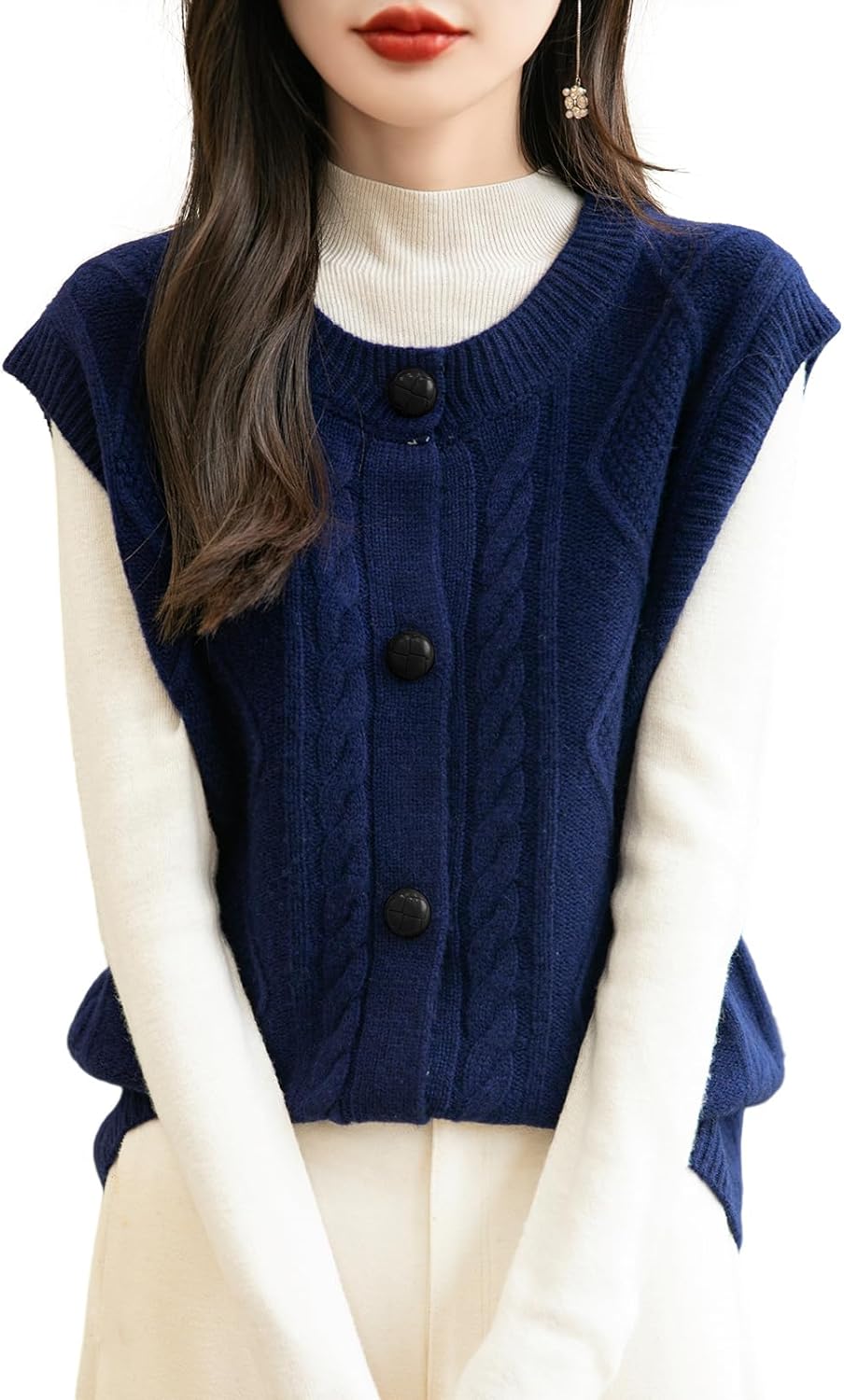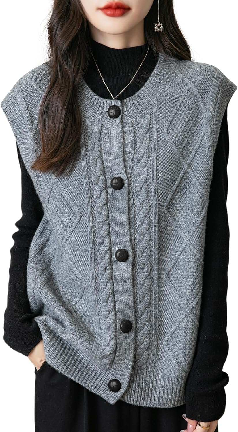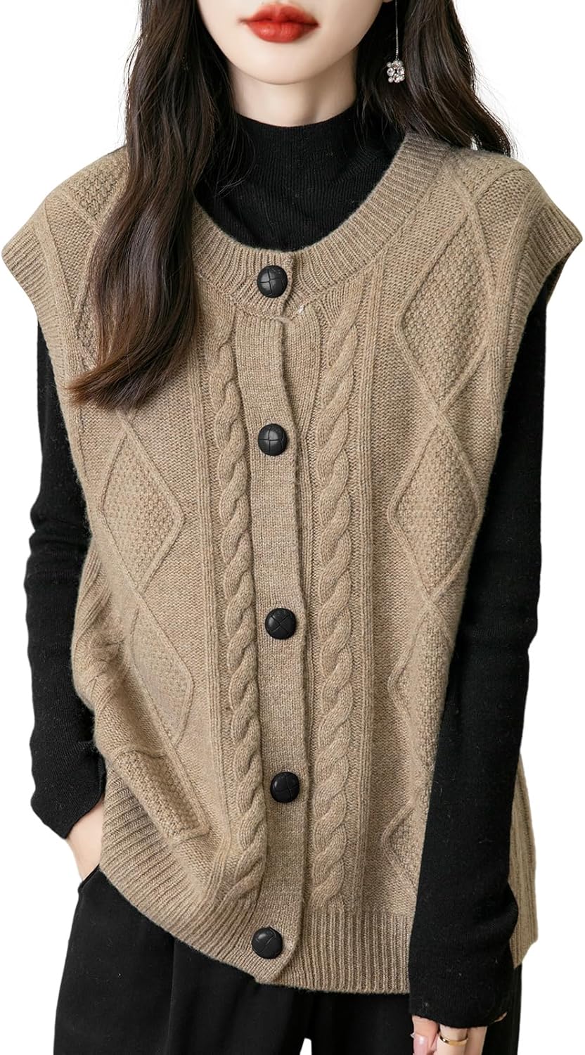 - 특징: 5게이지 고급 원단, 도톰함. 일반 핏, 솔리드 컬러, 크루넥, 슬리브리스, 클래식 케이블 스티치, 버튼다운 디자인. 높은 신축성, 캐주얼 스타일. 가볍고 따뜻하며 부드럽고 착용감이 매우 편안합니다. 이 여성용 기본 슬리브리스 스웨터 베스트는 모든 여성에게 캐주얼하면서도 트렌디한 룩을 연출하는 필수 아이템입니다.