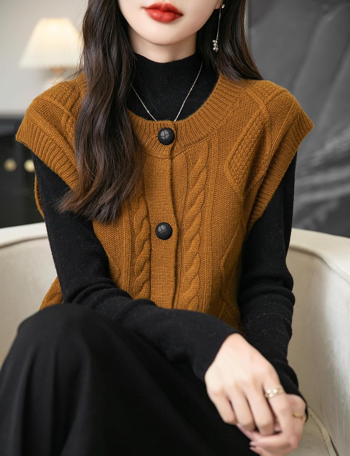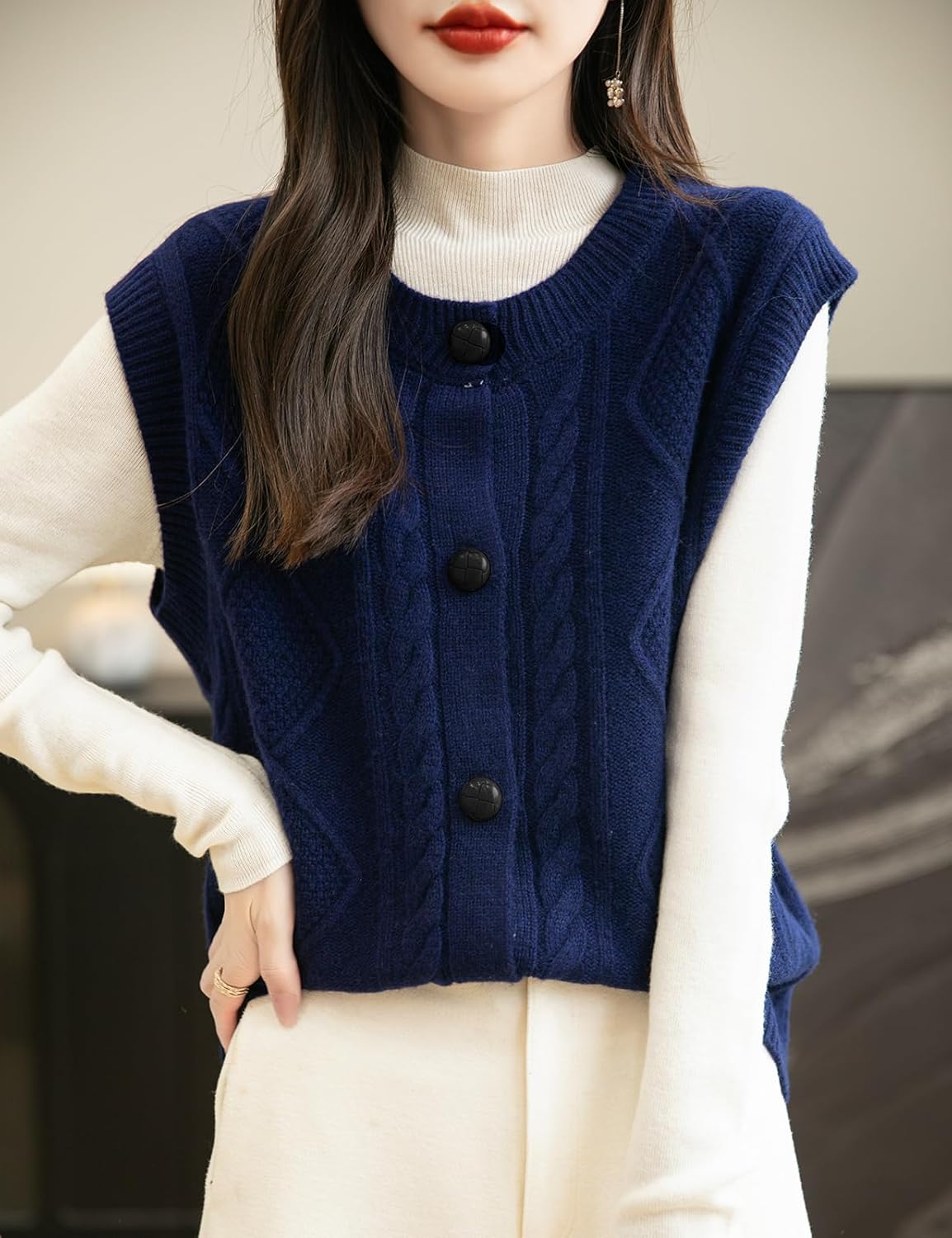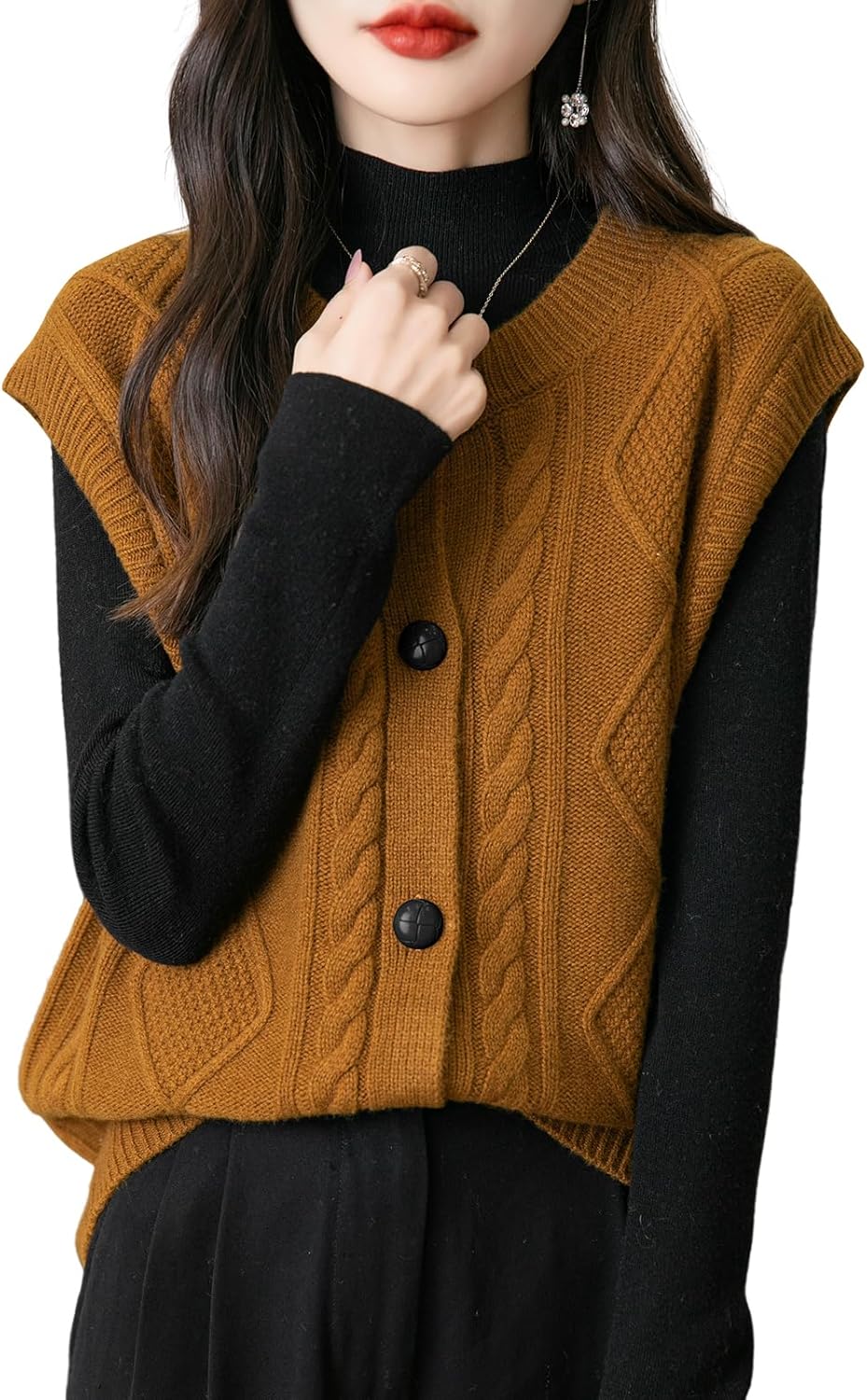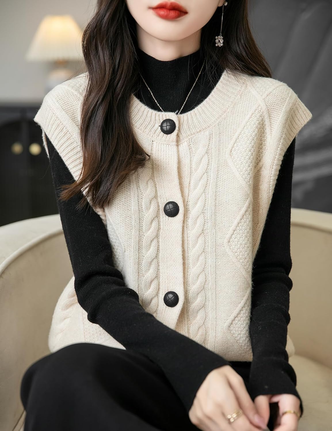 - 특징: 5게이지 고급 원단, 도톰함. 일반 핏, 솔리드 컬러, 크루넥, 슬리브리스, 클래식 케이블 스티치, 버튼다운 디자인. 높은 신축성, 캐주얼 스타일. 가볍고 따뜻하며 부드럽고 착용감이 매우 편안합니다. 이 여성용 기본 슬리브리스 스웨터 베스트는 모든 여성에게 캐주얼하면서도 트렌디한 룩을 연출하는 필수 아이템입니다.