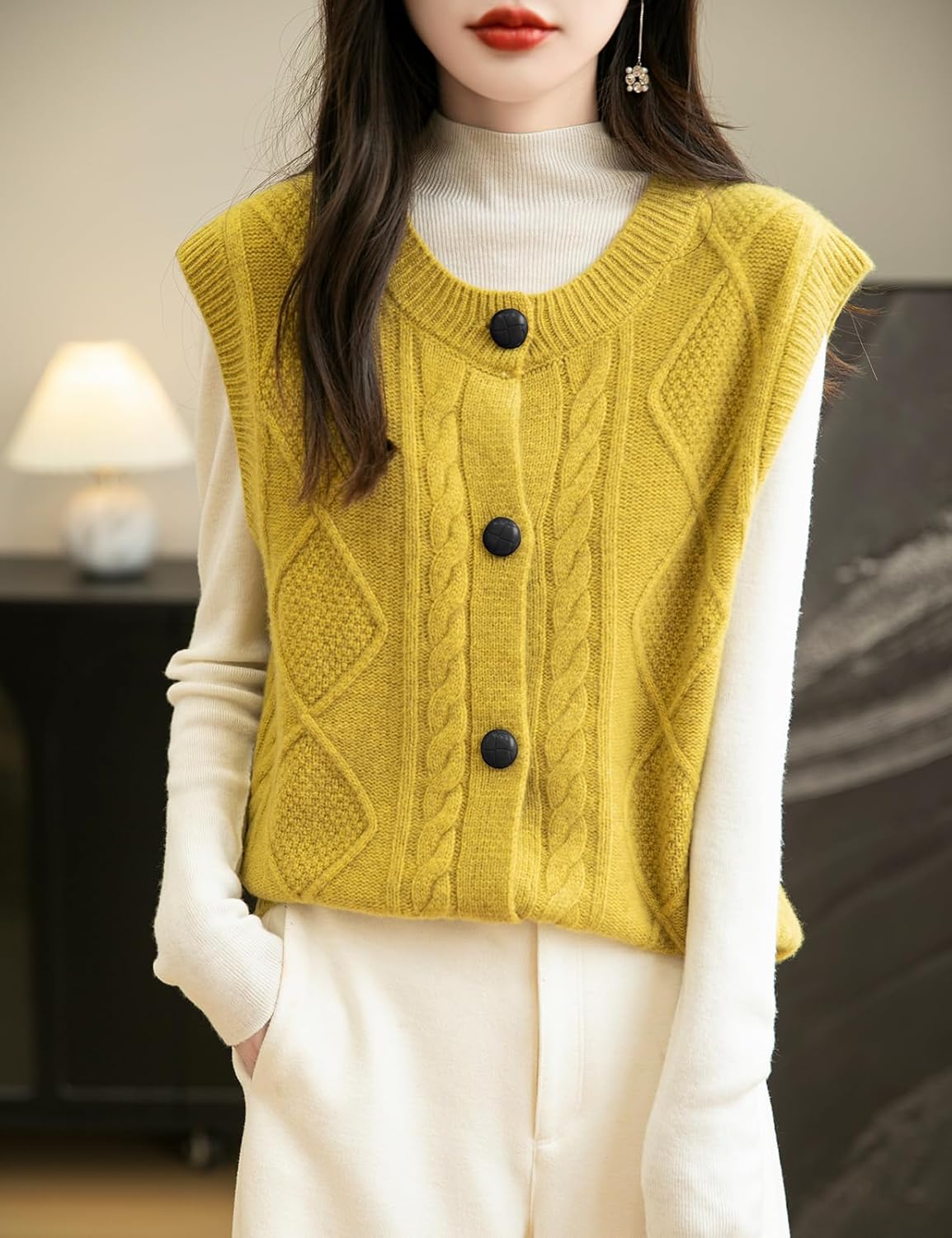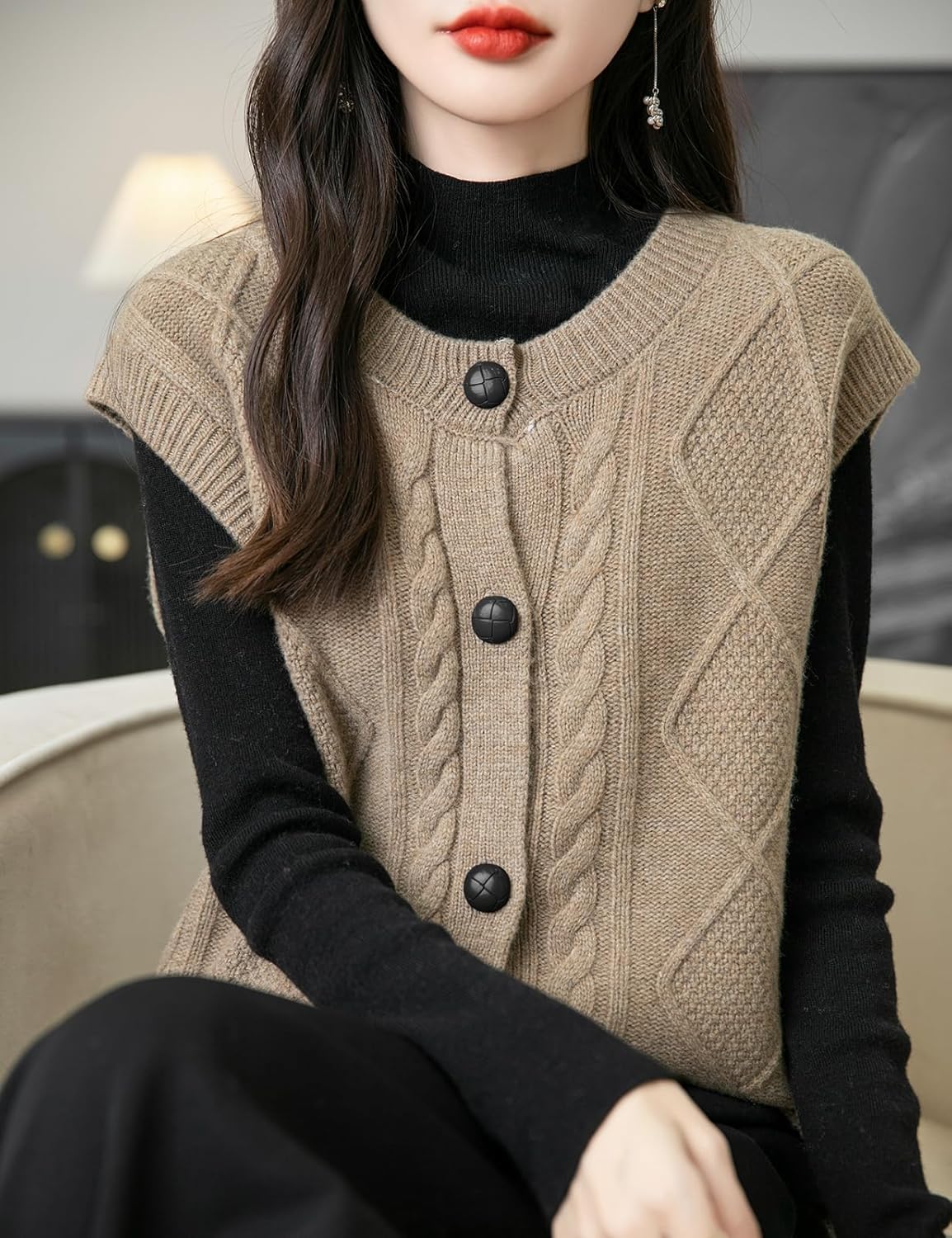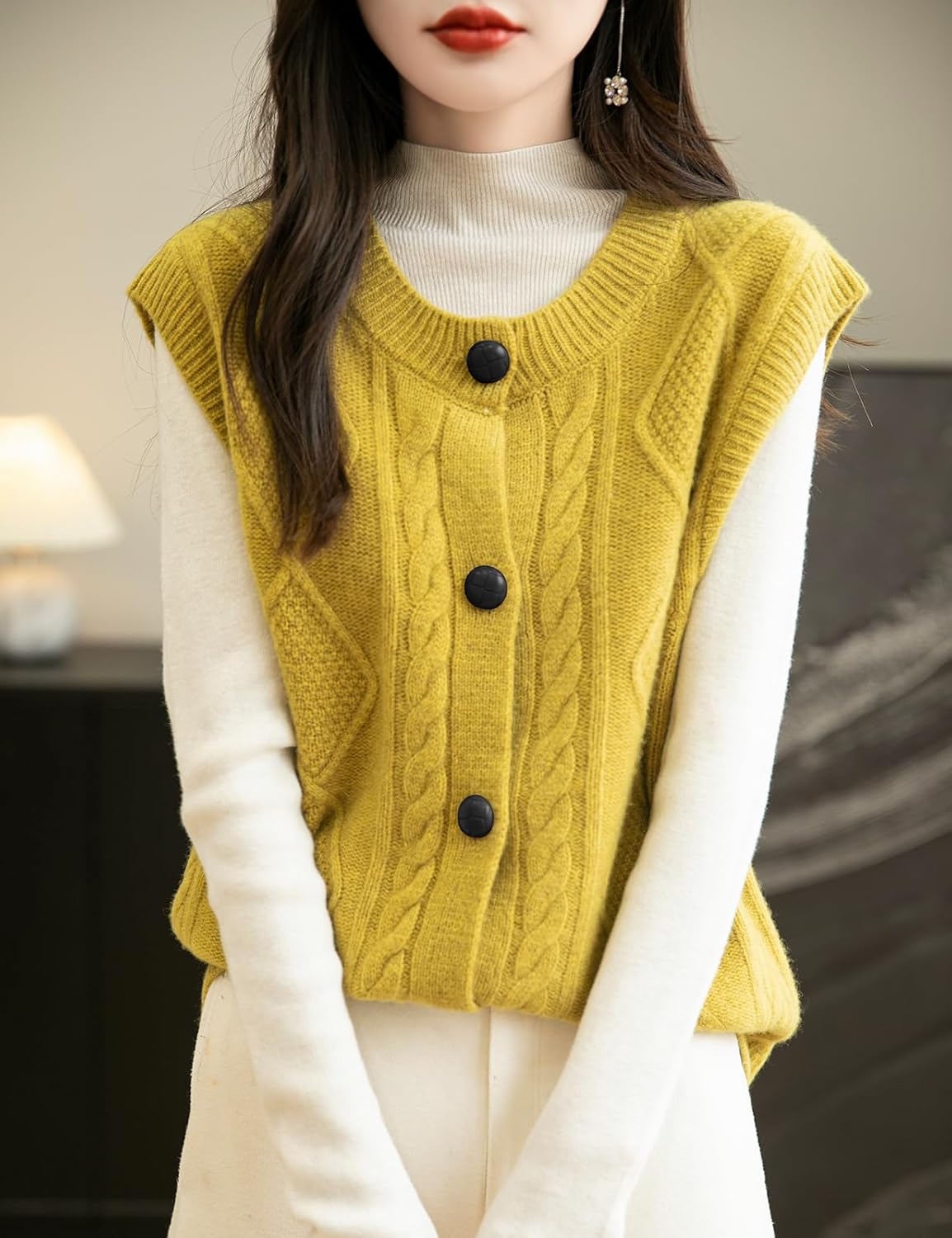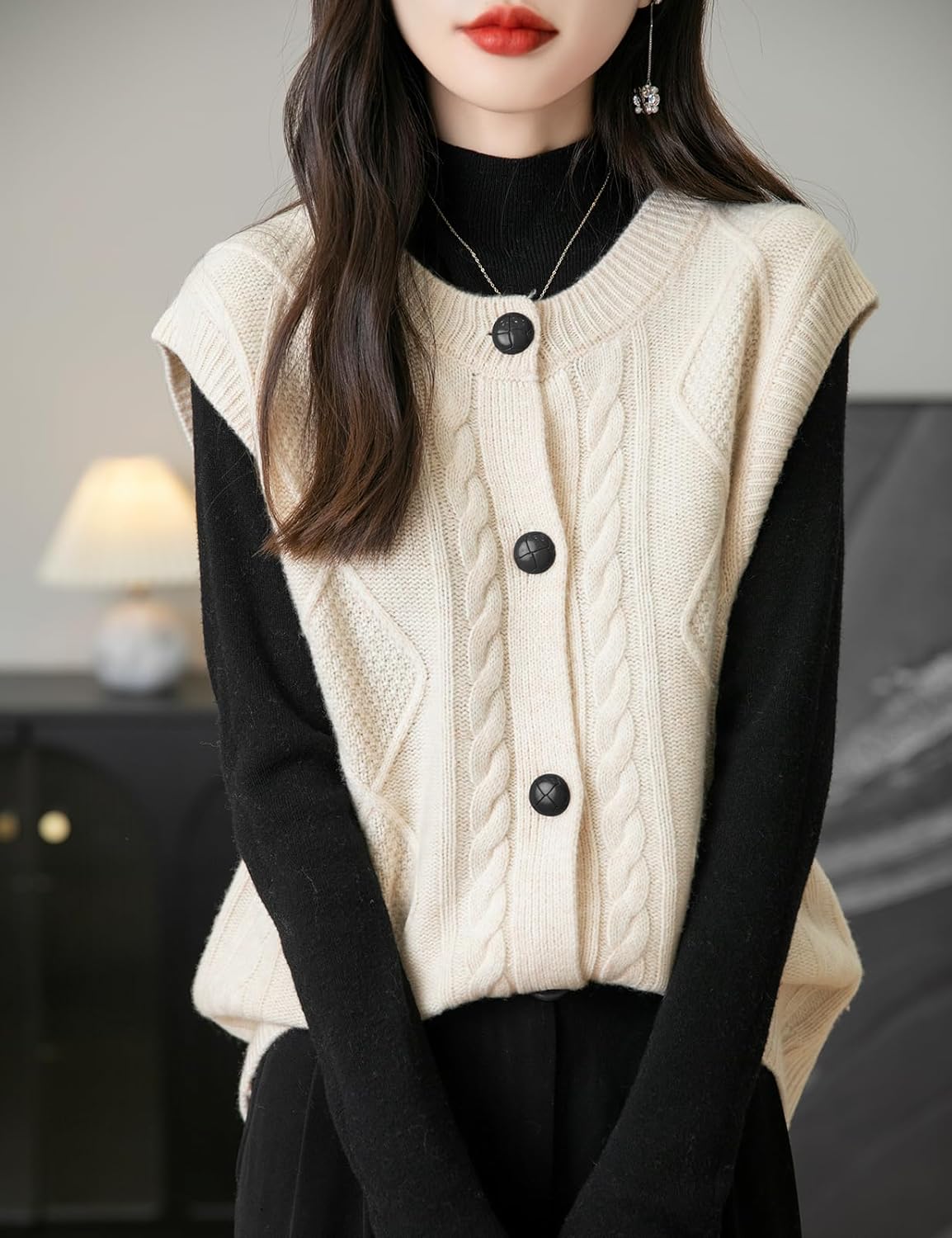 - 특징: 5게이지 고급 원단, 도톰함. 일반 핏, 솔리드 컬러, 크루넥, 슬리브리스, 클래식 케이블 스티치, 버튼다운 디자인. 높은 신축성, 캐주얼 스타일. 가볍고 따뜻하며 부드럽고 착용감이 매우 편안합니다. 이 여성용 기본 슬리브리스 스웨터 베스트는 모든 여성에게 캐주얼하면서도 트렌디한 룩을 연출하는 필수 아이템입니다.