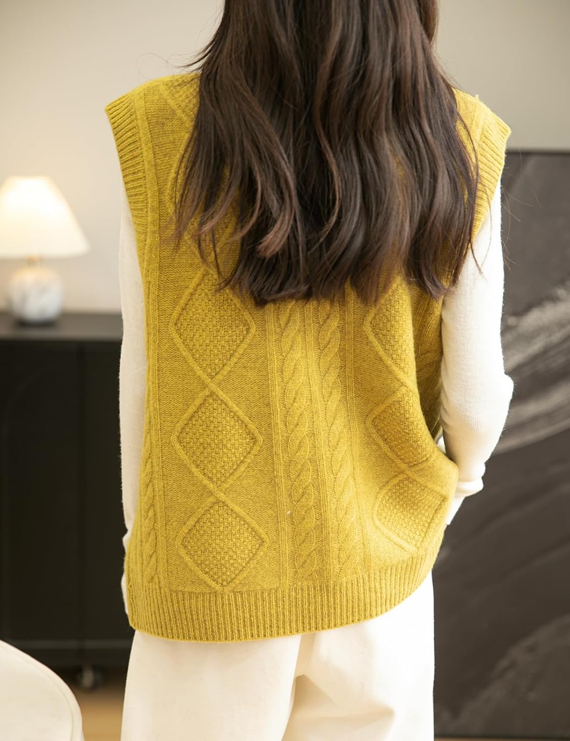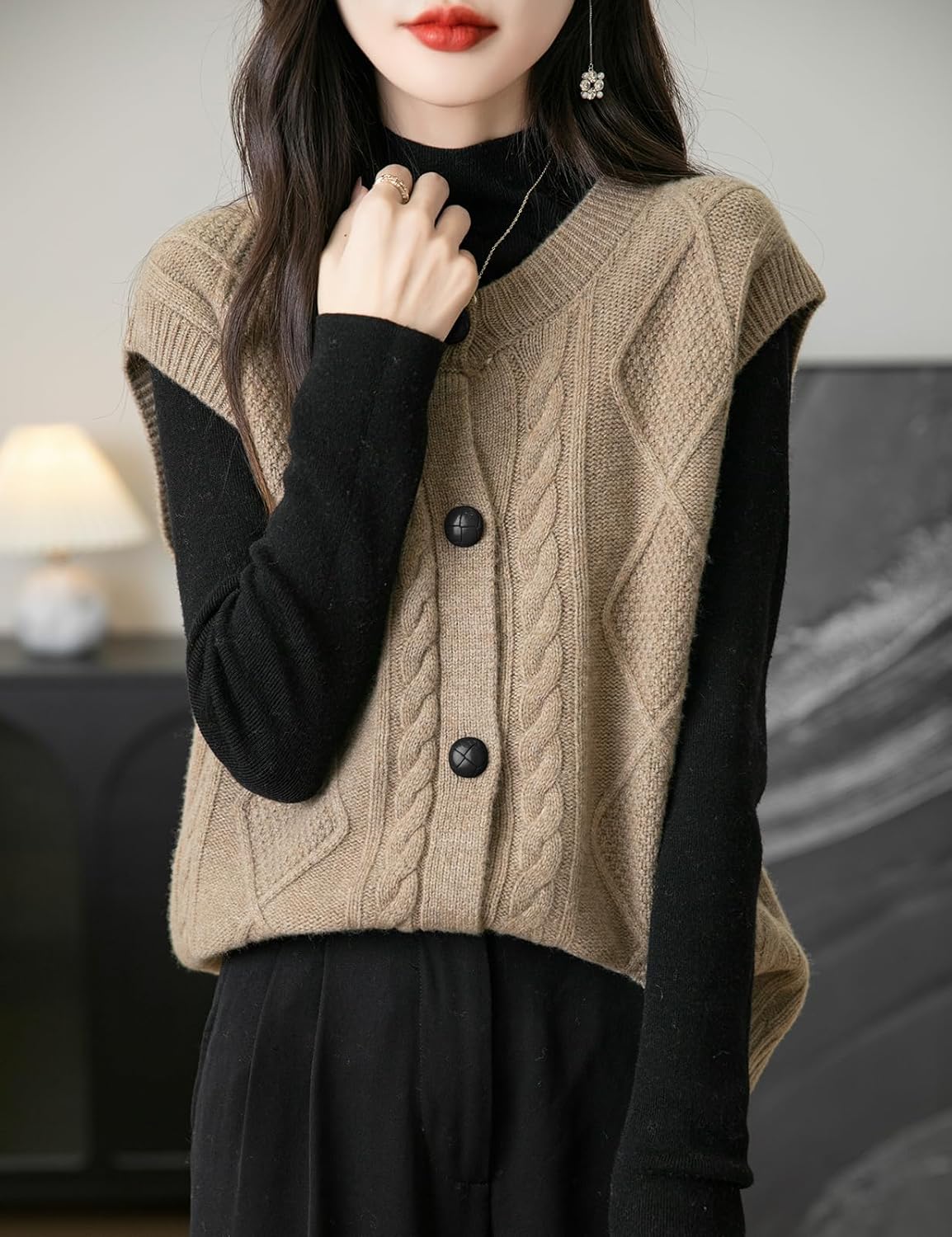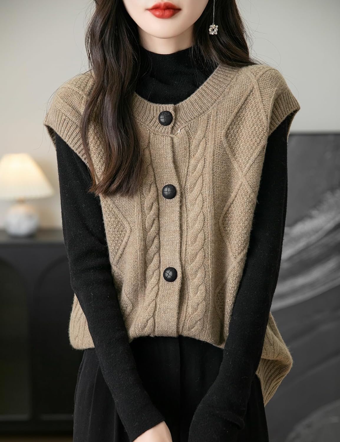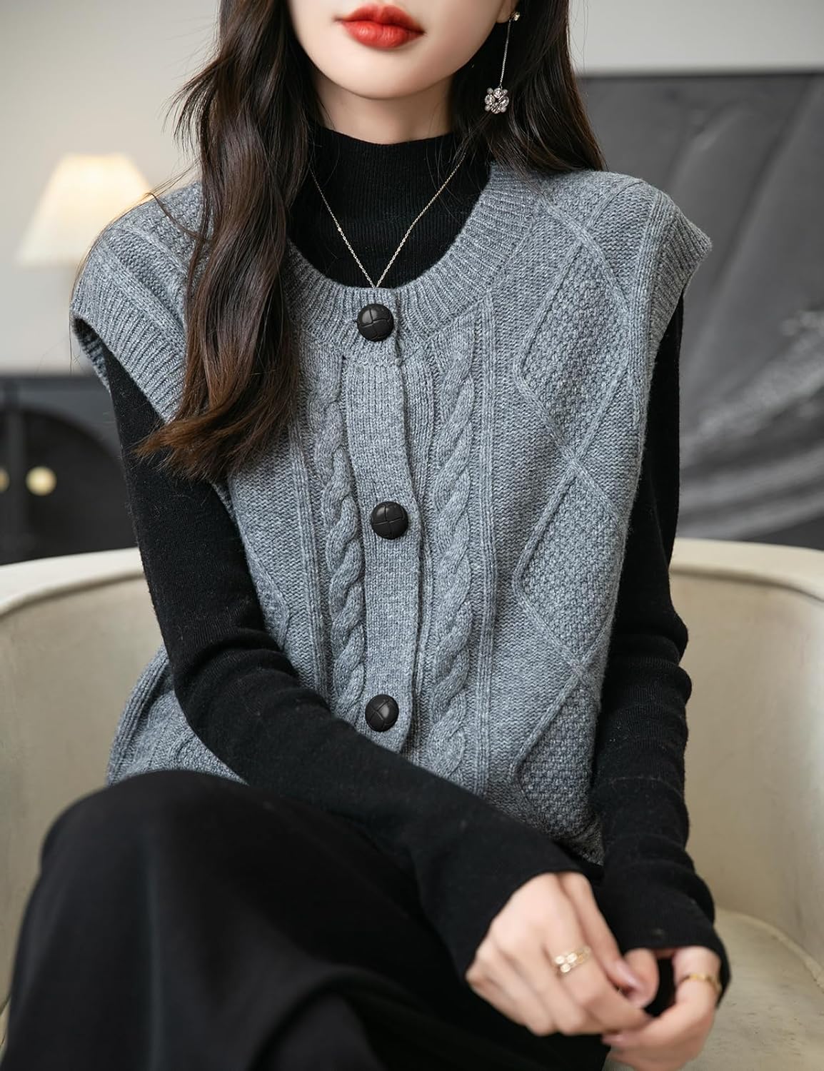 - 특징: 5게이지 고급 원단, 도톰함. 일반 핏, 솔리드 컬러, 크루넥, 슬리브리스, 클래식 케이블 스티치, 버튼다운 디자인. 높은 신축성, 캐주얼 스타일. 가볍고 따뜻하며 부드럽고 착용감이 매우 편안합니다. 이 여성용 기본 슬리브리스 스웨터 베스트는 모든 여성에게 캐주얼하면서도 트렌디한 룩을 연출하는 필수 아이템입니다.