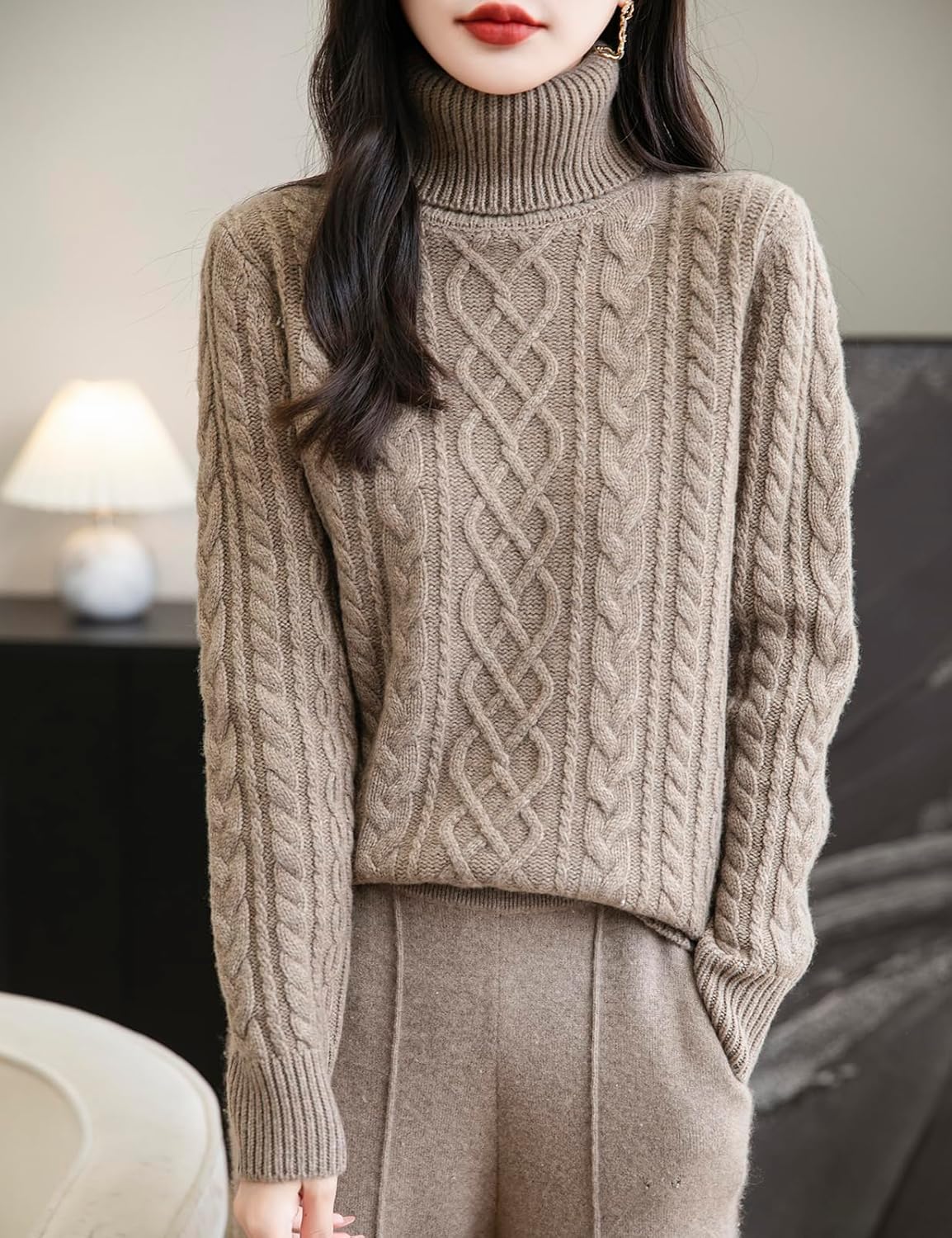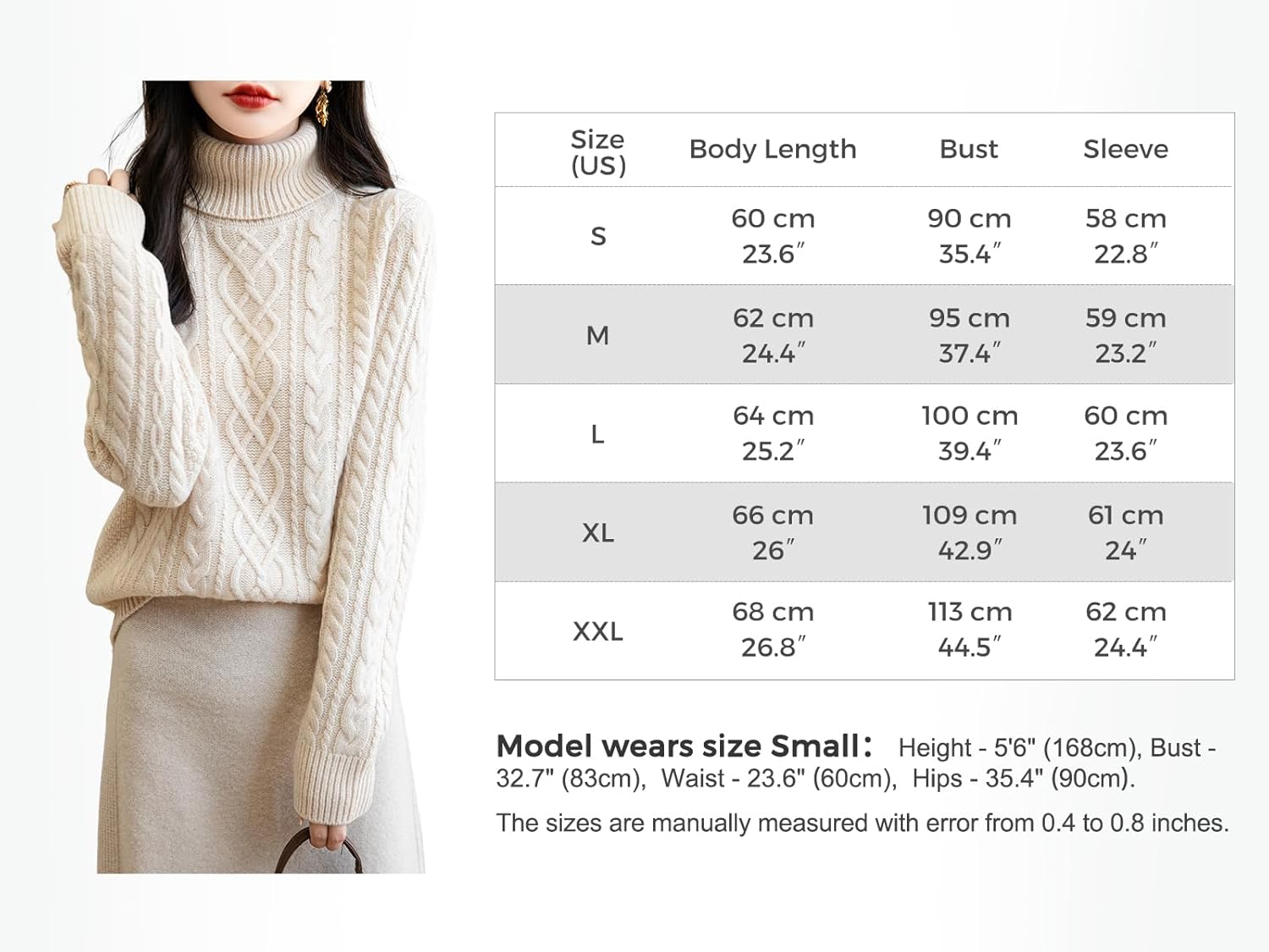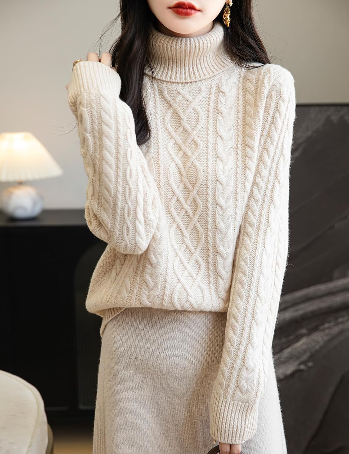 - 특징: 5게이지 고급 원단, 도톰함. 일반 핏, 단색, 터틀넥, 긴소매, 클래식 케이블 스티치 디자인, 골지 커프스. 높은 신축성, 캐주얼한 스타일. 가볍고 따뜻하며 부드러워 착용감이 매우 편안합니다. 이 메리노 울 스웨터는 독특한 질감의 패턴이 겨울 옷장에 시각적인 재미와 매력을 더합니다.