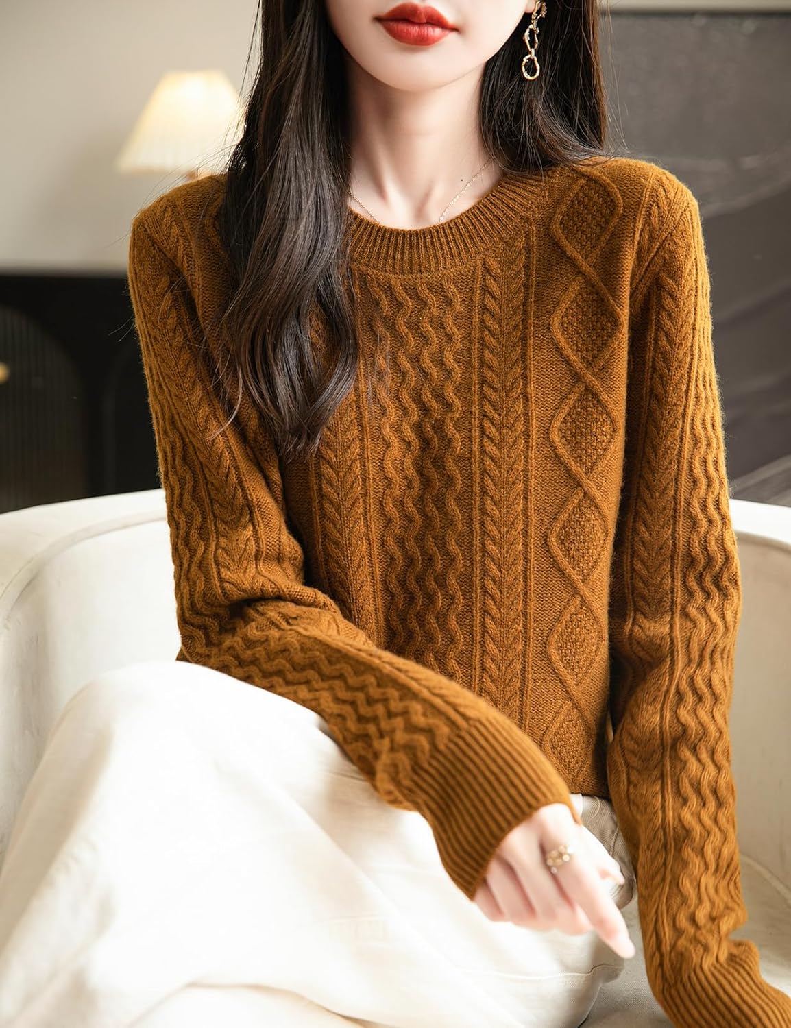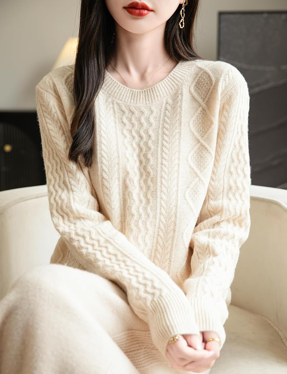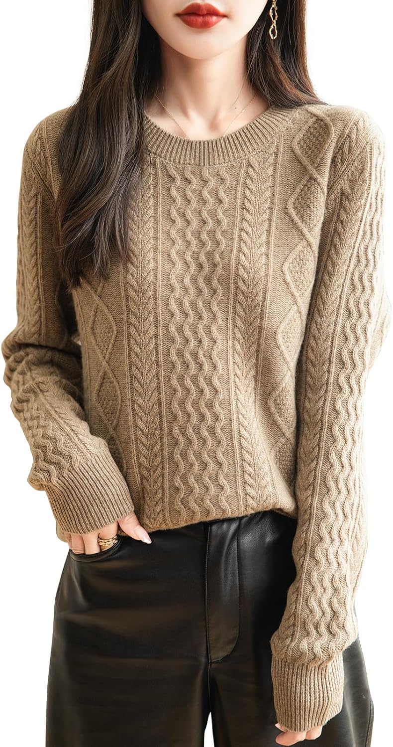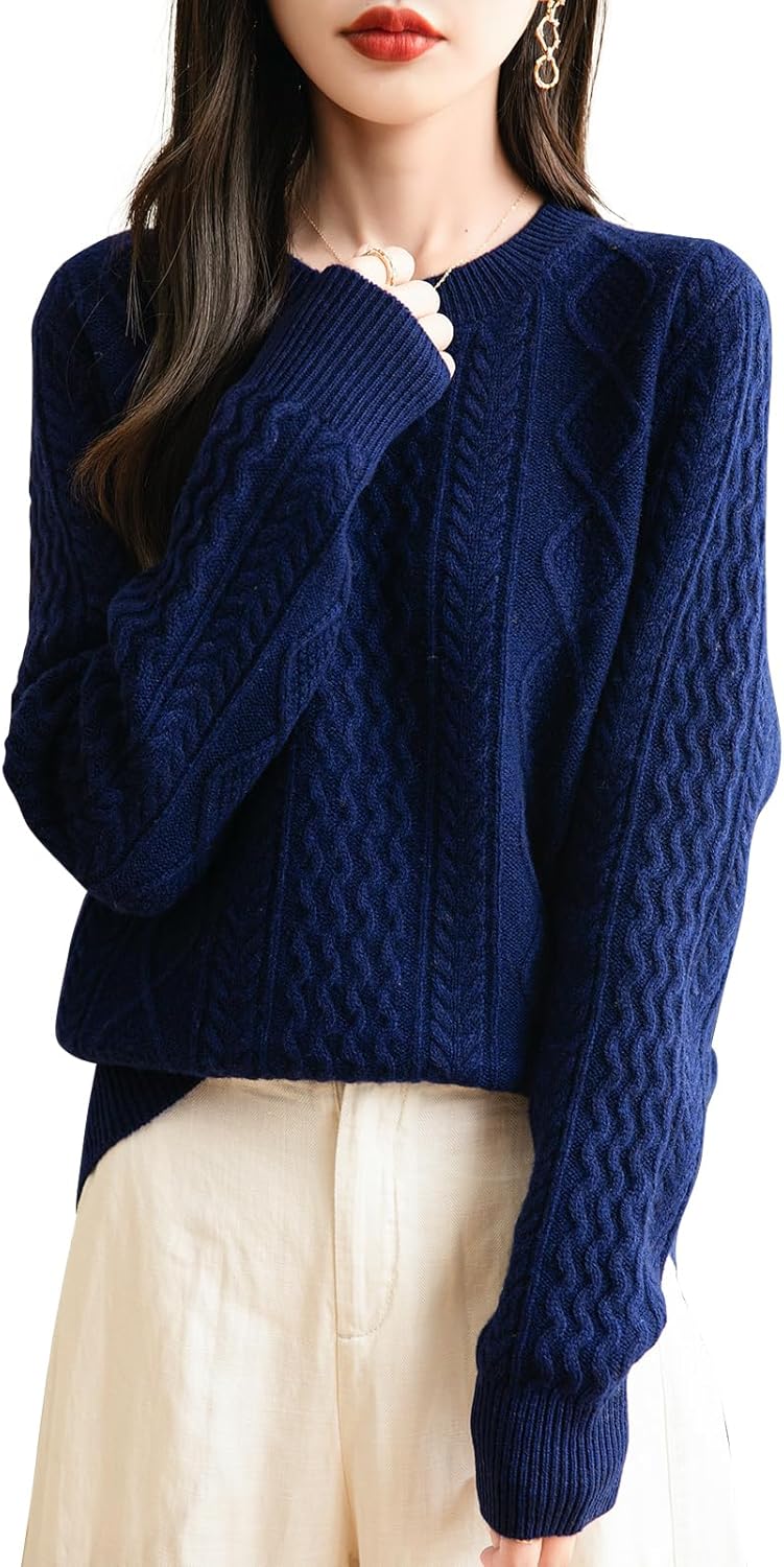 100% 메리노 울 클래식 케이블 크루넥 스웨터