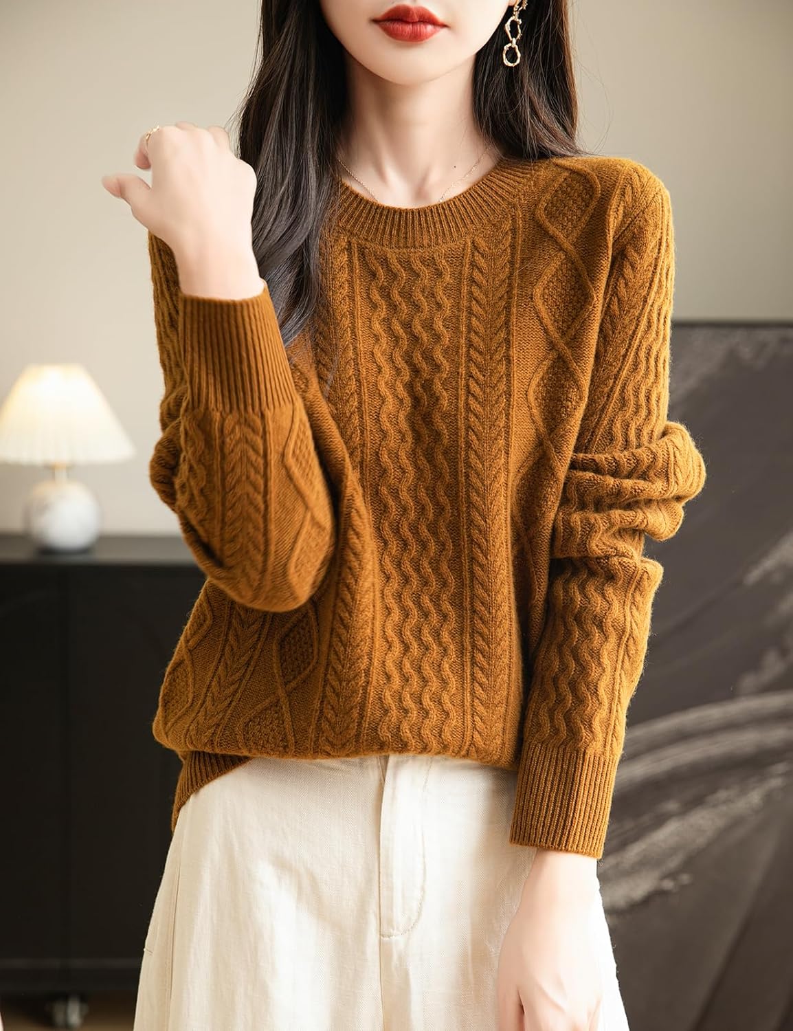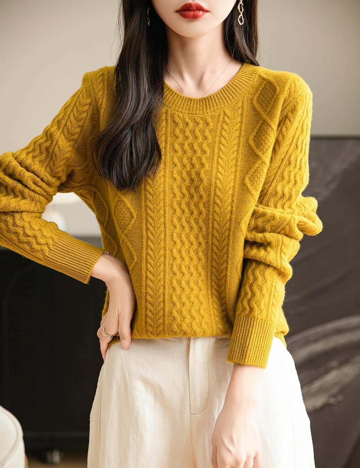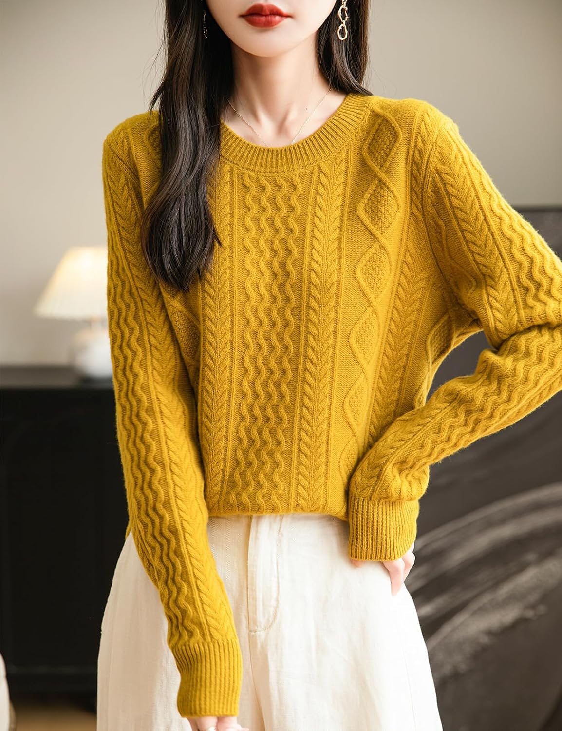 100% 메리노 울 클래식 케이블 크루넥 스웨터
