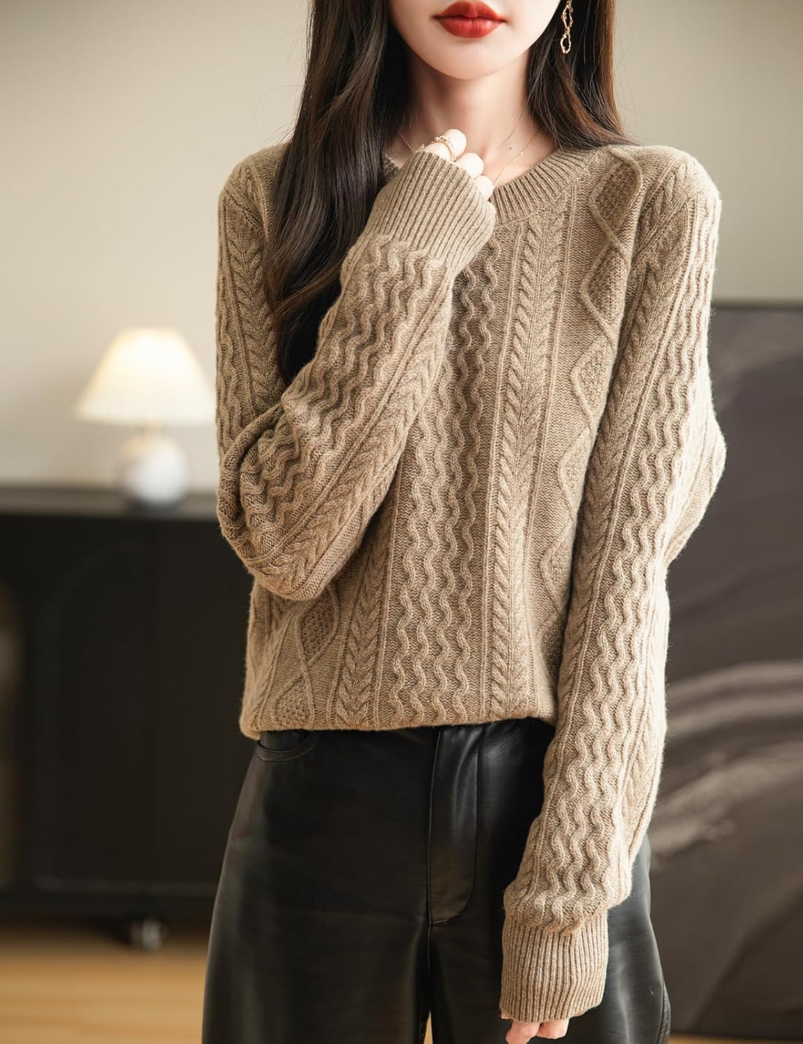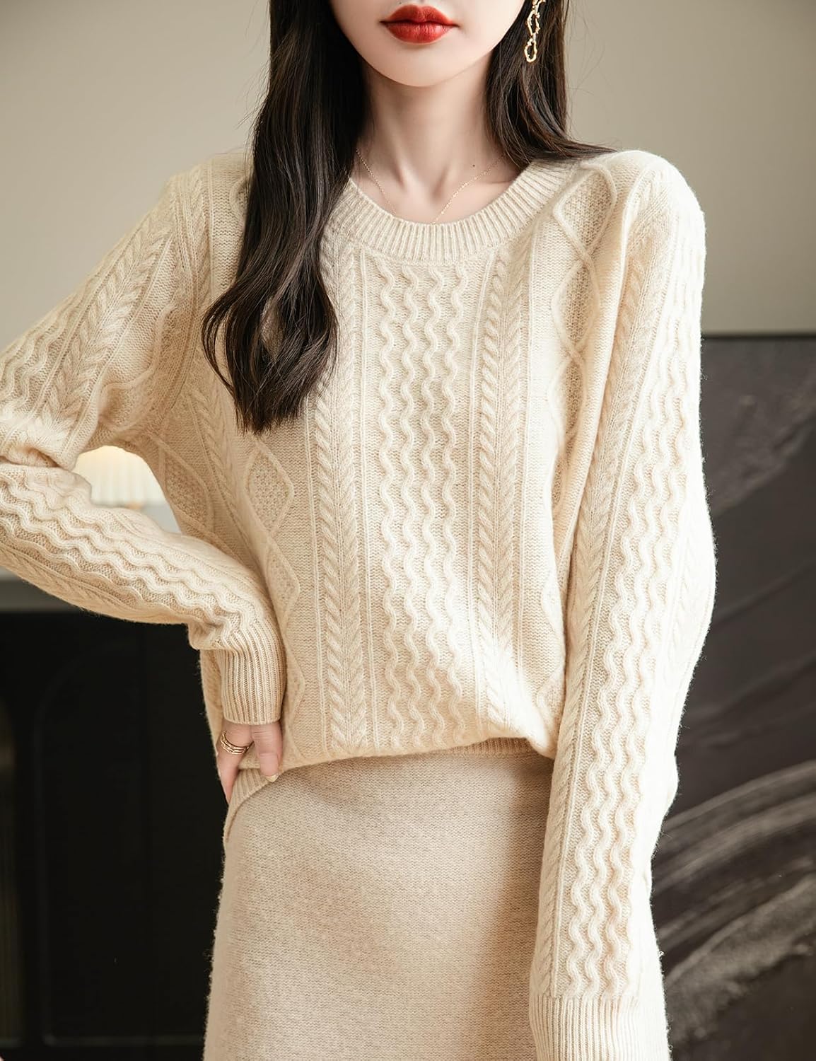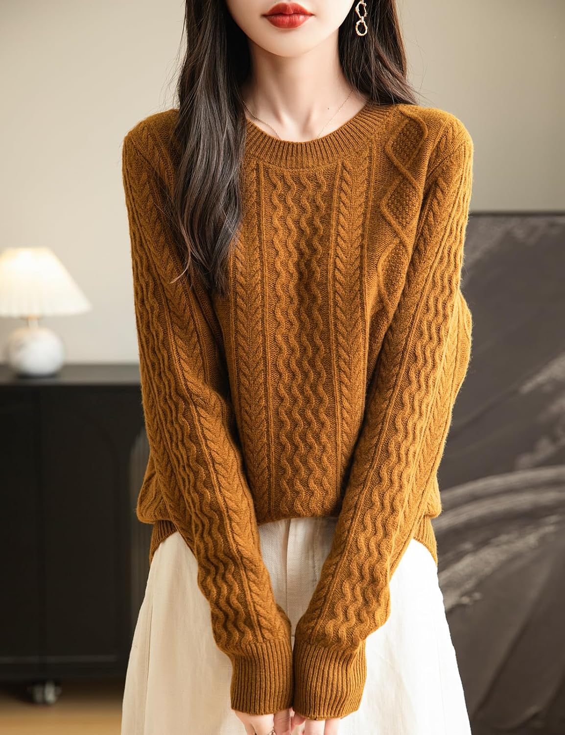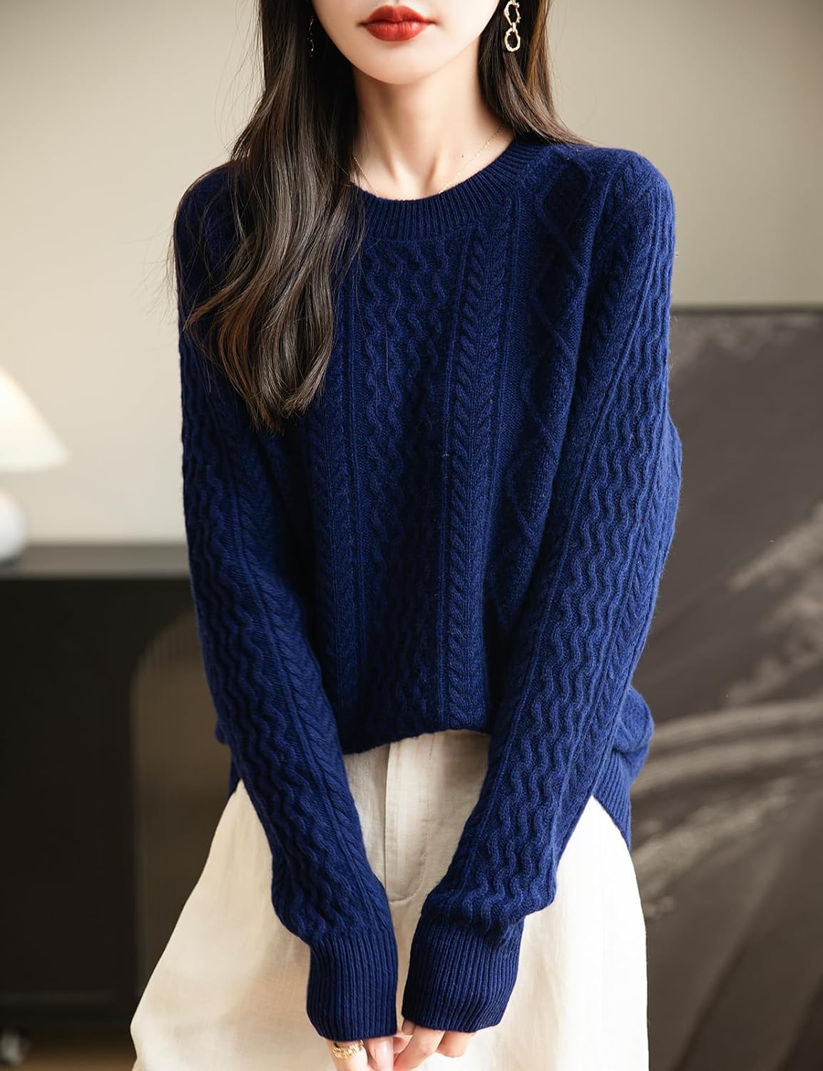 100% 메리노 울 클래식 케이블 크루넥 스웨터