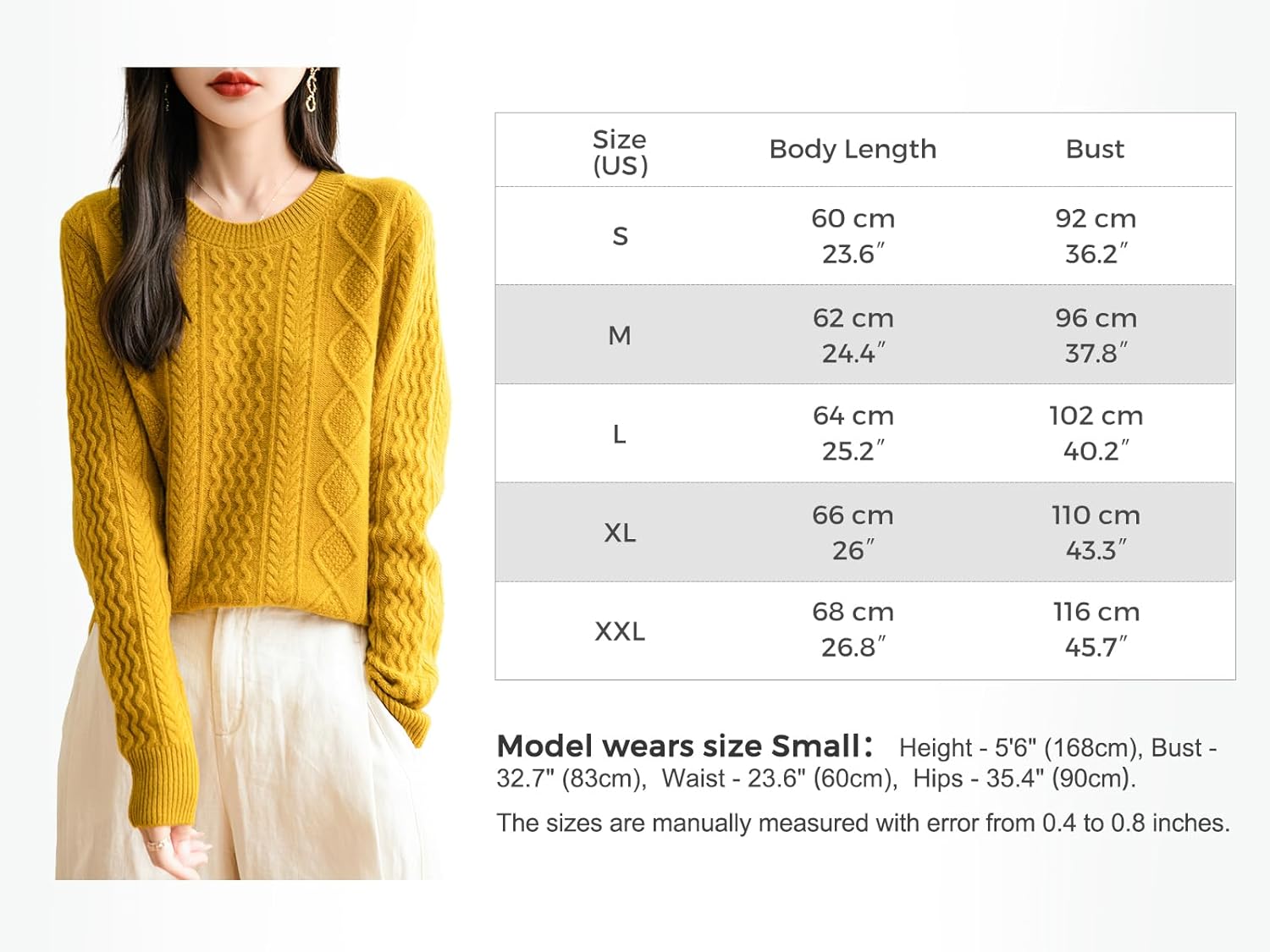 The wool is a beautiful color and really soft, not scratchy. The cables are beautiful and classic. I really wanted to keep this sweater but the fit was too far off. I have purchased other sweaters from this brand in size small and they fit fine (boxy fit, which is the current style). From the pictures and my other sweaters from this brand, I expected this one to be baggy in a "boyfriend sweater" sort of way. However, on me it was not cute and slouchy. It was fairly fitted on the sleeves and at the knitted band which was at my hips. But it was extra wide (for a small, imho) at the chest and waist. As a result, the underarms of the sweater hung 4-5 inches below mine (think flying squirrel). The extra fabric at the waist sat there and bunched up. For reference I'm 5'3" 110 lbs 34B, and other styles of this brand size S do fit me and I love them. Just not this one unfortunately.