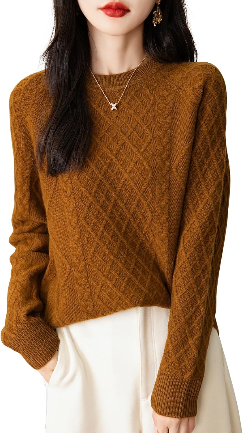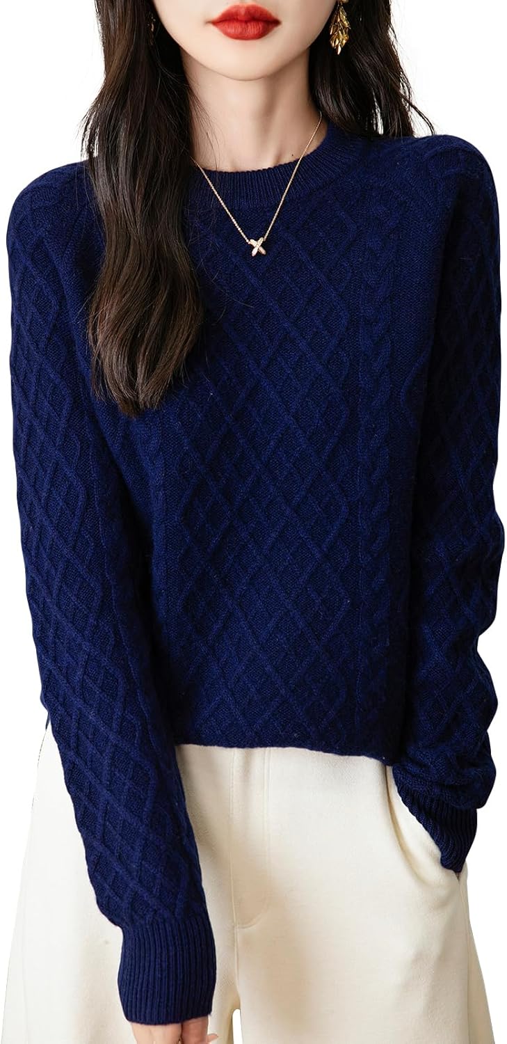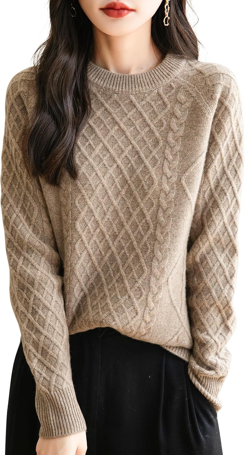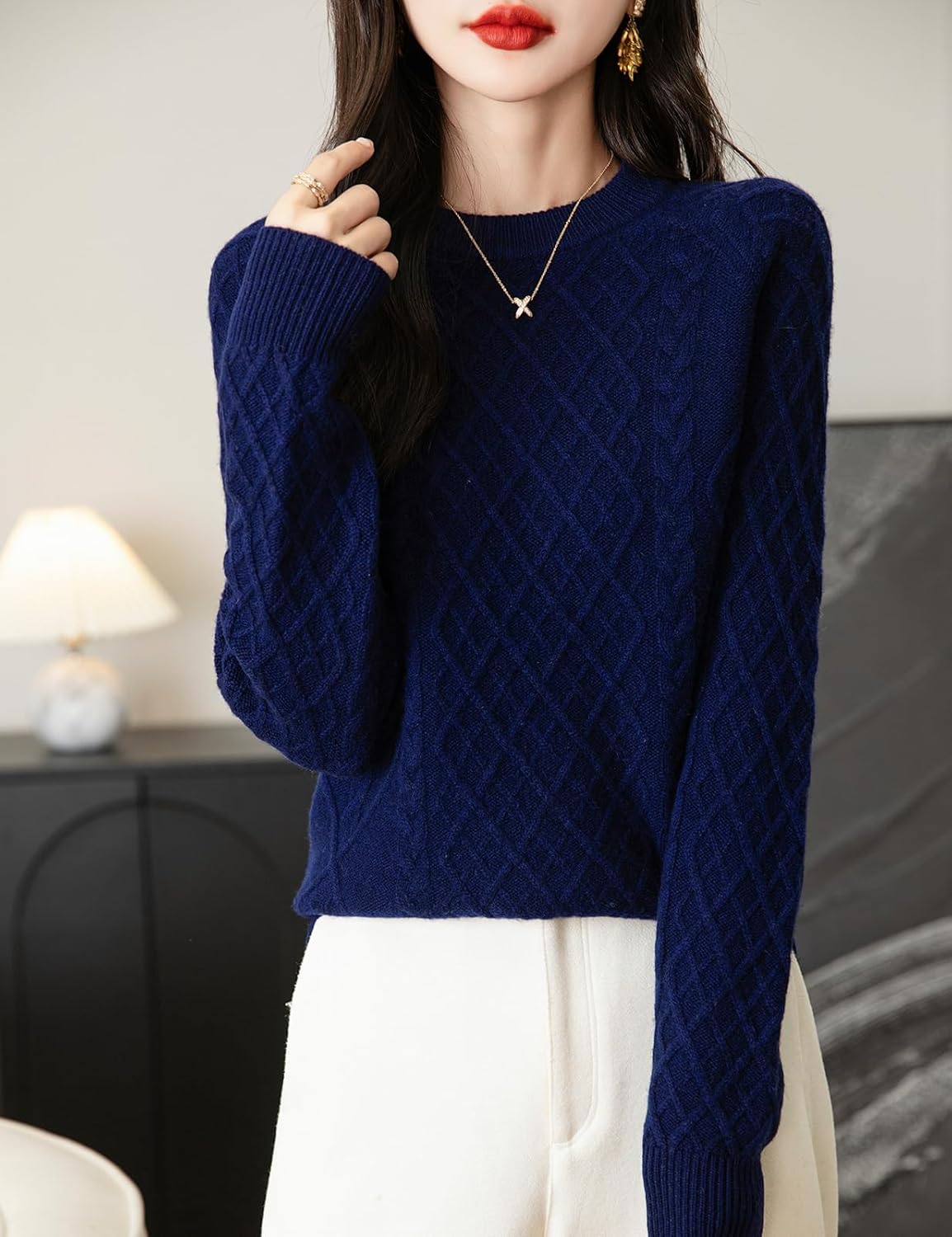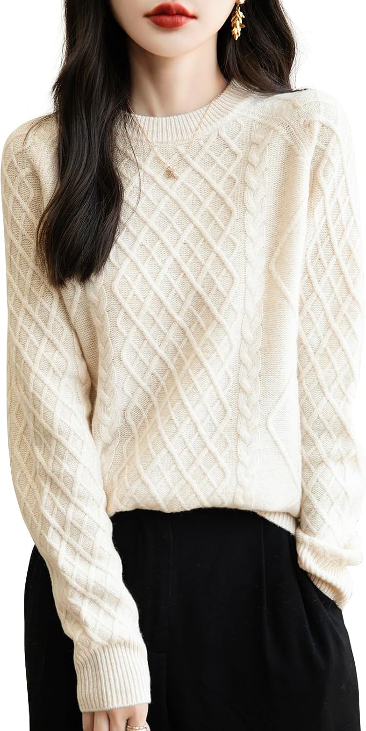 100% 메리노 울 크루넥 클래식 케이블 니트 스웨터
