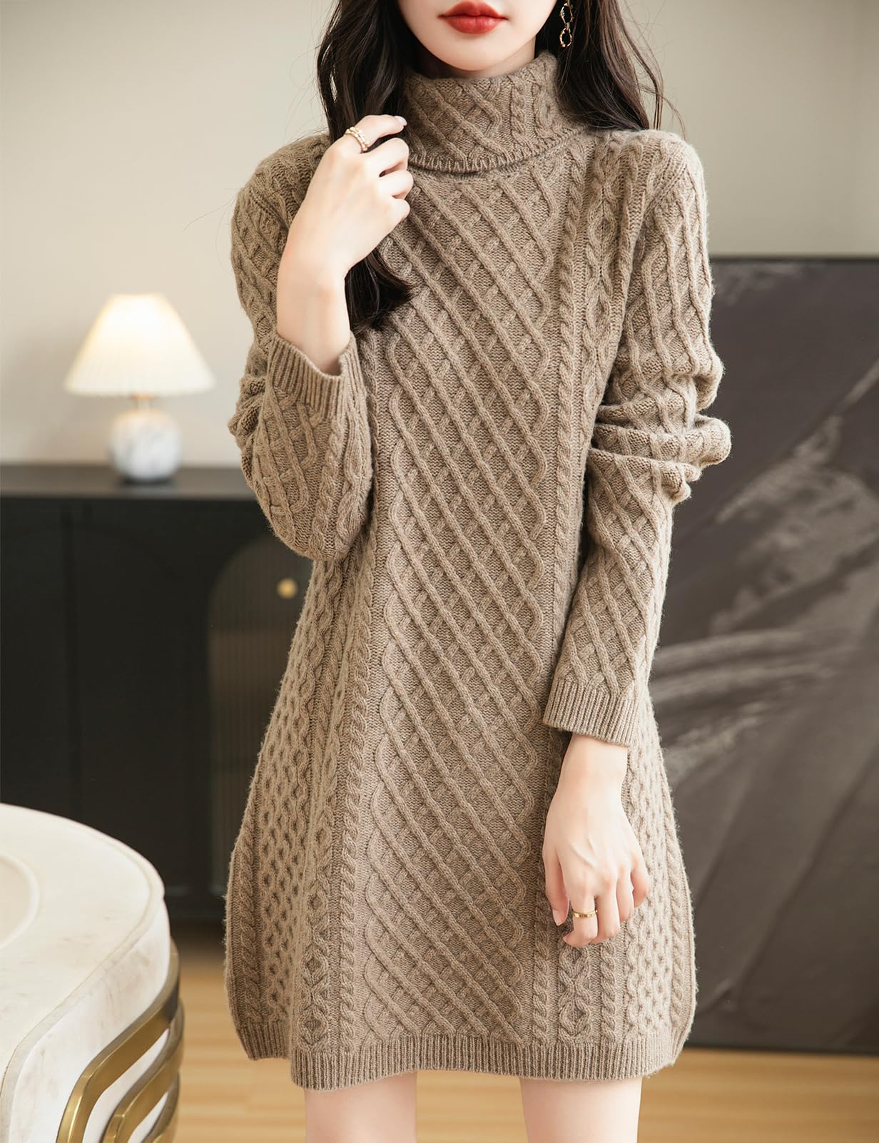- 특징: 5게이지 고급 원단, 도톰함. 일반 핏, 솔리드 컬러, 터틀넥, 긴소매, 클래식 케이블 스티치와 독특한 텍스처 패턴 디자인, 골지 커프스. 높은 신축성, 캐주얼한 스타일. 가볍고 따뜻하며 부드러워 착용감이 매우 편안합니다. 이 메리노 울 스웨터 드레스는 몸매를 완벽하게 잡아주어 어떤 활동에도 어울리는 매력적인 스타일을 완성해 줍니다.