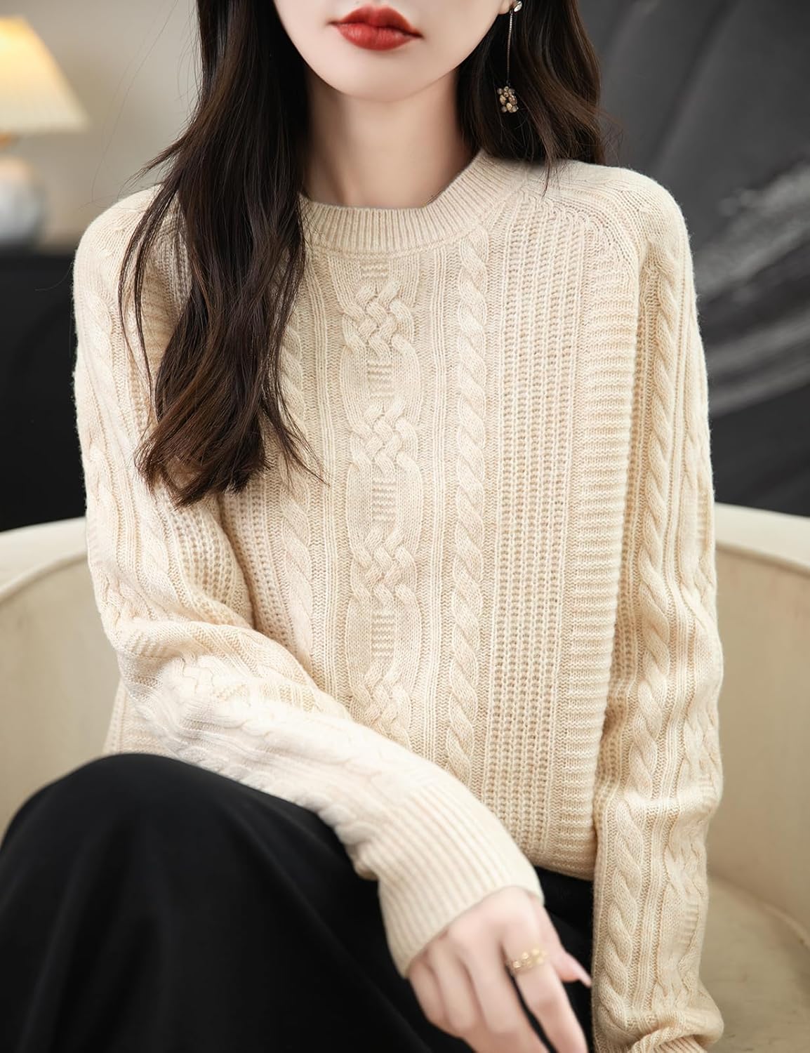 100% 메리노 울 크루넥 케이블 니트 스웨터