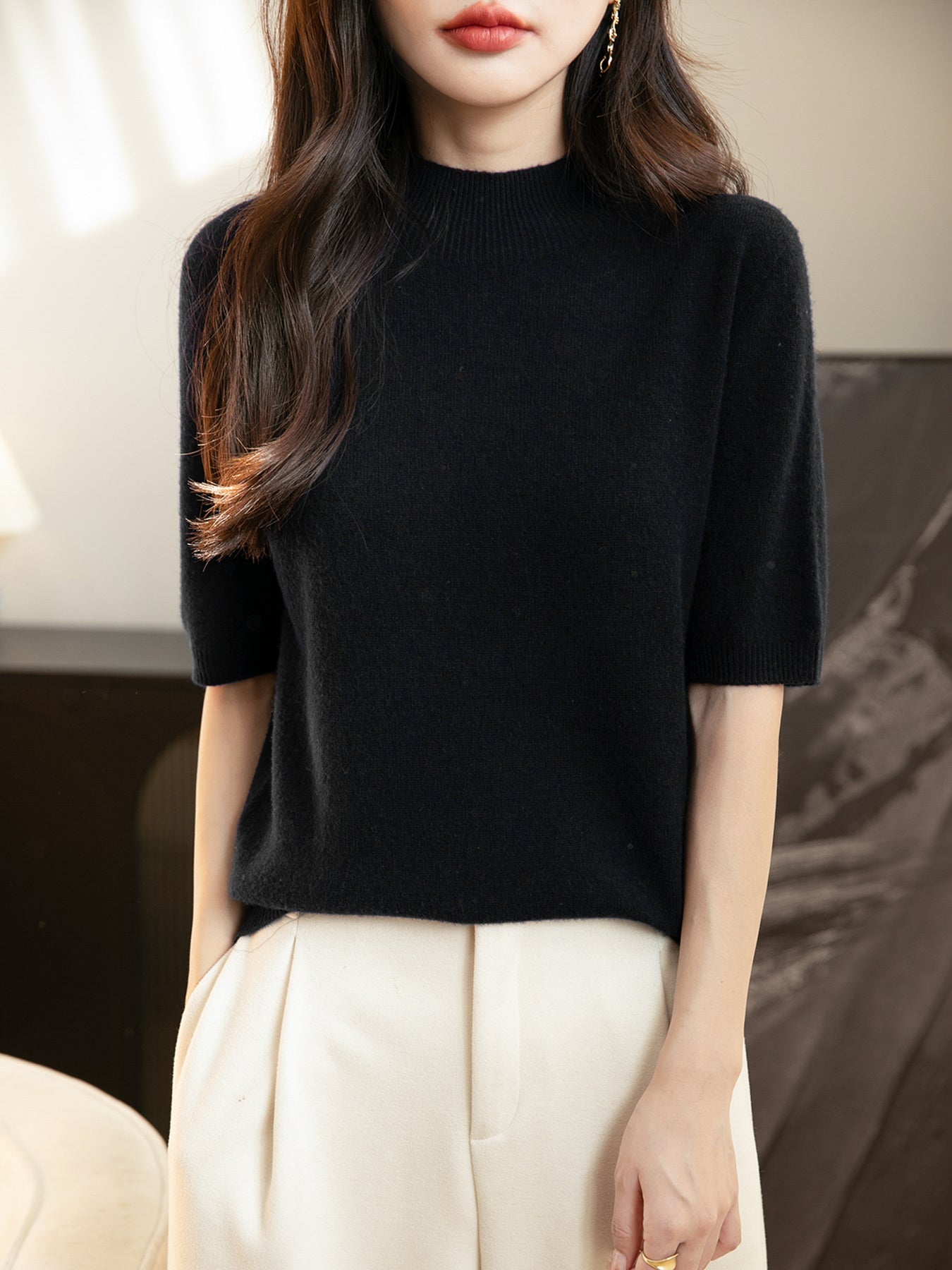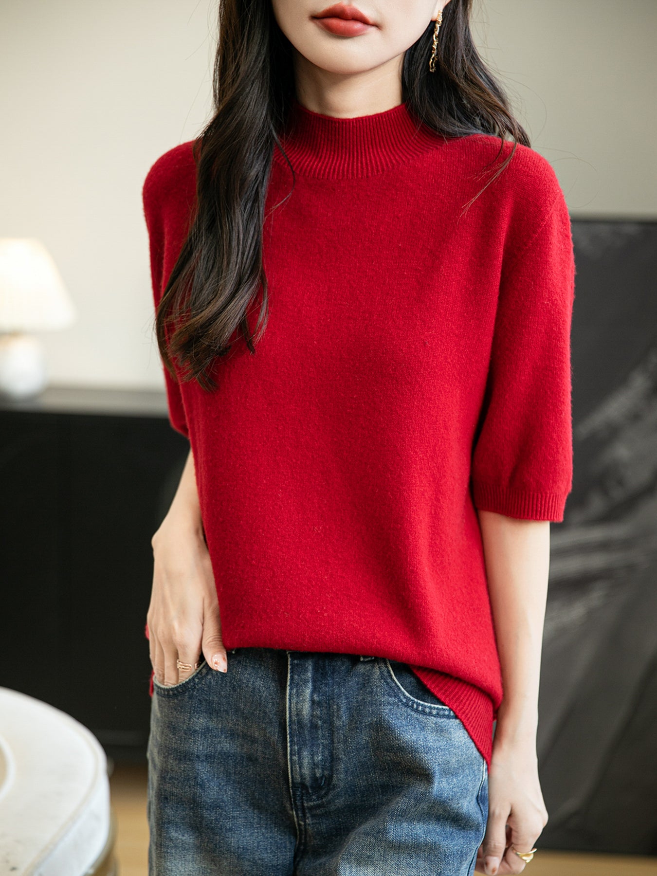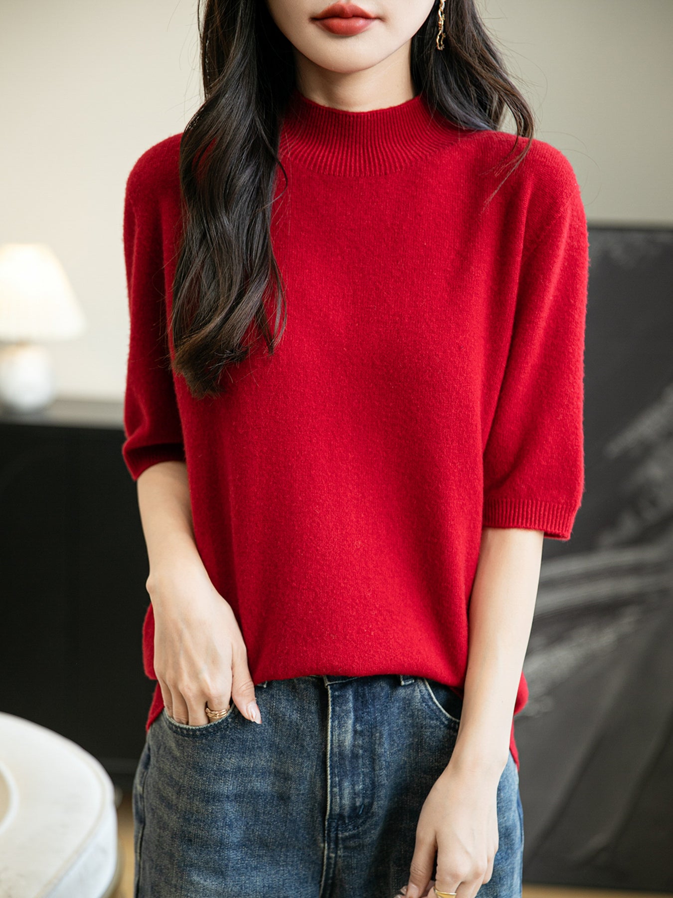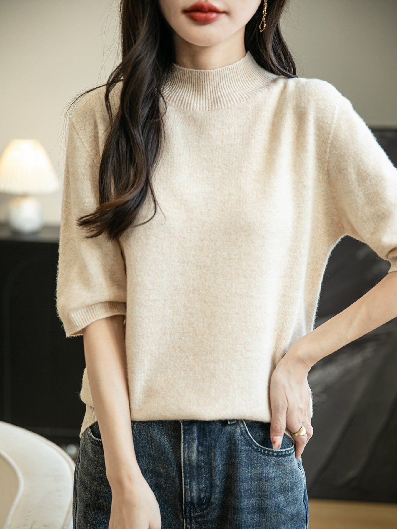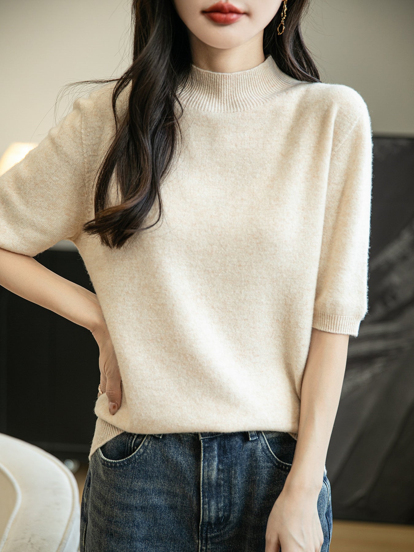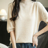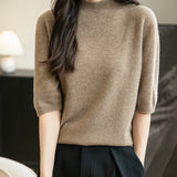 100% 메리노 울 반소매 모크넥 심리스 스웨터